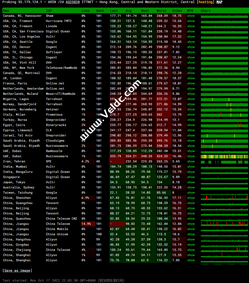 0. 221.229.173.0 Loss% Snt Last Avg Best Wrst StDev AS Name PTR 1 221.229.173.1 0.0% 20 21.8 7.1 3.3 21.8 5.6 4134 CN CHINANET-BACKBON 2 10.1.2.1 0.0% 20 0.6 2.3 0.6 30.6 6.7 - 3 ??? 100.0 20 0.0 0.0 0.0 0.0 0.0 - 4 172.20.7.57 0.0% 20 1.9 2.0 1.7 3.5 0.3 - 5 221.229.192.113 0.0% 20 6.2 6.4 6.2 9.6 0.6 4134 CN CHINANET-BACKBON 6 202.97.90.145 90.0% 20 10.6 11.3 10.6 12.1 1.0 4134 CN CHINANET-BACKBON 7 202.97.66.254 95.0% 20 13.2 13.2 13.2 13.2 0.0 4134 CN CHINANET-BACKBON 8 ??? 100.0 20 0.0 0.0 0.0 0.0 0.0 - 9 129.250.66.61 20.0% 20 108.4 106.8 102.2 109.4 1.8 2914 US NTT-LTD-2914 xe-0-4-0-3-6.r02.tokyjp05.jp... 10 129.250.3.23 10.0% 20 107.2 105.7 98.8 107.7 2.3 2914 US NTT-LTD-2914 ae-3.r30.tokyjp05.jp.bb.gin.n... 11 129.250.2.51 75.0% 20 296.8 300.2 290.7 309.7 7.1 2914 US NTT-LTD-2914 ae-2.r26.tkokhk01.hk.bb.gin.n... 12 129.250.6.98 40.0% 20 282.2 295.8 282.2 307.5 7.8 2914 US NTT-LTD-2914 ae-1.r03.tkokhk01.hk.bb.gin.n... 13 203.131.240.198 10.0% 20 208.8 206.2 201.1 208.8 1.8 2914 US NTT-LTD-2914 ce-0-5-0-3.r03.tkokhk01.hk.ce... 14 192.254.91.195 21.1% 19 221.8 220.7 217.8 222.5 1.3 21859 US ZEN-ECN 15 ??? 100.0 19 0.0 0.0 0.0 0.0 0.0 - 16 93.179.124.115 0.0% 17 73.4 74.4 69.1 76.6 2.0 25820 CA IT7NET 93.179.124.115.16clouds.com