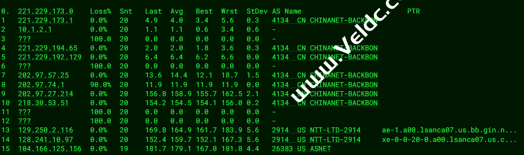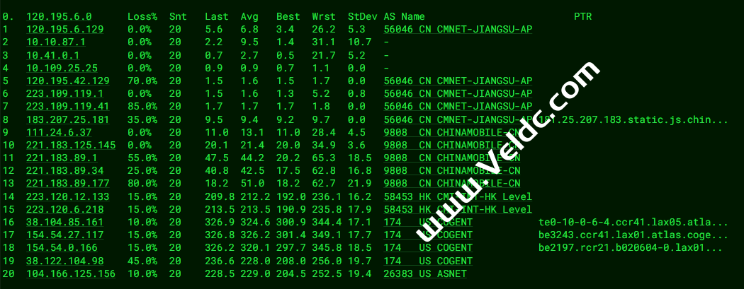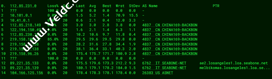 [Info] 测试路由 到 上海电信(天翼云) 中 ... traceroute to 101.227.255.45 (101.227.255.45), 30 hops max, 32 byte packets 1 95.174.71.81 0.27 ms AS8849 United States, California, Los Angeles, edis.at 2 lag-107.ear2.LosAngeles1.Level3.net (4.59.50.137) 1.13 ms AS3356 United States, California, Los Angeles, level3.com 3 * 4 4.15.125.54 12.90 ms AS3356 United States, California, San Jose, level3.com 5 * 6 202.97.12.189 171.65 ms AS4134 China, Shanghai, ChinaTelecom 7 * 8 61.152.24.125 189.86 ms AS4812 China, Shanghai, ChinaTelecom 9 * 10 * 11 * 12 * 13 * 14 * 15 * 16 * 17 * 18 * 19 * 20 * 21 * 22 * 23 * 24 * 25 * 26 * 27 * 28 * 29 * 30 * [Info] 测试路由 到 上海电信(天翼云) 完成 ! [Info] 测试路由 到 厦门电信CN2 中 ... traceroute to 117.28.254.129 (117.28.254.129), 30 hops max, 32 byte packets 1 95.174.71.81 0.39 ms AS8849 United States, California, Los Angeles, edis.at 2 telstra.as4637.any2ix.coresite.com (206.72.210.65) 0.92 ms AS3491,AS9009,AS17639 United States, California, Los Angeles, coresite.com 3 i-93.1wlt-core02.telstraglobal.net (202.84.253.85) 2.52 ms AS4637 United States, California, Los Angeles, telstra.com 4 i-93.1wlt-core02.telstraglobal.net (202.84.253.85) 193.44 ms AS4637 United States, California, Los Angeles, telstra.com 5 * 6 i-93.istt04.telstraglobal.net (202.84.224.190) 176.69 ms AS4637 Singapore, telstra.com 7 unknown.telstraglobal.net (210.57.38.58) 198.44 ms AS4637 Singapore, telstra.com 8 59.43.184.121 197.67 ms * China, Guangdong, Guangzhou, ChinaTelecom 9 * 10 59.43.16.181 200.22 ms * China, Guangdong, Guangzhou, ChinaTelecom 11 59.43.46.214 214.18 ms * China, Fujian, ChinaTelecom 12 * 13 27.159.81.214 212.17 ms AS133775 China, Fujian, Xiamen, ChinaTelecom 14 * 15 * 16 117.28.254.129 215.31 ms AS4809 China, Fujian, Xiamen, ChinaTelecom [Info] 测试路由 到 厦门电信CN2 完成 ! [Info] 测试路由 到 浙江杭州联通 中 ... traceroute to 101.71.241.238 (101.71.241.238), 30 hops max, 32 byte packets 1 95.174.71.81 0.31 ms AS8849 United States, California, Los Angeles, edis.at 2 76.74.24.93 0.35 ms AS3257 United States, California, Los Angeles, gtt.net 3 ae28.cr2-sjc1.ip4.gtt.net (89.149.136.149) 7.72 ms AS3257 United States, California, San Jose, gtt.net 4 as4837.sjc10.ip4.gtt.net (173.205.56.142) 153.78 ms AS3257 United States, California, San Jose, gtt.net 5 219.158.98.173 182.50 ms AS4837 China, Shanghai, ChinaUnicom 6 219.158.113.138 183.22 ms AS4837 China, Shanghai, ChinaUnicom 7 219.158.113.101 181.14 ms AS4837 China, Shanghai, ChinaUnicom 8 219.158.15.206 187.99 ms AS4837 China, Zhejiang, Hangzhou, ChinaUnicom 9 * 10 * 11 * 12 * 13 * 14 * 15 * 16 * 17 * 18 * 19 * 20 * 21 * 22 * 23 * 24 * 25 * 26 * 27 * 28 * 29 * 30 * [Info] 测试路由 到 浙江杭州联通 完成 ! [Info] 测试路由 到 浙江杭州移动 中 ... traceroute to 112.17.0.106 (112.17.0.106), 30 hops max, 32 byte packets 1 95.174.71.81 2.40 ms AS8849 United States, California, Los Angeles, edis.at 2 lag-107.ear2.LosAngeles1.Level3.net (4.59.50.137) 0.57 ms AS3356 United States, California, Los Angeles, level3.com 3 4.69.219.206 24.67 ms AS3356 United States, Washington, Seattle, level3.com 4 ChinaMobile-level3-Seattle1.Level3.net (4.68.39.222) 28.46 ms AS3356 United States, Washington, Seattle, level3.com 5 223.120.6.53 28.52 ms AS58453 United States, Washington, Seattle, ChinaMobile 6 223.120.7.70 31.07 ms AS58453 United States, ChinaMobile 7 223.120.12.170 188.55 ms AS58453 China, Shanghai, ChinaMobile 8 221.183.89.182 190.72 ms AS9808 China, Shanghai, ChinaMobile 9 221.183.89.69 190.40 ms AS9808 China, Shanghai, ChinaMobile 10 221.183.89.50 198.75 ms AS9808 China, Shanghai, ChinaMobile 11 221.183.40.150 201.15 ms AS9808 China, Zhejiang, Hangzhou, ChinaMobile 12 * 13 * 14 * 15 * 16 * 17 * 18 * 19 * 20 * 21 * 22 * 23 * 24 * 25 * 26 * 27 * 28 * 29 * 30 * [Info] 测试路由 到 浙江杭州移动 完成 ! [Info] 测试路由 到 北京教育网 中 ... traceroute to 202.205.6.30 (202.205.6.30), 30 hops max, 32 byte packets 1 95.174.71.81 1.72 ms AS8849 United States, California, Los Angeles, edis.at 2 207.45.216.18 0.85 ms AS6453 United States, California, Los Angeles, tatacommunications.com 3 if-ae-23-2.tcore1.lvw-losangeles.as6453.net (64.86.197.240) 0.46 ms AS6453 United States, California, Los Angeles, tatacommunications.com 4 66.110.59.182 175.65 ms AS6453 United States, California, Los Angeles, tatacommunications.com 5 101.4.117.213 202.50 ms AS4538 China, Beijing, CHINAEDU 6 * 7 101.4.118.213 169.09 ms AS4538 China, Beijing, CHINAEDU 8 * 9 219.224.102.230 180.43 ms AS4538 China, Beijing, CHINAEDU 10 * 11 * 12 101.4.130.54 187.44 ms AS4538 China, Beijing, CHINAEDU 13 * 14 * 15 * 16 * 17 * 18 * 19 * 20 * 21 * 22 * 23 * 24 * 25 * 26 101.4.130.54 169.60 ms AS4538 China, Beijing, CHINAEDU 27 * 28 * 29 * 30 * [Info] 测试路由 到 北京教育网 完成 ! [Info] 四网路由快速测试 已完成 !