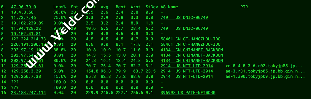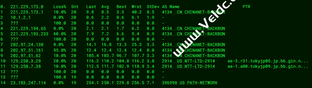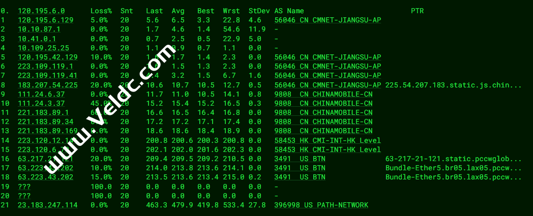 [Info] 测试路由 到 上海电信(天翼云) 中 ... traceroute to 101.227.255.45 (101.227.255.45), 30 hops max, 32 byte packets 1 23.183.247.97 0.21 ms AS396998 Europe Regions, path.net 2 62.6.46.32 1.50 ms AS2856 United Kingdom, bt.com 3 209.237.140.50 4.40 ms AS396998 United Kingdom, London, path.net 4 ae-1.r04.londen05.uk.bb.gin.ntt.net (129.250.4.141) 5.24 ms AS2914 United Kingdom, London, ntt.com 5 202.97.52.49 5.57 ms AS4134 United Kingdom, London, ChinaTelecom 6 ae-1.r04.londen05.uk.bb.gin.ntt.net (129.250.4.141) 5.33 ms AS2914 United Kingdom, London, ntt.com 7 202.97.52.49 6.63 ms AS4134 United Kingdom, London, ChinaTelecom 8 * 9 * 10 202.97.71.33 246.71 ms AS4134 China, Shanghai, ChinaTelecom 11 61.152.25.209 249.34 ms AS4812 China, Shanghai, ChinaTelecom 12 124.74.166.10 240.71 ms AS4812 China, Shanghai, ChinaTelecom 13 * 14 * 15 * 16 * 17 * 18 * 19 * 20 * 21 * 22 * 23 * 24 * 25 * 26 * 27 * 28 * 29 * 30 * [Info] 测试路由 到 上海电信(天翼云) 完成 ! [Info] 测试路由 到 厦门电信CN2 中 ... traceroute to 117.28.254.129 (117.28.254.129), 30 hops max, 32 byte packets 1 23.183.247.97 0.84 ms AS396998 Europe Regions, path.net 2 62.6.46.32 0.77 ms AS2856 United Kingdom, bt.com 3 209.237.140.50 4.40 ms AS396998 United Kingdom, London, path.net 4 59.43.250.21 274.93 ms * China, Shanghai, ChinaTelecom 5 * 6 59.43.250.21 275.49 ms * China, Shanghai, ChinaTelecom 7 59.43.246.253 275.62 ms * China, Shanghai, ChinaTelecom 8 59.43.138.53 288.98 ms * China, Shanghai, ChinaTelecom 9 59.43.138.186 279.38 ms * China, Fujian, ChinaTelecom 10 * 11 27.148.195.90 294.47 ms AS133775 China, Fujian, Xiamen, ChinaTelecom 12 * 13 * 14 117.28.254.129 284.87 ms AS4809 China, Fujian, Xiamen, ChinaTelecom [Info] 测试路由 到 厦门电信CN2 完成 ! [Info] 测试路由 到 浙江杭州联通 中 ... traceroute to 101.71.241.238 (101.71.241.238), 30 hops max, 32 byte packets 1 23.183.247.97 0.31 ms AS396998 Europe Regions, path.net 2 62.6.46.32 0.77 ms AS2856 United Kingdom, bt.com 3 209.237.140.50 4.18 ms AS396998 United Kingdom, London, path.net 4 prs-bb1-link.ip.twelve99.net (62.115.135.25) 17.55 ms AS1299 France, Ile-de-France, Paris, telia.com 5 ffm-bb1-link.ip.twelve99.net (62.115.123.12) 17.65 ms AS1299 Germany, Hesse, Frankfurt, telia.com 6 prs-bb1-link.ip.twelve99.net (62.115.135.25) 16.95 ms AS1299 France, Ile-de-France, Paris, telia.com 7 ffm-bb1-link.ip.twelve99.net (62.115.123.12) 18.18 ms AS1299 Germany, Hesse, Frankfurt, telia.com 8 ffm-b5-link.ip.twelve99.net (62.115.114.89) 19.23 ms AS1299 Germany, Hesse, Frankfurt, telia.com 9 219.158.43.21 169.59 ms AS4837 China, Shanghai, ChinaUnicom 10 219.158.24.213 196.46 ms AS4837 China, Beijing, ChinaUnicom 11 219.158.3.29 194.46 ms AS4837 China, Beijing, ChinaUnicom 12 * 13 219.158.99.6 275.39 ms AS4837 China, Zhejiang, Hangzhou, ChinaUnicom 14 * 15 * 16 * 17 * 18 * 19 * 20 * 21 * 22 * 23 * 24 * 25 * 26 * 27 * 28 * 29 * 30 * [Info] 测试路由 到 浙江杭州联通 完成 ! [Info] 测试路由 到 浙江杭州移动 中 ... traceroute to 112.17.0.106 (112.17.0.106), 30 hops max, 32 byte packets 1 23.183.247.97 0.86 ms AS396998 Europe Regions, path.net 2 62.6.46.32 0.97 ms AS2856 United Kingdom, bt.com 3 209.237.140.50 4.98 ms AS396998 United Kingdom, London, path.net 4 slou-b2-link.ip.twelve99.net (62.115.112.63) 4.88 ms AS1299 United Kingdom, Berkshire County, Slough, telia.com 5 chinamobile-ic342125-slou-b1.ip.twelve99-cust.net (62.115.171.223) 172.90 ms AS1299 United Kingdom, Berkshire County, Slough, telia.com 6 slou-b2-link.ip.twelve99.net (62.115.112.63) 5.26 ms AS1299 United Kingdom, Berkshire County, Slough, telia.com 7 chinamobile-ic342125-slou-b1.ip.twelve99-cust.net (62.115.171.223) 172.94 ms AS1299 United Kingdom, Berkshire County, Slough, telia.com 8 223.120.10.201 234.80 ms AS58453 United Kingdom, London, ChinaMobile 9 223.120.15.78 370.94 ms AS58453 China, Shanghai, ChinaMobile 10 221.183.89.178 380.74 ms AS9808 China, Shanghai, ChinaMobile 11 221.183.89.33 362.25 ms AS9808 China, Shanghai, ChinaMobile 12 * 13 * 14 * 15 * 16 * 17 * 18 * 19 * 20 * 21 * 22 * 23 * 24 * 25 * 26 * 27 * 28 * 29 * 30 * [Info] 测试路由 到 浙江杭州移动 完成 ! [Info] 测试路由 到 北京教育网 中 ... traceroute to 202.205.6.30 (202.205.6.30), 30 hops max, 32 byte packets 1 23.183.247.97 0.85 ms AS396998 Europe Regions, path.net 2 62.6.46.32 1.49 ms AS2856 United Kingdom, bt.com 3 209.237.140.50 4.68 ms AS396998 United Kingdom, London, path.net 4 ae-11.r20.amstnl07.nl.bb.gin.ntt.net (129.250.5.2) 9.64 ms AS2914 Netherlands, North Holland, Amsterdam, ntt.com 5 ae-4.r21.vienat02.at.bb.gin.ntt.net (129.250.7.28) 29.86 ms AS2914 Austria, Vienna, ntt.com 6 ae-11.r20.amstnl07.nl.bb.gin.ntt.net (129.250.5.2) 10.71 ms AS2914 Netherlands, North Holland, Amsterdam, ntt.com 7 ae-4.r21.vienat02.at.bb.gin.ntt.net (129.250.7.28) 28.86 ms AS2914 Austria, Vienna, ntt.com 8 * 9 * 10 ae-10.r27.tkokhk01.hk.bb.gin.ntt.net (129.250.7.67) 220.06 ms AS2914 China, Hong Kong, ntt.com 11 ae-1.a01.chwahk02.hk.bb.gin.ntt.net (129.250.5.161) 223.23 ms AS2914 China, Hong Kong, ntt.com 12 203.131.254.214 249.43 ms AS2914 China, Hong Kong, ntt.com 13 101.4.114.181 295.09 ms AS4538 China, Beijing, CHINAEDU 14 * 15 * 16 101.4.118.213 284.59 ms AS4538 China, Beijing, CHINAEDU 17 101.4.113.110 291.20 ms AS4538 China, Beijing, CHINAEDU 18 219.224.102.230 288.27 ms AS4538 China, Beijing, CHINAEDU 19 * 20 * 21 101.4.130.54 285.89 ms AS4538 China, Beijing, CHINAEDU 22 * 23 101.4.130.54 289.14 ms AS4538 China, Beijing, CHINAEDU 24 * 25 * 26 * 27 101.4.130.54 295.09 ms AS4538 China, Beijing, CHINAEDU 28 * 29 * 30 * [Info] 测试路由 到 北京教育网 完成 ! [Info] 四网路由快速测试 已完成 !
