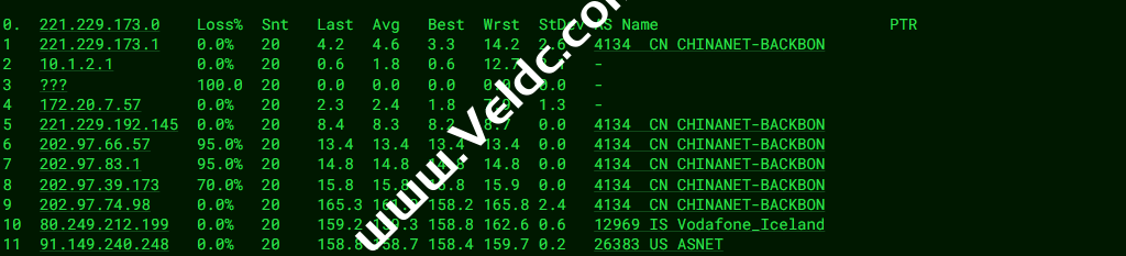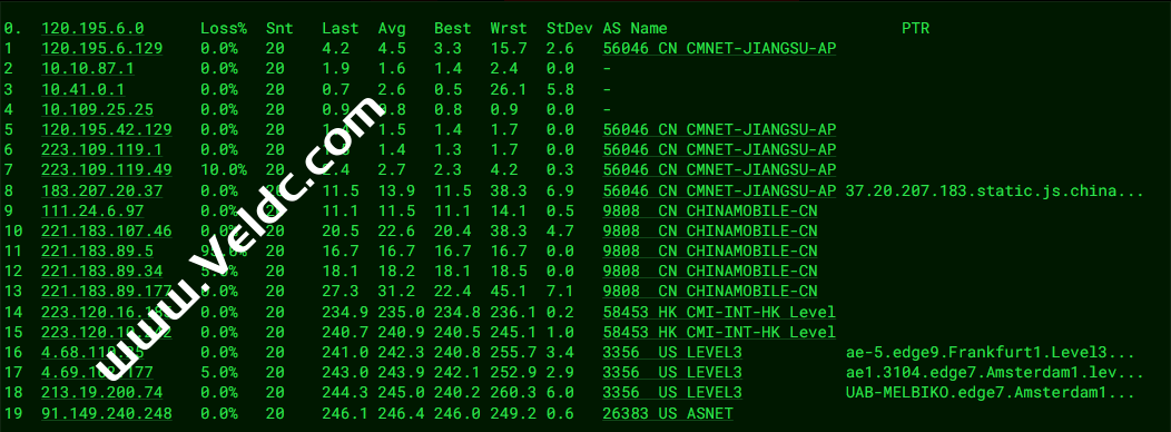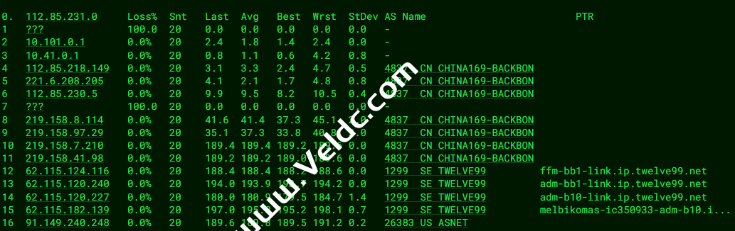 ---------------------------------------------------------------------- 广州电信 traceroute to 14.215.116.1 (14.215.116.1), 30 hops max, 32 byte packets 1 88.210.38.161 2.05 ms AS56630 荷兰, 北荷兰省, 阿姆斯特丹, melbicom.net 2 80.249.214.131 3.87 ms * 荷兰, 北荷兰省, 阿姆斯特丹, ams-ix.net 3 * 4 * 5 202.97.90.157 205.34 ms AS4134 中国, 广东, 广州, chinatelecom.com.cn, 电信 6 * 7 113.108.209.118 204.63 ms AS4134 中国, 广东, 广州, chinatelecom.com.cn, 电信 8 183.56.129.2 206.35 ms AS4134 中国, 广东, 广州, chinatelecom.com.cn, 电信 9 14.215.116.1 207.79 ms AS4134 中国, 广东, 广州, chinatelecom.com.cn, 电信 ---------------------------------------------------------------------- 上海电信 traceroute to 202.96.209.133 (202.96.209.133), 30 hops max, 32 byte packets 1 88.210.38.161 0.54 ms AS56630 荷兰, 北荷兰省, 阿姆斯特丹, melbicom.net 2 80.249.212.76 7.66 ms * 荷兰, 北荷兰省, 阿姆斯特丹, ams-ix.net 3 * 4 * 5 * 6 61.152.25.221 146.58 ms AS4812 中国, 上海, chinatelecom.com.cn, 电信 7 180.169.255.118 224.32 ms AS4812 中国, 上海, chinatelecom.com.cn, 电信 8 * 9 * 10 * 11 * 12 * 13 * 14 * 15 * 16 * 17 * 18 * 19 * 20 * 21 * 22 * 23 * 24 * 25 * 26 * 27 * 28 * 29 * 30 * ---------------------------------------------------------------------- 厦门电信 traceroute to 117.28.254.129 (117.28.254.129), 30 hops max, 32 byte packets 1 88.210.38.161 0.55 ms AS56630 荷兰, 北荷兰省, 阿姆斯特丹, melbicom.net 2 80.249.212.201 9.27 ms * 荷兰, 北荷兰省, 阿姆斯特丹, ams-ix.net 3 i-1002.ulhc-core02.telstraglobal.net (202.84.178.65) 16.70 ms AS4637 英国, 伦敦, telstra.com 4 * 5 i-93.istt04.telstraglobal.net (202.84.224.190) 160.15 ms AS4637 新加坡, telstra.com 6 unknown.telstraglobal.net (210.57.30.130) 179.19 ms AS4637 新加坡, telstra.com 7 59.43.184.121 181.35 ms * 中国, 广东, 广州, chinatelecom.com.cn, 电信 8 * 9 * 10 59.43.46.214 207.63 ms * 中国, 福建, chinatelecom.com.cn, 电信 11 110.80.128.94 229.07 ms AS133775 中国, 福建, 厦门, chinatelecom.com.cn, 电信 12 27.159.81.214 198.11 ms AS133775 中国, 福建, 厦门, chinatelecom.com.cn, 电信 13 * 14 * 15 117.28.254.129 214.62 ms AS4809 中国, 福建, 厦门, chinatelecom.com.cn, 电信 ---------------------------------------------------------------------- 重庆联通 traceroute to 113.207.25.138 (113.207.25.138), 30 hops max, 32 byte packets 1 88.210.38.161 3.46 ms AS56630 荷兰, 北荷兰省, 阿姆斯特丹, melbicom.net 2 ae32.cr4-ams1.ip4.gtt.net (154.14.160.13) 7.68 ms AS3257 荷兰, 北荷兰省, 阿姆斯特丹, gtt.net 3 ae22.cr2-fra6.ip4.gtt.net (213.200.117.138) 6.33 ms AS3257 德国, 黑森州, 法兰克福, gtt.net 4 * 5 219.158.3.245 164.58 ms AS4837 中国, 广东, 广州, chinaunicom.com, 联通 6 219.158.4.125 167.01 ms AS4837 中国, 广东, 广州, chinaunicom.com, 联通 7 219.158.3.21 166.73 ms AS4837 中国, 广东, 广州, chinaunicom.com, 联通 8 219.158.22.74 193.20 ms AS4837 中国, 重庆, chinaunicom.com, 联通 9 * 10 * 11 * 12 * 13 * 14 * 15 * 16 * 17 * 18 * 19 * 20 * 21 * 22 * 23 * 24 * 25 * 26 * 27 * 28 * 29 * 30 * ---------------------------------------------------------------------- 成都联通 traceroute to 119.6.6.6 (119.6.6.6), 30 hops max, 32 byte packets 1 88.210.38.161 0.55 ms AS56630 荷兰, 北荷兰省, 阿姆斯特丹, melbicom.net 2 ae32.cr4-ams1.ip4.gtt.net (154.14.160.13) 1.67 ms AS3257 荷兰, 北荷兰省, 阿姆斯特丹, gtt.net 3 ae22.cr2-fra6.ip4.gtt.net (213.200.117.138) 6.36 ms AS3257 德国, 黑森州, 法兰克福, gtt.net 4 219.158.43.189 7.59 ms AS4837 德国, 黑森州, 法兰克福, chinaunicom.com, 联通 5 219.158.19.209 159.88 ms AS4837 中国, 广东, 广州, chinaunicom.com, 联通 6 219.158.4.105 168.47 ms AS4837 中国, 广东, 广州, chinaunicom.com, 联通 7 219.158.3.125 164.09 ms AS4837 中国, 广东, 广州, chinaunicom.com, 联通 8 219.158.102.186 194.03 ms AS4837 中国, 四川, 成都, chinaunicom.com, 联通 9 * 10 119.6.195.38 208.33 ms AS4837 中国, 四川, 成都, chinaunicom.com, 联通 11 * 12 * 13 * 14 * 15 * 16 * 17 * 18 * 19 * 20 * 21 * 22 * 23 * 24 * 25 * 26 * 27 * 28 * 29 * 30 * ---------------------------------------------------------------------- 上海移动 traceroute to 120.204.197.126 (120.204.197.126), 30 hops max, 32 byte packets 1 88.210.38.161 5.55 ms AS56630 荷兰, 北荷兰省, 阿姆斯特丹, melbicom.net 2 ae32.cr4-ams1.ip4.gtt.net (154.14.160.13) 7.27 ms AS3257 荷兰, 北荷兰省, 阿姆斯特丹, gtt.net 3 ae4.cr6-ams2.ip4.gtt.net (89.149.131.230) 0.93 ms AS3257 荷兰, 北荷兰省, 阿姆斯特丹, gtt.net 4 ip4.gtt.net (46.33.78.218) 3.56 ms AS3257 荷兰, 北荷兰省, 阿姆斯特丹, gtt.net 5 adm-bb4-link.ip.twelve99.net (62.115.137.64) 1.52 ms AS1299 荷兰, 北荷兰省, 阿姆斯特丹, telia.com 6 * 7 slou-b2-link.ip.twelve99.net (62.115.127.7) 10.06 ms AS1299 英国, 伯克郡, 斯劳, telia.com 8 chinamobile-ic342125-slou-b1.ip.twelve99-cust.net (62.115.171.223) 12.87 ms AS1299 英国, 伯克郡, 斯劳, telia.com 9 223.120.10.201 8.87 ms AS58453 英国, 伦敦, chinamobile.com, 移动 10 223.120.15.82 347.76 ms AS58453 中国, 上海, chinamobile.com, 移动 11 * 12 221.183.89.33 347.05 ms AS9808 中国, 上海, chinamobile.com, 移动 13 * 14 * 15 120.204.194.10 355.58 ms AS9808 中国, 上海, chinamobile.com, 移动 16 120.204.197.126 355.01 ms AS9808 中国, 上海, chinamobile.com, 移动 ---------------------------------------------------------------------- 成都移动 traceroute to 183.221.253.100 (183.221.253.100), 30 hops max, 32 byte packets 1 88.210.38.161 1.09 ms AS56630 荷兰, 北荷兰省, 阿姆斯特丹, melbicom.net 2 ae32.cr4-ams1.ip4.gtt.net (154.14.160.13) 8.35 ms AS3257 荷兰, 北荷兰省, 阿姆斯特丹, gtt.net 3 ae22.cr3-lax1.ip4.gtt.net (89.149.181.102) 131.28 ms AS3257 美国, 加利福尼亚州, 洛杉矶, gtt.net 4 ip4.gtt.net (173.205.45.154) 138.14 ms AS