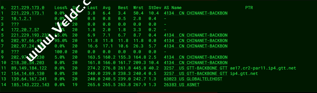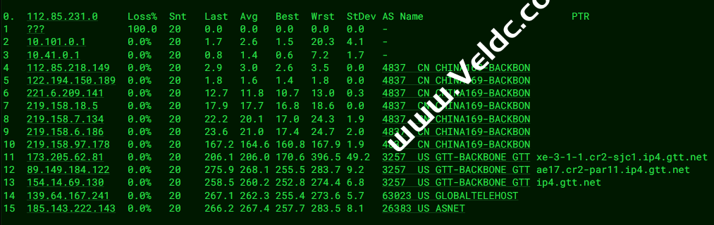 ---------------------------------------------------------------------- 广州电信 traceroute to 14.215.116.1 (14.215.116.1), 30 hops max, 32 byte packets 1 91.149.218.1 0.81 ms AS26383 法国, 法兰西岛大区, 巴黎, baxetgroup.com 2 139.64.167.240 0.38 ms AS63023 法国, 法兰西岛大区, 巴黎, gthost.com 3 et-8-1-2.cr2-par11.ip4.gtt.net (154.14.69.129) 0.45 ms AS3257 法国, 法兰西岛大区, 巴黎, gtt.net 4 ae0.cr10-lon2.ip4.gtt.net (89.149.128.98) 6.62 ms AS3257 英国, 伦敦, gtt.net 5 ip4.gtt.net (154.14.42.210) 8.13 ms AS3257 英国, 伦敦, gtt.net 6 202.97.70.109 263.23 ms AS4134 中国, 广东, 广州, chinatelecom.com.cn, 电信 7 202.97.12.34 255.88 ms AS4134 中国, 广东, 广州, chinatelecom.com.cn, 电信 8 * 9 * 10 113.108.209.198 268.27 ms AS4134 中国, 广东, 广州, chinatelecom.com.cn, 电信 11 183.56.129.2 296.66 ms AS4134 中国, 广东, 广州, chinatelecom.com.cn, 电信 12 14.215.116.1 261.56 ms AS4134 中国, 广东, 广州, chinatelecom.com.cn, 电信 ---------------------------------------------------------------------- 上海电信 traceroute to 202.96.209.133 (202.96.209.133), 30 hops max, 32 byte packets 1 91.149.218.1 1.06 ms AS26383 法国, 法兰西岛大区, 巴黎, baxetgroup.com 2 139.64.167.240 0.25 ms AS63023 法国, 法兰西岛大区, 巴黎, gthost.com 3 et-8-1-2.cr2-par11.ip4.gtt.net (154.14.69.129) 0.60 ms AS3257 法国, 法兰西岛大区, 巴黎, gtt.net 4 ae0.cr10-lon2.ip4.gtt.net (89.149.128.98) 7.23 ms AS3257 英国, 伦敦, gtt.net 5 ip4.gtt.net (154.14.42.210) 7.24 ms AS3257 英国, 伦敦, gtt.net 6 * 7 * 8 202.97.57.154 253.25 ms AS4134 中国, 上海, chinatelecom.com.cn, 电信 9 * 10 * 11 * 12 * 13 * 14 * 15 * 16 * 17 * 18 * 19 * 20 * 21 * 22 * 23 * 24 * 25 * 26 * 27 * 28 * 29 * 30 * ---------------------------------------------------------------------- 厦门电信 traceroute to 117.28.254.129 (117.28.254.129), 30 hops max, 32 byte packets 1 91.149.218.1 1.02 ms AS26383 法国, 法兰西岛大区, 巴黎, baxetgroup.com 2 139.64.167.240 0.30 ms AS63023 法国, 法兰西岛大区, 巴黎, gthost.com 3 et-8-1-2.cr2-par11.ip4.gtt.net (154.14.69.129) 0.47 ms AS3257 法国, 法兰西岛大区, 巴黎, gtt.net 4 et-10-1-0.cr0-par2.ip4.gtt.net (89.149.182.210) 0.67 ms AS3257 法国, 法兰西岛大区, 巴黎, gtt.net 5 ip4.gtt.net (154.14.26.206) 1.98 ms AS3257 法国, 法兰西岛大区, 巴黎, gtt.net 6 * 7 CHINA-TELEC.ear1.London15.Level3.net (217.163.44.234) 7.45 ms AS3356 英国, 伦敦, level3.com 8 59.43.250.1 257.34 ms * 中国, 上海, chinatelecom.com.cn, 电信 9 * 10 59.43.130.213 265.92 ms * 中国, 上海, chinatelecom.com.cn, 电信 11 59.43.138.186 294.96 ms * 中国, 福建, chinatelecom.com.cn, 电信 12 * 13 27.159.81.190 302.03 ms AS133775 中国, 福建, 厦门, chinatelecom.com.cn, 电信 14 * 15 * 16 117.28.254.129 296.48 ms AS4809 中国, 福建, 厦门, chinatelecom.com.cn, 电信 ---------------------------------------------------------------------- 重庆联通 traceroute to 113.207.25.138 (113.207.25.138), 30 hops max, 32 byte packets 1 91.149.218.1 1.06 ms AS26383 法国, 法兰西岛大区, 巴黎, baxetgroup.com 2 139.64.167.240 0.31 ms AS63023 法国, 法兰西岛大区, 巴黎, gthost.com 3 et-8-1-2.cr2-par11.ip4.gtt.net (154.14.69.129) 0.39 ms AS3257 法国, 法兰西岛大区, 巴黎, gtt.net 4 ae21.cr2-fra6.ip4.gtt.net (213.200.116.225) 9.70 ms AS3257 德国, 黑森州, 法兰克福, gtt.net 5 219.158.43.189 235.91 ms AS4837 德国, 黑森州, 法兰克福, chinaunicom.com, 联通 6 219.158.7.213 238.36 ms AS4837 中国, 广东, 广州, chinaunicom.com, 联通 7 219.158.4.53 230.14 ms AS4837 中国, 广东, 广州, chinaunicom.com, 联通 8 219.158.3.21 233.79 ms AS4837 中国, 广东, 广州, chinaunicom.com, 联通 9 219.158.21.242 255.01 ms AS4837 中国, 重庆, chinaunicom.com, 联通 10 * 11 * 12 * 13 * 14 * 15 * 16 * 17 * 18 * 19 * 20 * 21 * 22 * 23 * 24 * 25 * 26 * 27 * 28 * 29 * 30 * ---------------------------------------------------------------------- 成都联通 traceroute to 119.6.6.6 (119.6.6.6), 30 hops max, 32 byte packets 1 91.149.218.1 1.12 ms AS26383 法国, 法兰西岛大区, 巴黎, baxetgroup.com 2 139.64.167.240 0.42 ms AS63023 法国, 法兰西岛大区, 巴黎, gthost.com 3 et-8-1-2.cr2-par11.ip4.gtt.net (154.14.69.129) 0.99 ms AS3257 法国, 法兰西岛大区, 巴黎, gtt.net 4 ae21.cr2-fra6.ip4.gtt.net (213.200.116.225) 9.93 ms AS3257 德国, 黑森州, 法兰克福, gtt.net 5 219.158.43.189 225.27 ms AS4837 德国, 黑森州, 法兰克福, chinaunicom.com, 联通 6 219.158.98.37 245.56 ms AS4837 中国, 广东, 广州, chinaunicom.com, 联通 7 219.158.98.93 239.60 ms AS4837 中国, 广东, 广州, chinaunicom.com, 联通 8 * 9 * 10 119.6.197.254 248.33 ms AS4837 中国, 四川, 成都, chinaunicom.com, 联通 11 119.6.195.34 247.50 ms AS4837 中国, 四川, 成都, chinaunicom.com, 联通 12 * 13 * 14 * 15 * 16 * 17 * 18 * 19 * 20 * 21 * 22 * 23 * 24 * 25 * 26 * 27 * 28 * 29 * 30 * ---------------------------------------------------------------------- 上海移动 traceroute to 120.204.197.126 (120.204.197.126), 30 hops max, 32 byte packets 1 91.149.218.1 0.84 ms AS26383 法国, 法兰西岛大区, 巴黎, baxetgroup.com 2 139.64.167.240 0.43 ms AS63023 法国, 法兰西岛大区, 巴黎, gthost.com 3 et-8-1-2.cr2-par11.ip4.gtt.net (154.14.69.129) 0.76 ms AS3257 法国, 法兰西岛大区, 巴黎, gtt.net 4 et-0-0-13.cr4-par9.ip4.gtt.net (89.149.185.170) 0.77 ms AS3257 法国, 法兰西岛大区, 巴黎, gtt.net 5 ip4.gtt.net (212.222.123.6) 1.03 ms AS3257 英国, gtt.net 6 prs-bb2-link.ip.twelve99.net (62.115.125.166) 1.52 ms AS1299 法国, 法兰西岛大区, 巴黎, telia.com 7 ldn-bb1-link.ip.twelve99.net (62.115.135.24) 7.17 ms AS1299 英国, 伦敦, telia.com 8 slou-b2-link.ip.twelve99.net (62.115.127.7) 8.45 ms AS1299 英国, 伯克郡, 斯劳, telia.com 9 chinamobile-ic342125-slou-b1.ip.twelve99-cust.net (62.115.171.223) 15.71 ms AS1299 英