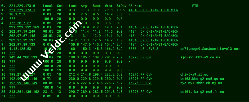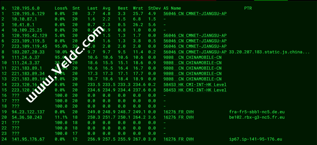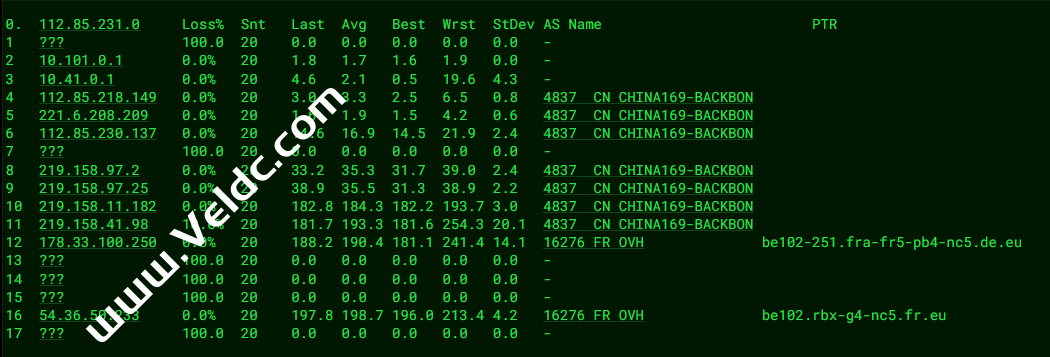 ---------------------------------------------------------------------- 广州电信 traceroute to 14.215.116.1 (14.215.116.1), 30 hops max, 32 byte packets 1 ip94.ip-141-95-176.eu (141.95.176.94) 1.72 ms AS16276 法国, ovh.com 2 10.17.119.96 2.38 ms * 局域网 3 10.73.16.238 1.79 ms * 局域网 4 10.95.64.0 2.94 ms * 局域网 5 par-th2-sbb1-nc5.fr.eu (54.36.50.226) 5.75 ms AS16276 法国, 法兰西岛大区, 巴黎, ovh.com 6 10.200.2.85 5.68 ms * 局域网 7 * 8 ae312-0.ffttr6.frankfurt.opentransit.net (193.251.133.154) 11.82 ms AS5511 德国, 黑森州, 法兰克福, orange.com 9 ae324-0.ffttr7.frankfurt.opentransit.net (193.251.240.102) 13.74 ms AS5511 德国, 黑森州, 法兰克福, orange.com 10 ae312-0.ffttr6.frankfurt.opentransit.net (193.251.133.154) 12.01 ms AS5511 德国, 黑森州, 法兰克福, orange.com 11 * 12 * 13 * 14 183.2.167.233 262.57 ms AS4134 中国, 广东, 广州, chinatelecom.com.cn, 电信 15 * 16 121.14.50.210 253.92 ms AS4134 中国, 广东, 广州, chinatelecom.com.cn, 电信 17 183.56.128.2 264.64 ms AS4134 中国, 广东, 广州, chinatelecom.com.cn, 电信 18 183.56.128.10 250.59 ms AS4134 中国, 广东, 广州, chinatelecom.com.cn, 电信 19 * 20 * 21 * 22 * 23 * 24 * 25 * 26 * 27 * 28 * 29 * 30 * ---------------------------------------------------------------------- 上海电信 traceroute to 202.96.209.133 (202.96.209.133), 30 hops max, 32 byte packets 1 ip94.ip-141-95-176.eu (141.95.176.94) 1.75 ms AS16276 法国, ovh.com 2 10.17.119.100 2.14 ms * 局域网 3 10.73.16.234 1.75 ms * 局域网 4 10.95.64.136 2.21 ms * 局域网 5 par-gsw-sbb1-nc5.fr.eu (54.36.50.228) 5.63 ms AS16276 法国, 法兰西岛大区, 巴黎, ovh.com 6 10.200.2.73 249.88 ms * 局域网 7 * 8 be3183.ccr41.par01.atlas.cogentco.com (154.54.38.65) 62.80 ms AS174 法国, 法兰西岛大区, 巴黎, cogentco.com 9 be12489.ccr42.lon13.atlas.cogentco.com (154.54.57.69) 9.75 ms AS174 英国, 伦敦, cogentco.com 10 be2375.rcr21.b015533-1.lon13.atlas.cogentco.com (154.54.61.158) 9.71 ms AS174 英国, 伦敦, cogentco.com 11 chinatelecom.demarc.cogentco.com (149.14.81.226) 63.14 ms AS174 英国, 伦敦, cogentco.com 12 * 13 * 14 * 15 * 16 * 17 124.74.229.230 315.54 ms AS4812 中国, 上海, chinatelecom.com.cn, 电信 18 * 19 * 20 * 21 * 22 * 23 * 24 * 25 * 26 * 27 * 28 * 29 * 30 * ---------------------------------------------------------------------- 厦门电信 traceroute to 117.28.254.129 (117.28.254.129), 30 hops max, 32 byte packets 1 ip94.ip-141-95-176.eu (141.95.176.94) 1.77 ms AS16276 法国, ovh.com 2 10.17.119.96 2.32 ms * 局域网 3 10.73.16.236 1.78 ms * 局域网 4 10.95.64.158 2.24 ms * 局域网 5 lon-drch-sbb1-nc5.uk.eu (54.36.50.230) 5.93 ms AS16276 英国, 伦敦, ovh.com 6 10.200.0.141 55.85 ms * 局域网 7 * 8 i-1001.ulhc-core02.telstraglobal.net (202.84.178.70) 140.45 ms AS4637 英国, 伦敦, telstra.com 9 * 10 i-1000.sgcn-core01.telstraglobal.net (202.84.140.141) 260.20 ms AS4637 新加坡, telstra.com 11 unknown.telstraglobal.net (210.57.30.22) 159.43 ms AS4637 新加坡, telstra.com 12 59.43.189.201 190.90 ms * 中国, 广东, 广州, chinatelecom.com.cn, 电信 13 59.43.182.121 199.01 ms * 中国, 广东, 广州, chinatelecom.com.cn, 电信 14 59.43.16.181 194.94 ms * 中国, 广东, 广州, chinatelecom.com.cn, 电信 15 59.43.46.214 206.75 ms * 中国, 福建, chinatelecom.com.cn, 电信 16 59.43.46.214 213.86 ms * 中国, 福建, chinatelecom.com.cn, 电信 17 * 18 * 19 * 20 * 21 * 22 * 23 * 24 * 25 * 26 * 27 * 28 * 29 * 30 * ---------------------------------------------------------------------- 重庆联通 traceroute to 113.207.25.138 (113.207.25.138), 30 hops max, 32 byte packets 1 ip94.ip-141-95-176.eu (141.95.176.94) 1.74 ms AS16276 法国, ovh.com 2 10.17.119.96 2.12 ms * 局域网 3 10.73.16.232 1.84 ms * 局域网 4 10.95.64.156 2.16 ms * 局域网 5 par-th2-sbb1-nc5.fr.eu (54.36.50.226) 6.13 ms AS16276 法国, 法兰西岛大区, 巴黎, ovh.com 6 10.200.2.21 5.63 ms * 局域网 7 * 8 bundle-ether306.pastr4.paris.opentransit.net (193.251.133.140) 13.47 ms AS5511 法国, 法兰西岛大区, 巴黎, orange.com 9 ae304-0.ffttr7.frankfurt.opentransit.net (193.251.133.3) 12.09 ms AS5511 德国, 黑森州, 法兰克福, orange.com 10 ae324-0.ffttr7.frankfurt.opentransit.net (193.251.240.102) 13.85 ms AS5511 德国, 黑森州, 法兰克福, orange.com 11 219.158.11.149 179.82 ms AS4837 中国, 北京, chinaunicom.com, 联通 12 219.158.15.161 175.81 ms AS4837 中国, 北京, chinaunicom.com, 联通 13 * 14 * 15 * 16 * 17 * 18 * 19 * 20 * 21 * 22 * 23 * 24 * 25 * 26 * 27 * 28 * 29 * 30 * ---------------------------------------------------------------------- 成都联通 traceroute to 119.6.6.6 (119.6.6.6), 30 hops max, 32 byte packets 1 ip94.ip-141-95-176.eu (141.95.176.94) 1.80 ms AS16276 法国, ovh.com 2 10.17.119.102 2.16 ms * 局域网 3 10.73.16.232 1.72 ms * 局域网 4 10.95.64.152 2.78 ms * 局域网 5 par-gsw-sbb1-nc5.fr.eu (54.36.50.228) 5.60 ms AS16276 法国, 法兰西岛大区, 巴黎, ovh.com 6 10.200.2.73 6.15 ms * 局域网 7 * 8 bundle-ether305.pastr4.paris.opentransit.net (193.251.133.22) 13.69 ms AS5511 法国, 法兰西岛大区, 巴黎, orange.com 9 ae324-0.ffttr7.frankfurt.opentransit.net (193.251.240.102) 13.57 ms AS5511 德国, 黑森州, 法兰克福, orange.com 10 193.251.250.4 13.80 ms AS5511 ORANGE.COM 骨干网, orange.com 11 219.158.15.161 174.13 ms AS4837 中国, 北京, chinaunicom.com, 联通 12 219.158.3.181 166.95 ms AS4837 中国, 北京, chinaunicom.com, 联通 13 * 14 * 15 * 16 119.6.195.34 214.07 ms AS4837 中国, 四川, 成都, chinaunicom.com, 联通 17 * 18 * 19 * 20 * 21 * 22 * 23 * 24 * 25 * 26 * 27 * 28 * 29 * 30 * ---------------------------------------------------------------------- 上海移动 traceroute to 120.204.197.126 (120.204.197.126), 30 hops max, 32 byte packets 1 ip94.ip-141-95-176.eu (141.95.176.94) 1.82 ms AS16276 法国, ovh.com 2 10.17.119.100 2.23 ms * 局域网 3 10.73.16.238 1.83 ms * 