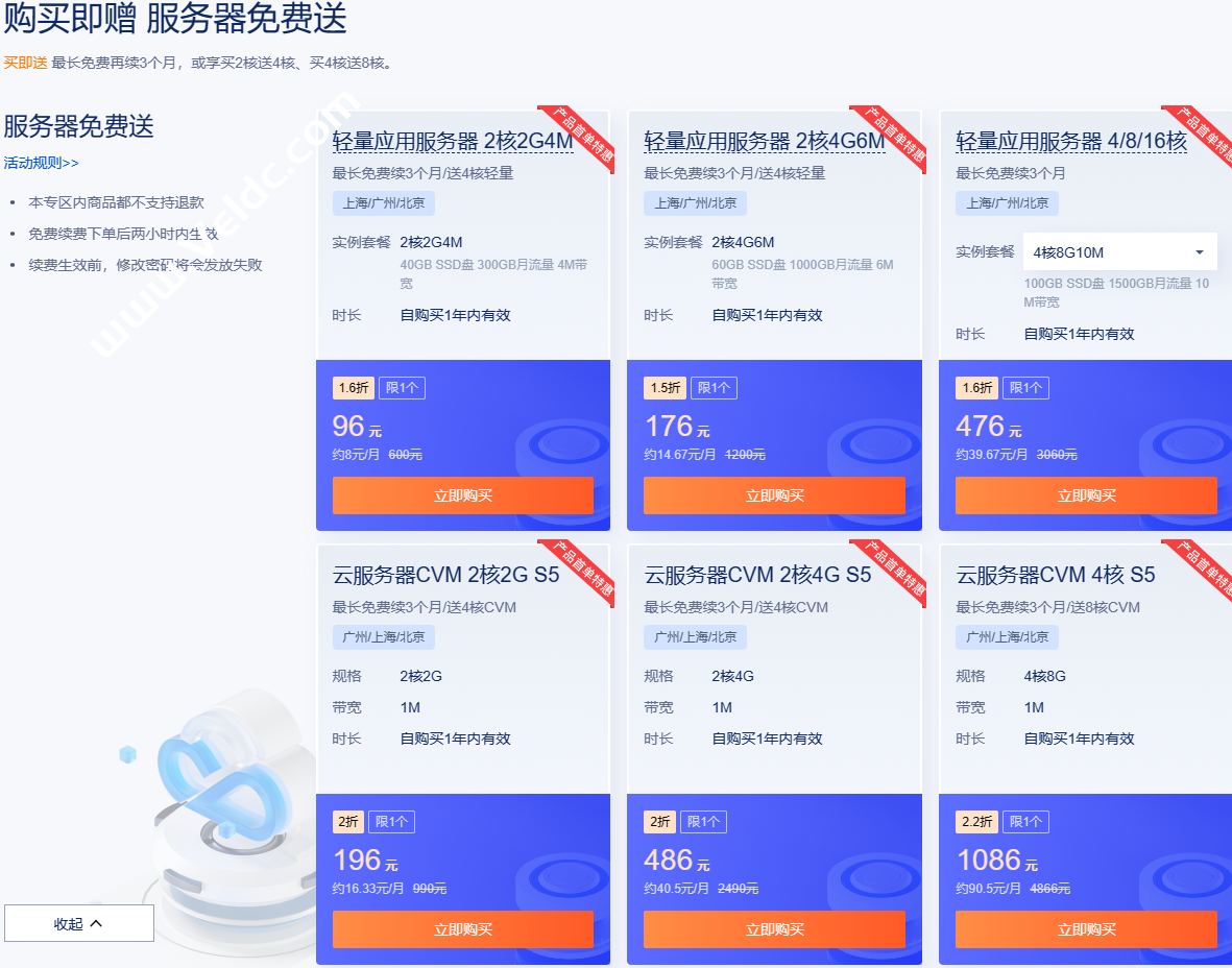 买即送 最长免费再续3个月,或享买2核送4核、买4核送8核,腾讯云,年末·限时回馈_云服务器秒杀_热卖云产品年终特惠,2核2G轻量应用服务器6.58元/月起,点击直达活动主会场>>
