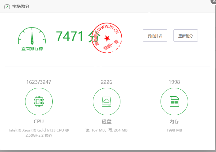 跑分完成(如图):显示当前服务器的CPU、内存、硬盘,数据处理得到的跑分结果