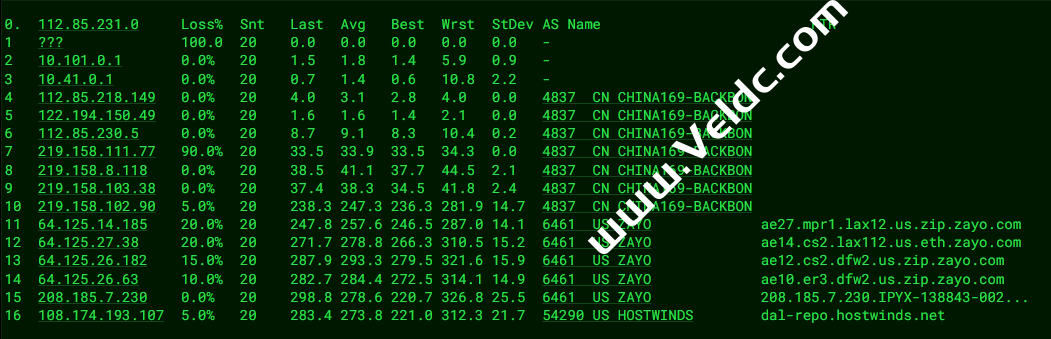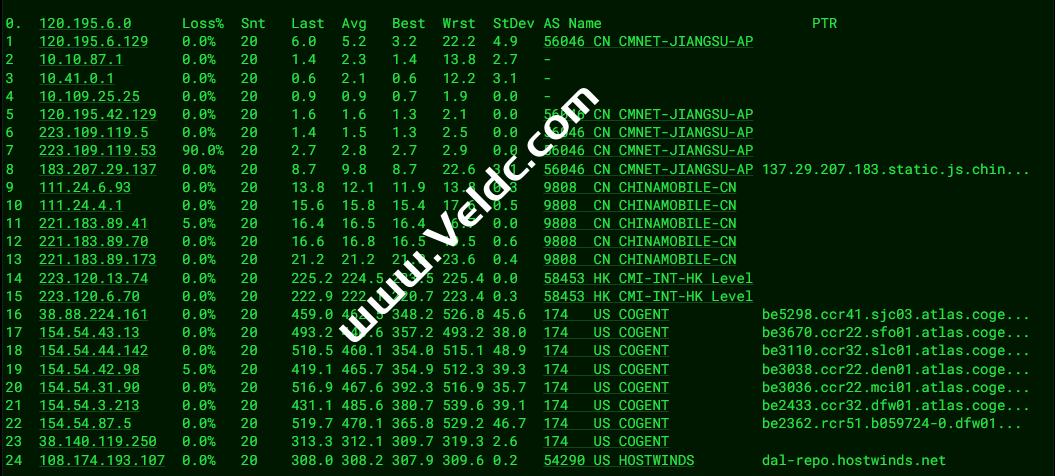 ---------------------------------------------------------------------- 广州电信 traceroute to 14.215.116.1 (14.215.116.1), 30 hops max, 32 byte packets 1 10.5.0.1 0.42 ms * 局域网 2 te0-5-0-5-9.ccr41.dfw03.atlas.cogentco.com (38.140.105.65) 1.02 ms AS174 美国, 德克萨斯州, 达拉斯, cogentco.com 3 be2764.ccr32.dfw01.atlas.cogentco.com (154.54.47.213) 1.36 ms AS174 美国, 德克萨斯州, 达拉斯, cogentco.com 4 be2433.ccr22.mci01.atlas.cogentco.com (154.54.3.214) 10.88 ms AS174 美国, 密苏里州, 堪萨斯城, cogentco.com 5 be3035.ccr21.den01.atlas.cogentco.com (154.54.5.89) 22.50 ms AS174 美国, 科罗拉多州, 丹佛, cogentco.com 6 be3038.ccr32.slc01.atlas.cogentco.com (154.54.42.97) 32.64 ms AS174 美国, 犹他州, 盐湖城, cogentco.com 7 be3109.ccr21.sfo01.atlas.cogentco.com (154.54.44.137) 46.96 ms AS174 美国, 加利福尼亚州, 旧金山, cogentco.com 8 be3670.ccr41.sjc03.atlas.cogentco.com (154.54.43.14) 88.14 ms AS174 美国, 加利福尼亚州, 圣何塞, cogentco.com 9 38.104.138.106 50.32 ms AS174 美国, 加利福尼亚州, 圣何塞, cogentco.com 10 202.97.43.117 206.22 ms AS4134 中国, 广东, 广州, chinatelecom.com.cn, 电信 11 * 12 202.97.94.129 226.28 ms AS4134 中国, 广东, 广州, chinatelecom.com.cn, 电信 13 * 14 113.96.4.230 214.46 ms AS4134 中国, 广东, 广州, chinatelecom.com.cn, 电信 15 121.14.50.202 216.88 ms AS4134 中国, 广东, 广州, chinatelecom.com.cn, 电信 16 14.215.116.1 234.74 ms AS4134 中国, 广东, 广州, chinatelecom.com.cn, 电信 ---------------------------------------------------------------------- 上海电信 traceroute to 202.96.209.133 (202.96.209.133), 30 hops max, 32 byte packets 1 10.5.0.1 0.35 ms * 局域网 2 te0-2-1-19.rcr51.b059724-0.dfw01.atlas.cogentco.com (38.140.119.241) 1.05 ms AS174 美国, 德克萨斯州, 达拉斯, cogentco.com 3 be2356.ccr31.dfw01.atlas.cogentco.com (154.54.47.106) 1.29 ms AS174 美国, 德克萨斯州, 达拉斯, cogentco.com 4 be2432.ccr21.mci01.atlas.cogentco.com (154.54.3.134) 11.04 ms AS174 美国, 密苏里州, 堪萨斯城, cogentco.com 5 be3036.ccr22.den01.atlas.cogentco.com (154.54.31.89) 22.53 ms AS174 美国, 科罗拉多州, 丹佛, cogentco.com 6 be3037.ccr21.slc01.atlas.cogentco.com (154.54.41.145) 32.96 ms AS174 美国, 犹他州, 盐湖城, cogentco.com 7 be3109.ccr21.sfo01.atlas.cogentco.com (154.54.44.137) 47.01 ms AS174 美国, 加利福尼亚州, 旧金山, cogentco.com 8 be3669.ccr41.sjc03.atlas.cogentco.com (154.54.43.10) 58.93 ms AS174 美国, 加利福尼亚州, 圣何塞, cogentco.com 9 38.104.138.106 49.95 ms AS174 美国, 加利福尼亚州, 圣何塞, cogentco.com 10 * 11 * 12 * 13 61.152.26.89 198.30 ms AS4812 中国, 上海, chinatelecom.com.cn, 电信 14 124.74.229.238 197.92 ms AS4812 中国, 上海, chinatelecom.com.cn, 电信 15 124.74.229.238 196.23 ms AS4812 中国, 上海, chinatelecom.com.cn, 电信 16 * 17 * 18 * 19 * 20 * 21 * 22 * 23 * 24 * 25 * 26 * 27 * 28 * 29 * 30 * ---------------------------------------------------------------------- 厦门电信 traceroute to 117.28.254.129 (117.28.254.129), 30 hops max, 32 byte packets 1 10.5.0.1 5.68 ms * 局域网 2 client-23-238-104-130.hostwindsdns.com (23.238.104.130) 0.32 ms AS54290 美国, 德克萨斯州, 达拉斯, hostwinds.com 3 xe-5-5-1-1.a00.dllstx14.us.bb.gin.ntt.net (128.241.1.225) 0.68 ms AS2914 美国, 德克萨斯州, 达拉斯, ntt.com 4 ae-2.r24.lsanca07.us.bb.gin.ntt.net (129.250.7.69) 30.99 ms AS2914 美国, 加利福尼亚州, 洛杉矶, ntt.com 5 ae-8.r25.lsanca07.us.bb.gin.ntt.net (129.250.3.219) 26.17 ms AS2914 美国, 加利福尼亚州, 洛杉矶, ntt.com 6 ae-8.r25.lsanca07.us.bb.gin.ntt.net (129.250.3.219) 26.97 ms AS2914 美国, 加利福尼亚州, 洛杉矶, ntt.com 7 ae-1.a01.tokyjp09.jp.bb.gin.ntt.net (129.250.7.62) 135.38 ms AS2914 日本, 东京都, 东京, ntt.com 8 ae-3.r00.tokyjp08.jp.bb.gin.ntt.net (129.250.6.129) 130.33 ms AS2914 日本, 东京都, 东京, ntt.com 9 ae-2.a00.tokyjp04.jp.bb.gin.ntt.net (129.250.2.69) 137.59 ms AS2914 日本, 东京都, 东京, ntt.com 10 59.43.186.185 163.21 ms * 中国, 上海, chinatelecom.com.cn, 电信 11 * 12 * 13 * 14 * 15 * 16 * 17 * 18 * 19 117.28.254.129 194.87 ms AS4809 中国, 福建, 厦门, chinatelecom.com.cn, 电信 ---------------------------------------------------------------------- 重庆联通 traceroute to 113.207.25.138 (113.207.25.138), 30 hops max, 32 byte packets 1 10.5.0.1 0.35 ms * 局域网 2 te0-5-0-5-9.ccr41.dfw03.atlas.cogentco.com (38.140.105.65) 1.13 ms AS174 美国, 德克萨斯州, 达拉斯, cogentco.com 3 * 4 * 5 * 6 * 7 * 8 * 9 219.158.98.173 268.59 ms AS4837 中国, 上海, chinaunicom.com, 联通 10 219.158.98.173 281.75 ms AS4837 中国, 上海, chinaunicom.com, 联通 11 219.158.8.173 287.60 ms AS4837 中国, 上海, chinaunicom.com, 联通 12 219.158.106.254 316.39 ms AS4837 中国, 重庆, chinaunicom.com, 联通 13 * 14 * 15 * 16 * 17 * 18 * 19 * 20 * 21 * 22 * 23 * 24 * 25 * 26 * 27 * 28 * 29 * 30 * ---------------------------------------------------------------------- 成都联通 traceroute to 119.6.6.6 (119.6.6.6), 30 hops max, 32 byte packets 1 10.5.0.1 4.41 ms * 局域网 2 client-23-238-104-130.hostwindsdns.com (23.238.104.130) 2.67 ms AS54290 美国, 德克萨斯州, 达拉斯, hostwinds.com 3 * 4 * 5 * 6 * 7 * 8 .55.148.204.in-addr.arpa (204.148.55.106) 265.59 ms AS701 美国, 加利福尼亚州, 圣何塞, verizon.com 9 219.158.116.237 272.71 ms AS4837 中国, 上海, chinaunicom.com, 联通 10 219.158.113.142 256.34 ms AS4837 中国, 上海, chinaunicom.com, 联通 11 * 12 * 13 219.158.107.90 260.83 ms AS4837 中国, 四川, 成都, chinaunicom.com, 联通 14 119.6.197.202 249.30 ms AS4837 中国, 四川, 成都, chinaunicom.com, 联通 15 * 16 * 17 * 18 * 19 * 20 * 21 * 22 * 23 * 24 * 25 * 26 * 27 * 28 * 29 * 30 * ---------------------------------------------------------------------- 上海移动 traceroute to 120.204.197.126 (120.204.197.126), 30 hop