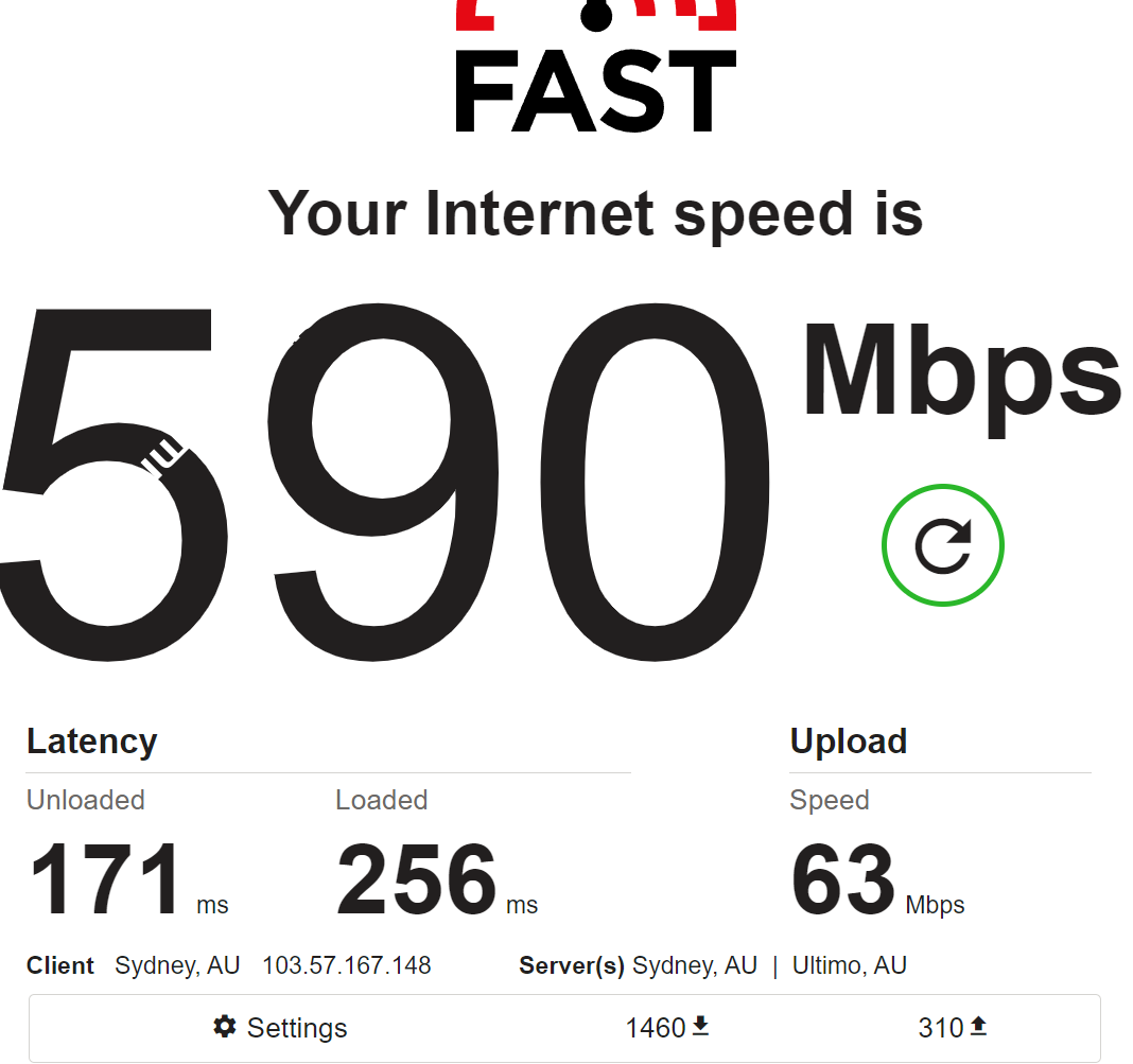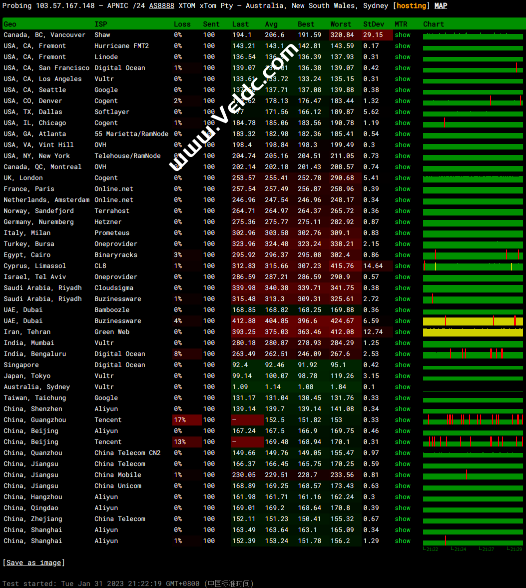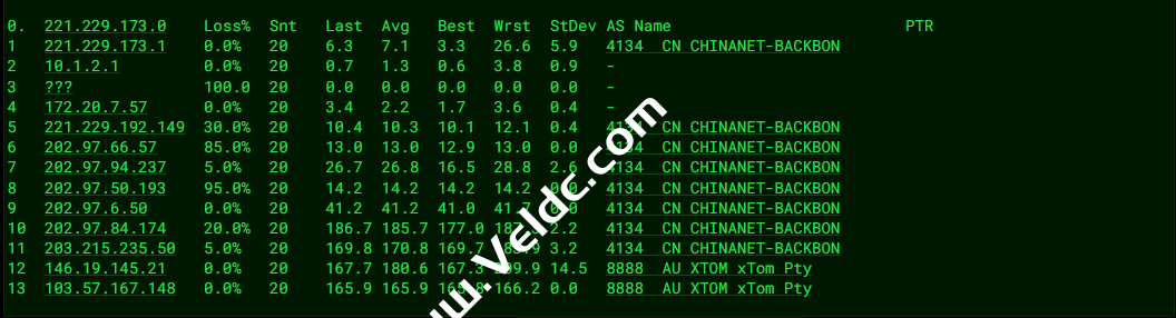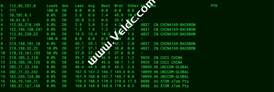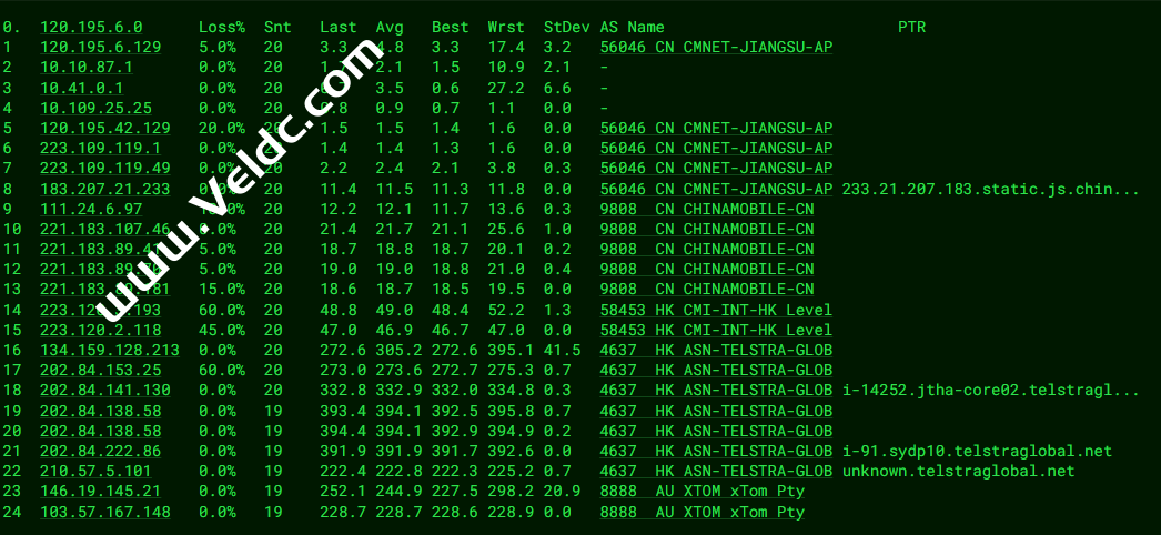 ---------------------------------------------------------------------- 广州电信 traceroute to 14.215.116.1 (14.215.116.1), 30 hops max, 32 byte packets 1 103.57.167.1 18.14 ms AS8888 澳大利亚, 新南威尔士州, 悉尼, xtom.com 2 cr01.wallabie.syd05.xtom.au (146.19.145.20) 0.34 ms AS8888 澳大利亚, 新南威尔士州, 悉尼, xtom.com 3 43.252.87.69 2.16 ms AS10099 中国, 香港, chinaunicom.com, 联通 4 162.245.124.29 135.12 ms AS10099 中国, 香港, chinaunicom.com, 联通 5 202.77.23.157 130.55 ms AS10099 中国, 香港, chinaunicom.com, 联通 6 218.105.11.89 141.96 ms AS9929 中国, 广东, 广州, chinaunicom.com, 联通 7 218.105.2.157 139.42 ms AS9929 中国, 广东, 广州, chinaunicom.com, 联通 8 210.14.161.150 141.61 ms * 中国, 广东, 广州, chinaunicom.com, 联通 9 202.97.16.69 142.47 ms AS4134 中国, 广东, 广州, chinatelecom.com.cn, 电信 10 202.97.95.85 139.12 ms AS4134 中国, 广东, 广州, chinatelecom.com.cn, 电信 11 * 12 58.63.249.34 144.23 ms AS4134 中国, 广东, 广州, chinatelecom.com.cn, 电信 13 183.60.112.14 136.93 ms AS4134 中国, 广东, 广州, chinatelecom.com.cn, 电信 14 14.215.116.1 143.08 ms AS4134 中国, 广东, 广州, chinatelecom.com.cn, 电信 ---------------------------------------------------------------------- 上海电信 traceroute to 202.96.209.133 (202.96.209.133), 30 hops max, 32 byte packets 1 103.57.167.1 28.75 ms AS8888 澳大利亚, 新南威尔士州, 悉尼, xtom.com 2 cr01.wallabie.syd05.xtom.au (146.19.145.20) 6.34 ms AS8888 澳大利亚, 新南威尔士州, 悉尼, xtom.com 3 43.252.87.69 2.03 ms AS10099 中国, 香港, chinaunicom.com, 联通 4 202.77.23.241 131.42 ms AS10099 中国, 香港, chinaunicom.com, 联通 5 202.77.23.157 128.76 ms AS10099 中国, 香港, chinaunicom.com, 联通 6 218.105.7.213 133.73 ms AS9929 中国, 广东, 广州, chinaunicom.com, 联通 7 218.105.2.113 132.72 ms AS9929 中国, 广东, 广州, chinaunicom.com, 联通 8 * 9 218.105.2.150 163.98 ms AS9929 中国, 上海, chinaunicom.com, 联通 10 202.97.81.81 164.32 ms AS4134 中国, 上海, chinatelecom.com.cn, 电信 11 * 12 * 13 124.74.229.230 164.16 ms AS4812 中国, 上海, chinatelecom.com.cn, 电信 14 124.74.229.238 166.59 ms AS4812 中国, 上海, chinatelecom.com.cn, 电信 15 * 16 * 17 * 18 * 19 * 20 * 21 * 22 * 23 * 24 * 25 * 26 * 27 * 28 * 29 * 30 * ---------------------------------------------------------------------- 厦门电信 traceroute to 117.28.254.129 (117.28.254.129), 30 hops max, 32 byte packets 1 103.57.167.1 17.01 ms AS8888 澳大利亚, 新南威尔士州, 悉尼, xtom.com 2 cr01.wallabie.syd05.xtom.au (146.19.145.20) 5.32 ms AS8888 澳大利亚, 新南威尔士州, 悉尼, xtom.com 3 43.252.87.69 3.22 ms AS10099 中国, 香港, chinaunicom.com, 联通 4 202.77.23.241 135.30 ms AS10099 中国, 香港, chinaunicom.com, 联通 5 202.77.23.157 128.89 ms AS10099 中国, 香港, chinaunicom.com, 联通 6 218.105.10.129 135.55 ms AS9929 中国, 广东, 广州, chinaunicom.com, 联通 7 218.105.2.109 130.65 ms AS9929 中国, 广东, 广州, chinaunicom.com, 联通 8 210.14.161.150 134.22 ms * 中国, 广东, 广州, chinaunicom.com, 联通 9 219.158.32.17 142.84 ms AS4837 中国, 广东, 广州, chinaunicom.com, 联通 10 219.158.38.246 142.21 ms AS4837 中国, 广东, 广州, chinaunicom.com, 联通 11 59.43.46.214 150.99 ms * 中国, 福建, chinatelecom.com.cn, 电信 12 110.80.128.94 157.54 ms AS133775 中国, 福建, 厦门, chinatelecom.com.cn, 电信 13 * 14 * 15 * 16 117.28.254.129 164.17 ms AS4809 中国, 福建, 厦门, chinatelecom.com.cn, 电信 ---------------------------------------------------------------------- 重庆联通 traceroute to 113.207.25.138 (113.207.25.138), 30 hops max, 32 byte packets 1 103.57.167.1 18.19 ms AS8888 澳大利亚, 新南威尔士州, 悉尼, xtom.com 2 cr01.wallabie.syd05.xtom.au (146.19.145.20) 0.29 ms AS8888 澳大利亚, 新南威尔士州, 悉尼, xtom.com 3 43.252.87.69 2.03 ms AS10099 中国, 香港, chinaunicom.com, 联通 4 202.77.23.241 133.14 ms AS10099 中国, 香港, chinaunicom.com, 联通 5 202.77.23.157 130.64 ms AS10099 中国, 香港, chinaunicom.com, 联通 6 218.105.10.9 136.44 ms AS9929 中国, 广东, 广州, chinaunicom.com, 联通 7 * 8 * 9 210.14.178.106 159.20 ms * 中国, 重庆, chinaunicom.com, 联通 10 219.158.45.105 155.14 ms AS4837 中国, 重庆, chinaunicom.com, 联通 11 219.158.106.209 168.65 ms AS4837 中国, 重庆, chinaunicom.com, 联通 12 * 13 * 14 * 15 * 16 * 17 * 18 * 19 * 20 * 21 * 22 * 23 * 24 * 25 * 26 * 27 * 28 * 29 * 30 * ---------------------------------------------------------------------- 成都联通 traceroute to 119.6.6.6 (119.6.6.6), 30 hops max, 32 byte packets 1 103.57.167.1 24.26 ms AS8888 澳大利亚, 新南威尔士州, 悉尼, xtom.com 2 cr01.wallabie.syd05.xtom.au (146.19.145.20) 0.37 ms AS8888 澳大利亚, 新南威尔士州, 悉尼, xtom.com 3 43.252.87.69 3.36 ms AS10099 中国, 香港, chinaunicom.com, 联通 4 162.245.124.29 134.93 ms AS10099 中国, 香港, chinaunicom.com, 联通 5 202.77.23.157 134.32 ms AS10099 中国, 香港, chinaunicom.com, 联通 6 218.105.7.217 138.62 ms AS9929 中国, 广东, 广州, chinaunicom.com, 联通 7 218.105.2.133 130.65 ms AS9929 中国, 广东, 广州, chinaunicom.com, 联通 8 * 9 210.78.19.70 169.65 ms * 中国, 四川, 成都, chinaunicom.com, 联通 10 219.158.45.97 162.53 ms AS4837 中国, 四川, 成都, chinaunicom.com, 联通 11 219.158.109.13 159.01 ms AS4837 中国, 四川, 成都, chinaunicom.com, 联通 12 119.6.197.194 166.89 ms AS4837 中国, 四川, 成都, chinaunicom.com, 联通 13 119.6.195.34 196.86 ms AS4837 中国, 四川, 成都, chinaunicom.com, 联通 14 * 15 * 16 * 17 * 18 * 19 * 20 * 21 * 22 * 23 * 24 * 25 * 26 * 27 * 28 * 29 * 30 * ---------------------------------------------------------------------- 上海移动 traceroute to 120.204.197.126 (120.204.197.126), 30 hops max, 32 byte packets 1 103.57.167.1 22.71 ms AS888