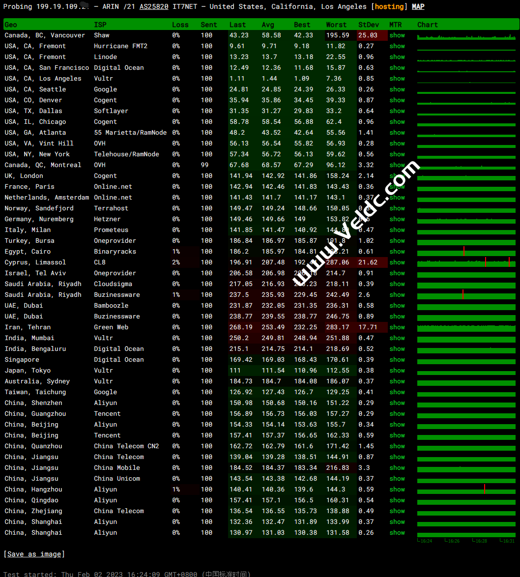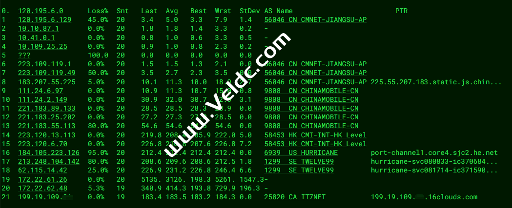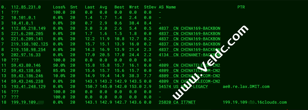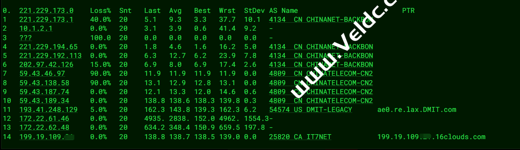 ---------------------------------------------------------------------- 广州电信 traceroute to 14.215.116.1 (14.215.116.1), 30 hops max, 32 byte packets 1 172.22.62.200 2.80 ms * 局域网 2 172.22.61.48 0.51 ms * 局域网 3 218.30.49.177 0.77 ms AS4134 美国, 加利福尼亚州, 洛杉矶, chinatelecom.com.cn, 电信 4 59.43.189.41 163.66 ms * 中国, 广东, 广州, chinatelecom.com.cn, 电信 5 * 6 59.43.130.105 150.37 ms * 中国, 广东, 广州, chinatelecom.com.cn, 电信 7 202.97.43.81 160.23 ms AS4134 中国, 广东, 广州, chinatelecom.com.cn, 电信 8 * 9 183.2.145.202 157.87 ms AS4134 中国, 广东, 广州, chinatelecom.com.cn, 电信 10 183.56.129.10 165.81 ms AS4134 中国, 广东, 广州, chinatelecom.com.cn, 电信 11 14.215.116.1 160.43 ms AS4134 中国, 广东, 广州, chinatelecom.com.cn, 电信 ---------------------------------------------------------------------- 上海电信 traceroute to 202.96.209.133 (202.96.209.133), 30 hops max, 32 byte packets 1 172.22.62.200 6.20 ms * 局域网 2 172.22.61.48 4.89 ms * 局域网 3 * 4 218.30.48.133 0.64 ms AS4134 美国, 加利福尼亚州, 洛杉矶, chinatelecom.com.cn, 电信 5 59.43.184.157 126.69 ms * 中国, 上海, chinatelecom.com.cn, 电信 6 * 7 59.43.130.217 126.99 ms * 中国, 上海, chinatelecom.com.cn, 电信 8 61.152.24.194 128.20 ms AS4812 中国, 上海, chinatelecom.com.cn, 电信 9 124.74.229.238 130.34 ms AS4812 中国, 上海, chinatelecom.com.cn, 电信 10 180.169.255.114 178.21 ms AS4812 中国, 上海, chinatelecom.com.cn, 电信 11 * 12 * 13 * 14 * 15 * 16 * 17 * 18 * 19 * 20 * 21 * 22 * 23 * 24 * 25 * 26 * 27 * 28 * 29 * 30 * ---------------------------------------------------------------------- 厦门电信 traceroute to 117.28.254.129 (117.28.254.129), 30 hops max, 32 byte packets 1 172.22.62.200 7.89 ms * 局域网 2 172.22.61.48 5.14 ms * 局域网 3 * 4 218.30.49.93 0.93 ms AS4134 美国, chinatelecom.com.cn, 电信 5 59.43.181.145 126.60 ms * 中国, 上海, chinatelecom.com.cn, 电信 6 * 7 59.43.130.217 125.47 ms * 中国, 上海, chinatelecom.com.cn, 电信 8 59.43.138.186 150.68 ms * 中国, 福建, chinatelecom.com.cn, 电信 9 * 10 27.159.81.214 153.10 ms AS133775 中国, 福建, 厦门, chinatelecom.com.cn, 电信 11 * 12 * 13 117.28.254.129 160.12 ms AS4809 中国, 福建, 厦门, chinatelecom.com.cn, 电信 ---------------------------------------------------------------------- 重庆联通 traceroute to 113.207.25.138 (113.207.25.138), 30 hops max, 32 byte packets 1 172.22.62.200 351.78 ms * 局域网 2 172.22.61.48 541.22 ms * 局域网 3 * 4 218.30.48.21 0.47 ms AS4134 美国, 加利福尼亚州, 洛杉矶, chinatelecom.com.cn, 电信 5 59.43.184.153 126.66 ms * 中国, 上海, chinatelecom.com.cn, 电信 6 * 7 * 8 59.43.46.85 148.68 ms * 中国, 北京, chinatelecom.com.cn, 电信 9 219.158.40.165 167.25 ms AS4837 中国, 北京, chinaunicom.com, 联通 10 * 11 219.158.12.70 175.92 ms AS4837 中国, 重庆, chinaunicom.com, 联通 12 * 13 * 14 * 15 * 16 * 17 * 18 * 19 * 20 * 21 * 22 * 23 * 24 * 25 * 26 * 27 * 28 * 29 * 30 * ---------------------------------------------------------------------- 成都联通 traceroute to 119.6.6.6 (119.6.6.6), 30 hops max, 32 byte packets 1 172.22.62.200 2.73 ms * 局域网 2 172.22.61.48 86.40 ms * 局域网 3 xe-3/2/0.re.lax.DMIT.com (193.41.248.189) 0.37 ms AS54574 美国, 加利福尼亚州, 洛杉矶, dmit.io 4 AS4809.re.lax.DMIT.com (193.41.248.130) 1.03 ms AS54574 美国, 加利福尼亚州, 洛杉矶, dmit.io 5 59.43.182.106 152.53 ms * 中国, 广东, 广州, chinatelecom.com.cn, 电信 6 * 7 * 8 219.158.38.245 150.73 ms AS4837 中国, 广东, 广州, chinaunicom.com, 联通 9 219.158.101.17 154.26 ms AS4837 中国, 广东, 广州, chinaunicom.com, 联通 10 219.158.102.186 186.40 ms AS4837 中国, 四川, 成都, chinaunicom.com, 联通 11 * 12 119.6.195.34 180.93 ms AS4837 中国, 四川, 成都, chinaunicom.com, 联通 13 * 14 * 15 * 16 * 17 * 18 * 19 * 20 * 21 * 22 * 23 * 24 * 25 * 26 * 27 * 28 * 29 * 30 * ---------------------------------------------------------------------- 上海移动 traceroute to 120.204.197.126 (120.204.197.126), 30 hops max, 32 byte packets 1 172.22.62.200 5.62 ms * 局域网 2 172.22.61.48 9.08 ms * 局域网 3 * 4 218.30.49.109 0.92 ms AS4134 美国, chinatelecom.com.cn, 电信 5 59.43.184.153 126.85 ms * 中国, 上海, chinatelecom.com.cn, 电信 6 * 7 59.43.138.45 135.61 ms * 中国, 上海, chinatelecom.com.cn, 电信 8 * 9 202.97.87.122 129.64 ms AS4134 中国, 上海, chinatelecom.com.cn, 电信 10 * 11 * 12 * 13 120.204.194.14 173.91 ms AS9808 中国, 上海, chinamobile.com, 移动 14 120.204.197.126 174.45 ms AS9808 中国, 上海, chinamobile.com, 移动 ---------------------------------------------------------------------- 成都移动 traceroute to 183.221.253.100 (183.221.253.100), 30 hops max, 32 byte packets 1 172.22.62.200 2.21 ms * 局域网 2 172.22.61.48 10.48 ms * 局域网 3 xe-3/2/0.re.lax.DMIT.com (193.41.248.189) 0.35 ms AS54574 美国, 加利福尼亚州, 洛杉矶, dmit.io 4 AS4809.re.lax.DMIT.com (193.41.248.130) 0.99 ms AS54574 美国, 加利福尼亚州, 洛杉矶, dmit.io 5 59.43.182.106 152.39 ms * 中国, 广东, 广州, chinatelecom.com.cn, 电信 6 * 7 59.43.130.101 162.73 ms * 中国, 广东, 广州, chinatelecom.com.cn, 电信 8 202.97.43.81 154.15 ms AS4134 中国, 广东, 广州, chinatelecom.com.cn, 电信 9 202.97.43.150 170.94 ms AS4134 中国, 四川, 成都, chinatelecom.com.cn, 电信 10 * 11 * 12 221.183.90.82 211.76 ms AS9808 中国, 四川, 成都, chinamobile.com, 移动 13 221.183.37.153 213.13 ms AS9808 中国, 北京, chinamobile.com, 移动 14 221.183.46.178 205.83 ms AS9808 中国, 北京, chinamobile.com, 移动 15 * 16 * 17 * 18 * 19 * 20 * 21 * 22 * 23 * 24 * 25 * 26 * 27 * 28 * 29 * 30 * ---------------------------------------------------------------------- 广东移动 traceroute to 211.139.145.129 (211.139.145.129), 30 hops max, 32 byte packets 1