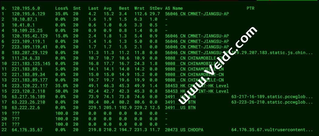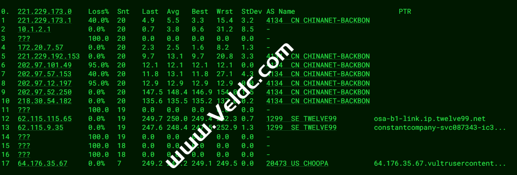 ---------------------------------------------------------------------- 广州电信 traceroute to 14.215.116.1 (14.215.116.1), 30 hops max, 32 byte packets 1 * 2 100.100.200.1 0.22 ms * 共享地址 3 10.105.0.73 0.64 ms * 局域网 4 10.105.0.9 0.39 ms * 局域网 5 63.222.22.5 0.81 ms AS3491,AS31713 日本, 东京都, 东京, pccw.com 6 * 7 218.30.53.86 115.54 ms AS4134 美国, 加利福尼亚州, 洛杉矶, chinatelecom.com.cn, 电信 8 * 9 * 10 202.97.12.34 261.39 ms AS4134 中国, 广东, 广州, chinatelecom.com.cn, 电信 11 * 12 58.63.249.34 274.37 ms AS4134 中国, 广东, 广州, chinatelecom.com.cn, 电信 13 121.14.50.222 263.73 ms AS4134 中国, 广东, 广州, chinatelecom.com.cn, 电信 14 14.215.116.1 276.13 ms AS4134 中国, 广东, 广州, chinatelecom.com.cn, 电信 ---------------------------------------------------------------------- 上海电信 traceroute to 202.96.209.133 (202.96.209.133), 30 hops max, 32 byte packets 1 * 2 100.100.200.1 0.22 ms * 共享地址 3 10.105.0.77 0.48 ms * 局域网 4 10.105.0.13 0.27 ms * 局域网 5 63.222.22.5 0.84 ms AS3491,AS31713 日本, 东京都, 东京, pccw.com 6 * 7 * 8 218.30.53.86 124.18 ms AS4134 美国, 加利福尼亚州, 洛杉矶, chinatelecom.com.cn, 电信 9 218.30.53.86 123.83 ms AS4134 美国, 加利福尼亚州, 洛杉矶, chinatelecom.com.cn, 电信 10 * 11 * 12 * 13 124.74.229.230 270.57 ms AS4812 中国, 上海, chinatelecom.com.cn, 电信 14 * 15 * 16 * 17 * 18 * 19 * 20 * 21 * 22 * 23 * 24 * 25 * 26 * 27 * 28 * 29 * 30 * ---------------------------------------------------------------------- 厦门电信 traceroute to 117.28.254.129 (117.28.254.129), 30 hops max, 32 byte packets 1 * 2 100.100.100.1 0.21 ms * 共享地址 3 10.105.0.69 7.93 ms * 局域网 4 10.105.0.5 0.42 ms * 局域网 5 osa-b1-link.ip.twelve99.net (62.115.9.34) 0.72 ms AS1299 日本, 大阪府, 大阪, telia.com 6 HundredGE0-5-0-0.br03.hkg15.pccwbtn.net (63.223.17.162) 60.09 ms AS3491,AS31713 中国, 香港, pccw.com 7 sjo-b23-link.ip.twelve99.net (62.115.113.82) 114.90 ms AS1299 美国, 加利福尼亚州, 圣何塞, telia.com 8 59.43.248.197 113.46 ms * 中国, 广东, 广州, chinatelecom.com.cn, 电信 9 59.43.248.201 62.18 ms * 中国, 广东, 广州, chinatelecom.com.cn, 电信 10 59.43.130.101 64.47 ms * 中国, 广东, 广州, chinatelecom.com.cn, 电信 11 59.43.130.153 66.45 ms * 中国, 广东, 广州, chinatelecom.com.cn, 电信 12 * 13 59.43.138.186 165.12 ms * 中国, 福建, chinatelecom.com.cn, 电信 14 * 15 27.159.81.210 275.17 ms AS133775 中国, 福建, 厦门, chinatelecom.com.cn, 电信 16 117.28.254.129 84.23 ms AS4809 中国, 福建, 厦门, chinatelecom.com.cn, 电信 ---------------------------------------------------------------------- 重庆联通 traceroute to 113.207.25.138 (113.207.25.138), 30 hops max, 32 byte packets 1 * 2 100.100.100.1 0.21 ms * 共享地址 3 10.105.0.69 0.84 ms * 局域网 4 10.105.0.9 0.32 ms * 局域网 5 10.105.0.1 0.35 ms * 局域网 6 * 7 * 8 mei-b5-link.ip.twelve99.net (62.115.116.196) 349.96 ms AS1299 法国, 普罗旺斯-阿尔卑斯-蓝色海岸大区, 马赛, telia.com 9 mei-b5-link.ip.twelve99.net (62.115.116.204) 293.39 ms AS1299 法国, 普罗旺斯-阿尔卑斯-蓝色海岸大区, 马赛, telia.com 10 ffm-b5-link.ip.twelve99.net (62.115.114.91) 289.28 ms AS1299 德国, 黑森州, 法兰克福, telia.com 11 ffm-b5-link.ip.twelve99.net (62.115.114.91) 294.01 ms AS1299 德国, 黑森州, 法兰克福, telia.com 12 219.158.13.141 341.74 ms AS4837 中国, 北京, chinaunicom.com, 联通 13 219.158.3.49 356.52 ms AS4837 中国, 北京, chinaunicom.com, 联通 14 219.158.3.49 329.70 ms AS4837 中国, 北京, chinaunicom.com, 联通 15 219.158.12.70 370.96 ms AS4837 中国, 重庆, chinaunicom.com, 联通 16 * 17 * 18 * 19 * 20 * 21 * 22 * 23 * 24 * 25 * 26 * 27 * 28 * 29 * 30 * ---------------------------------------------------------------------- 成都联通 traceroute to 119.6.6.6 (119.6.6.6), 30 hops max, 32 byte packets 1 * 2 100.100.100.1 0.25 ms * 共享地址 3 10.105.0.65 0.58 ms * 局域网 4 10.105.0.5 0.32 ms * 局域网 5 osa-b1-link.ip.twelve99.net (62.115.9.34) 0.80 ms AS1299 日本, 大阪府, 大阪, telia.com 6 osa-b1-link.ip.twelve99.net (62.115.9.34) 0.95 ms AS1299 日本, 大阪府, 大阪, telia.com 7 * 8 * 9 ffm-bb1-link.ip.twelve99.net (62.115.116.20) 356.16 ms AS1299 德国, 黑森州, 法兰克福, telia.com 10 ffm-bb2-link.ip.twelve99.net (62.115.124.60) 280.41 ms AS1299 德国, 黑森州, 法兰克福, telia.com 11 219.158.43.25 344.53 ms AS4837 德国, 黑森州, 法兰克福, chinaunicom.com, 联通 12 219.158.13.145 327.71 ms AS4837 中国, 北京, chinaunicom.com, 联通 13 219.158.111.214 345.35 ms AS4837 中国, 广东, 广州, chinaunicom.com, 联通 14 219.158.103.33 369.04 ms AS4837 中国, 广东, 广州, chinaunicom.com, 联通 15 219.158.3.213 390.11 ms AS4837 中国, 广东, 广州, chinaunicom.com, 联通 16 * 17 119.6.195.34 370.46 ms AS4837 中国, 四川, 成都, chinaunicom.com, 联通 18 119.6.197.142 391.40 ms AS4837 中国, 四川, 成都, chinaunicom.com, 联通 19 * 20 * 21 * 22 * 23 * 24 * 25 * 26 * 27 * 28 * 29 * 30 * ---------------------------------------------------------------------- 上海移动 traceroute to 120.204.197.126 (120.204.197.126), 30 hops max, 32 byte packets 1 * 2 100.100.100.1 0.28 ms * 共享地址 3 10.105.0.69 0.72 ms * 局域网 4 10.105.0.9 0.36 ms * 局域网 5 osa-b1-link.ip.twelve99.net (62.115.9.34) 0.82 ms AS1299 日本, 大阪府, 大阪, telia.com 6 * 7 * 8 * 9 port-b2-link.ip.twelve99.net (62.115.142.89) 100.10 ms AS1299 美国, 俄勒冈州, 波特兰, telia.com 10 sea-b3-link.ip.twelve99.net (62.115.139.133) 103.53 ms AS1299 美国, 华盛顿州, 西雅图, telia.com 11 sea-b1-link.ip.twelve99.net (62.115.132.157) 104.36 ms AS1299 美国, 华盛顿州, 西雅图, telia.com 12 * 13 223.120.6.53 118.33 ms AS58453 美国, 华盛顿州, 西雅图, chinamobile.com, 移动 14 223.120.7.70 122.36 ms AS5