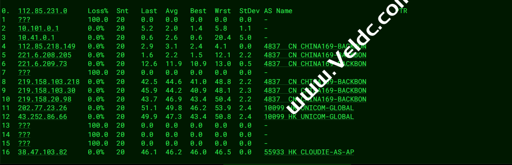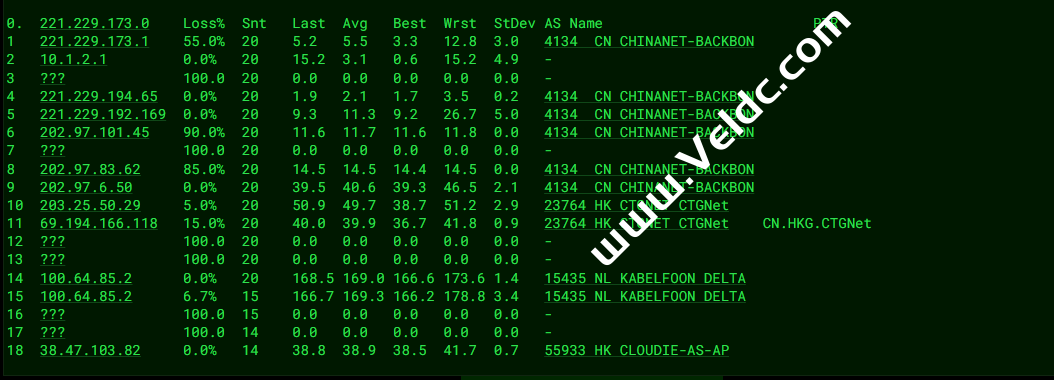 ---------------------------------------------------------------------- 广州电信 traceroute to 14.215.116.1 (14.215.116.1), 30 hops max, 32 byte packets 1 10.0.86.1 0.26 ms * 局域网 2 * 3 10.82.3.254 0.96 ms * 局域网 4 * 5 * 6 223.118.3.81 5.16 ms AS58453 中国, 香港, chinamobile.com, 移动 7 221.183.30.157 49.06 ms AS9808 中国, 广东, 广州, chinamobile.com, 移动 8 221.176.24.61 8.74 ms AS9808 中国, 广东, 广州, chinamobile.com, 移动 9 * 10 111.24.14.141 9.13 ms AS9808 中国, 广东, 广州, chinamobile.com, 移动 11 221.183.97.86 10.72 ms AS9808 中国, 广东, 广州, chinamobile.com, 移动 12 * 13 202.97.81.253 9.23 ms AS4134 中国, 广东, 广州, chinatelecom.com.cn, 电信 14 * 15 * 16 183.56.128.2 9.71 ms AS4134 中国, 广东, 广州, chinatelecom.com.cn, 电信 17 14.215.116.1 20.53 ms AS4134 中国, 广东, 广州, chinatelecom.com.cn, 电信 ---------------------------------------------------------------------- 上海电信 traceroute to 202.96.209.133 (202.96.209.133), 30 hops max, 32 byte packets 1 10.0.86.1 0.22 ms * 局域网 2 * 3 10.82.3.254 1.60 ms * 局域网 4 * 5 * 6 223.118.3.145 20.56 ms AS58453 中国, 香港, chinamobile.com, 移动 7 221.183.30.153 6.96 ms AS9808 中国, 广东, 广州, chinamobile.com, 移动 8 221.176.24.61 10.94 ms AS9808 中国, 广东, 广州, chinamobile.com, 移动 9 221.176.22.237 8.18 ms AS9808 中国, 广东, 广州, chinamobile.com, 移动 10 111.24.5.169 9.87 ms AS9808 中国, 广东, 广州, chinamobile.com, 移动 11 111.24.3.25 34.18 ms AS9808 中国, 上海, chinamobile.com, 移动 12 221.183.90.250 35.36 ms AS9808 中国, 上海, chinamobile.com, 移动 13 221.183.90.154 37.44 ms AS9808 中国, 上海, chinamobile.com, 移动 14 202.97.62.105 33.90 ms AS4134 中国, 上海, chinatelecom.com.cn, 电信 15 61.152.24.217 40.04 ms AS4812 中国, 上海, chinatelecom.com.cn, 电信 16 * 17 * 18 * 19 * 20 * 21 * 22 * 23 * 24 * 25 * 26 * 27 * 28 * 29 * 30 * ---------------------------------------------------------------------- 厦门电信 traceroute to 117.28.254.129 (117.28.254.129), 30 hops max, 32 byte packets 1 10.0.86.1 0.28 ms * 局域网 2 * 3 10.82.3.254 1.26 ms * 局域网 4 * 5 * 6 218.188.104.54 3.30 ms AS9304 中国, 香港, hgc.com.hk 7 59.43.188.121 15.22 ms * 中国, 广东, 广州, chinatelecom.com.cn, 电信 8 * 9 * 10 59.43.140.34 26.01 ms * 中国, 福建, chinatelecom.com.cn, 电信 11 110.80.128.94 36.83 ms AS133775 中国, 福建, 厦门, chinatelecom.com.cn, 电信 12 * 13 * 14 * 15 117.28.254.129 30.27 ms AS4809 中国, 福建, 厦门, chinatelecom.com.cn, 电信 ---------------------------------------------------------------------- 重庆联通 traceroute to 113.207.25.138 (113.207.25.138), 30 hops max, 32 byte packets 1 10.0.86.1 0.53 ms * 局域网 2 * 3 10.82.3.254 3.21 ms * 局域网 4 * 5 * 6 223.118.3.145 8.41 ms AS58453 中国, 香港, chinamobile.com, 移动 7 221.183.21.21 8.81 ms AS9808 中国, 香港, chinamobile.com, 移动 8 221.176.24.61 8.51 ms AS9808 中国, 广东, 广州, chinamobile.com, 移动 9 221.176.24.181 9.07 ms AS9808 中国, 广东, 广州, chinamobile.com, 移动 10 111.24.5.173 12.15 ms AS9808 中国, 广东, 广州, chinamobile.com, 移动 11 221.183.105.209 32.83 ms AS9808 中国, 重庆, chinamobile.com, 移动 12 221.183.90.134 39.08 ms AS9808 中国, 重庆, chinamobile.com, 移动 13 221.183.87.150 38.20 ms AS9808 中国, 重庆, chinamobile.com, 移动 14 * 15 * 16 * 17 * 18 * 19 * 20 * 21 * 22 * 23 * 24 * 25 * 26 * 27 * 28 * 29 * 30 * ---------------------------------------------------------------------- 成都联通 traceroute to 119.6.6.6 (119.6.6.6), 30 hops max, 32 byte packets 1 10.0.86.1 0.28 ms * 局域网 2 * 3 10.82.3.254 1.73 ms * 局域网 4 * 5 * 6 223.118.3.145 4.67 ms AS58453 中国, 香港, chinamobile.com, 移动 7 221.183.30.169 10.60 ms AS9808 中国, 广东, 广州, chinamobile.com, 移动 8 221.176.24.61 8.76 ms AS9808 中国, 广东, 广州, chinamobile.com, 移动 9 221.176.24.205 8.99 ms AS9808 中国, 广东, 广州, chinamobile.com, 移动 10 111.24.4.229 11.20 ms AS9808 中国, 广东, 广州, chinamobile.com, 移动 11 221.183.108.97 65.72 ms AS9808 中国, 四川, 成都, chinamobile.com, 移动 12 221.176.20.210 57.75 ms AS9808 中国, 四川, 成都, chinamobile.com, 移动 13 * 14 * 15 119.6.197.14 45.95 ms AS4837 中国, 四川, 成都, chinaunicom.com, 联通 16 119.6.195.38 44.71 ms AS4837 中国, 四川, 成都, chinaunicom.com, 联通 17 * 18 * 19 * 20 * 21 * 22 * 23 * 24 * 25 * 26 * 27 * 28 * 29 * 30 * ---------------------------------------------------------------------- 上海移动 traceroute to 120.204.197.126 (120.204.197.126), 30 hops max, 32 byte packets 1 10.0.86.1 0.29 ms * 局域网 2 * 3 10.82.3.254 1.02 ms * 局域网 4 * 5 * 6 134.159.128.214 67.75 ms AS4637 中国, 香港, telstra.com 7 223.120.2.117 30.03 ms AS58453 中国, 香港, chinamobile.com, 移动 8 * 9 221.183.89.182 57.81 ms AS9808 中国, 上海, chinamobile.com, 移动 10 221.183.89.69 58.66 ms AS9808 中国, 上海, chinamobile.com, 移动 11 * 12 * 13 120.204.194.14 106.68 ms AS9808 中国, 上海, chinamobile.com, 移动 14 120.204.197.126 75.36 ms AS9808 中国, 上海, chinamobile.com, 移动 ---------------------------------------------------------------------- 成都移动 traceroute to 183.221.253.100 (183.221.253.100), 30 hops max, 32 byte packets 1 10.0.86.1 0.29 ms * 局域网 2 * 3 10.82.3.254 2.03 ms * 局域网 4 * 5 * 6 134.159.128.214 41.28 ms AS4637 中国, 香港, telstra.com 7 * 8 * 9 221.183.89.182 65.58 ms AS9808 中国, 上海, chinamobile.com, 移动 10 221.183.89.33 58.91 ms AS9808 中国, 上海, chinamobile.com, 移动 11 221.183.89.14 70.65 ms AS9808 中国, 上海, chinamobile.com, 移动 12 * 13 221.183.46.178 73.11 ms AS9808 中国, 北京, chinamobile.com, 移动 14 * 15 * 16 * 17 * 18 * 19 * 20 * 21 * 22 * 23 * 24 * 25 * 26 * 27 * 28 * 29 * 30 * -----------------------------------------------------