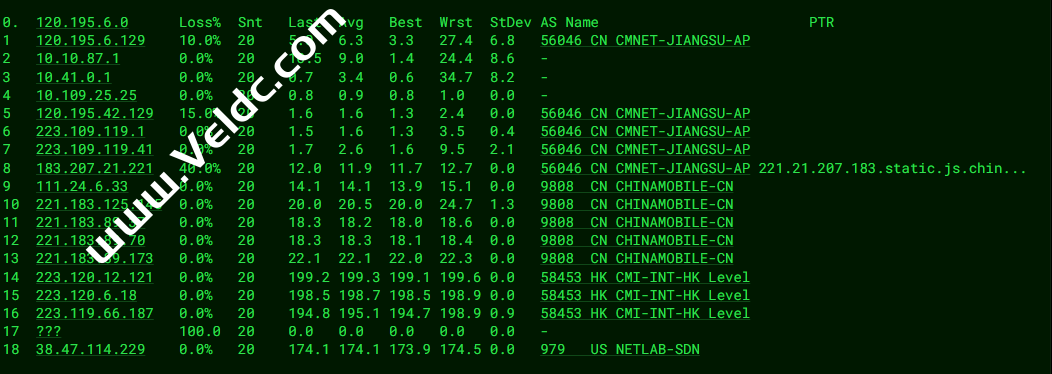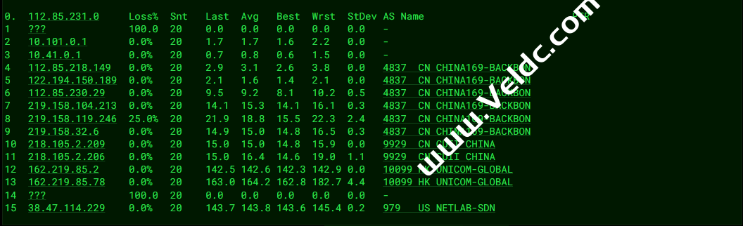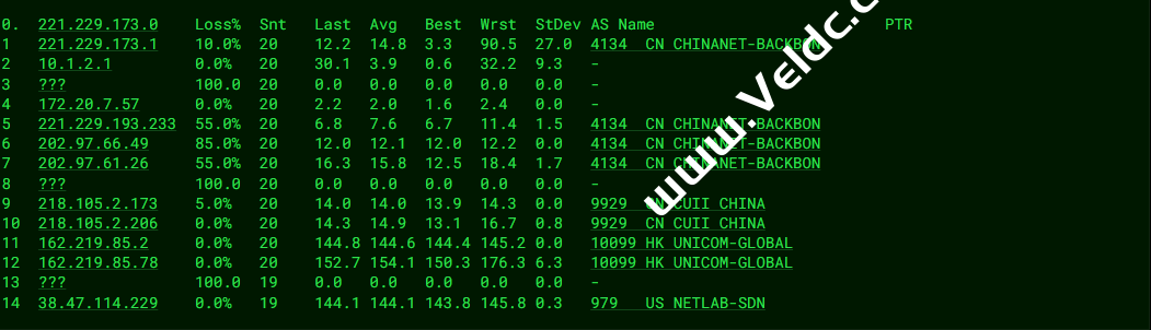 ---------------------------------------------------------------------- 广州电信 traceroute to 14.215.116.1 (14.215.116.1), 30 hops max, 32 byte packets 1 10.0.137.1 0.56 ms * 局域网 2 * 3 10.5.4.3 1.00 ms * 局域网 4 162.219.85.77 16.25 ms AS10099 美国, chinaunicom.com, 联通 5 203.160.75.218 132.25 ms AS10099 中国, 香港, chinaunicom.com, 联通 6 218.105.2.89 133.45 ms AS9929 中国, 上海, chinaunicom.com, 联通 7 218.105.131.181 155.77 ms AS9929 中国, 广东, 广州, chinaunicom.com, 联通 8 210.14.161.150 156.53 ms * 中国, 广东, 广州, chinaunicom.com, 联通 9 202.97.16.69 161.40 ms AS4134 中国, 广东, 广州, chinatelecom.com.cn, 电信 10 202.97.95.105 158.38 ms AS4134 中国, 广东, 广州, chinatelecom.com.cn, 电信 11 * 12 183.2.167.249 156.96 ms AS4134 中国, 广东, 广州, chinatelecom.com.cn, 电信 13 183.56.128.2 161.32 ms AS4134 中国, 广东, 广州, chinatelecom.com.cn, 电信 14 14.215.116.1 162.43 ms AS4134 中国, 广东, 广州, chinatelecom.com.cn, 电信 ---------------------------------------------------------------------- 上海电信 traceroute to 202.96.209.133 (202.96.209.133), 30 hops max, 32 byte packets 1 10.0.137.1 0.64 ms * 局域网 2 * 3 10.6.5.4 1.41 ms * 局域网 4 162.219.85.77 2.58 ms AS10099 美国, chinaunicom.com, 联通 5 162.219.85.5 131.63 ms AS10099 中国, 上海, chinaunicom.com, 联通 6 218.105.2.205 133.73 ms AS9929 中国, 上海, chinaunicom.com, 联通 7 218.105.2.174 133.19 ms AS9929 中国, 上海, chinaunicom.com, 联通 8 202.97.16.65 134.66 ms AS4134 中国, 上海, chinatelecom.com.cn, 电信 9 202.97.61.61 135.32 ms AS4134 中国, 上海, chinatelecom.com.cn, 电信 10 61.152.25.193 135.05 ms AS4812 中国, 上海, chinatelecom.com.cn, 电信 11 180.169.255.122 133.19 ms AS4812 中国, 上海, chinatelecom.com.cn, 电信 12 * 13 * 14 * 15 * 16 * 17 * 18 * 19 * 20 * 21 * 22 * 23 * 24 * 25 * 26 * 27 * 28 * 29 * 30 * ---------------------------------------------------------------------- 厦门电信 traceroute to 117.28.254.129 (117.28.254.129), 30 hops max, 32 byte packets 1 10.0.137.1 0.30 ms * 局域网 2 * 3 10.5.4.3 2.48 ms * 局域网 4 162.219.85.77 1.56 ms AS10099 美国, chinaunicom.com, 联通 5 162.219.85.1 130.54 ms AS10099 中国, 上海, chinaunicom.com, 联通 6 218.105.2.89 132.67 ms AS9929 中国, 上海, chinaunicom.com, 联通 7 218.105.2.150 132.99 ms AS9929 中国, 上海, chinaunicom.com, 联通 8 219.158.32.1 139.58 ms AS4837 中国, 上海, chinaunicom.com, 联通 9 219.158.40.174 139.97 ms AS4837 中国, 上海, chinaunicom.com, 联通 10 * 11 * 12 * 13 * 14 * 15 117.28.254.129 166.71 ms AS4809 中国, 福建, 厦门, chinatelecom.com.cn, 电信 ---------------------------------------------------------------------- 重庆联通 traceroute to 113.207.25.138 (113.207.25.138), 30 hops max, 32 byte packets 1 10.0.137.1 0.46 ms * 局域网 2 * 3 10.6.5.4 0.88 ms * 局域网 4 162.219.85.77 1.41 ms AS10099 美国, chinaunicom.com, 联通 5 162.219.85.9 133.08 ms AS10099 中国, 上海, chinaunicom.com, 联通 6 218.105.2.205 136.04 ms AS9929 中国, 上海, chinaunicom.com, 联通 7 * 8 * 9 210.14.178.106 164.92 ms * 中国, 重庆, chinaunicom.com, 联通 10 219.158.45.105 161.72 ms AS4837 中国, 重庆, chinaunicom.com, 联通 11 219.158.106.205 174.25 ms AS4837 中国, 重庆, chinaunicom.com, 联通 12 * 13 * 14 * 15 * 16 * 17 * 18 * 19 * 20 * 21 * 22 * 23 * 24 * 25 * 26 * 27 * 28 * 29 * 30 * ---------------------------------------------------------------------- 成都联通 traceroute to 119.6.6.6 (119.6.6.6), 30 hops max, 32 byte packets 1 10.0.137.1 0.46 ms * 局域网 2 * 3 10.6.5.4 0.85 ms * 局域网 4 162.219.85.77 0.97 ms AS10099 美国, chinaunicom.com, 联通 5 162.219.85.1 130.91 ms AS10099 中国, 上海, chinaunicom.com, 联通 6 218.105.2.205 133.02 ms AS9929 中国, 上海, chinaunicom.com, 联通 7 * 8 210.78.19.74 169.28 ms * 中国, 四川, 成都, chinaunicom.com, 联通 9 219.158.45.97 166.26 ms AS4837 中国, 四川, 成都, chinaunicom.com, 联通 10 * 11 * 12 119.6.195.38 165.18 ms AS4837 中国, 四川, 成都, chinaunicom.com, 联通 13 * 14 * 15 * 16 * 17 * 18 * 19 * 20 * 21 * 22 * 23 * 24 * 25 * 26 * 27 * 28 * 29 * 30 * ---------------------------------------------------------------------- 上海移动 traceroute to 120.204.197.126 (120.204.197.126), 30 hops max, 32 byte packets 1 10.0.137.1 0.32 ms * 局域网 2 * 3 10.5.4.3 0.70 ms * 局域网 4 162.219.85.77 1.24 ms AS10099 美国, chinaunicom.com, 联通 5 162.219.85.9 134.03 ms AS10099 中国, 上海, chinaunicom.com, 联通 6 218.105.2.93 130.26 ms AS9929 中国, 上海, chinaunicom.com, 联通 7 218.105.2.150 133.14 ms AS9929 中国, 上海, chinaunicom.com, 联通 8 221.183.89.33 182.01 ms AS9808 中国, 上海, chinamobile.com, 移动 9 * 10 * 11 * 12 120.204.197.126 185.82 ms AS9808 中国, 上海, chinamobile.com, 移动 ---------------------------------------------------------------------- 成都移动 traceroute to 183.221.253.100 (183.221.253.100), 30 hops max, 32 byte packets 1 10.0.137.1 0.35 ms * 局域网 2 * 3 10.5.4.3 7.52 ms * 局域网 4 162.219.85.77 1.08 ms AS10099 美国, chinaunicom.com, 联通 5 223.120.6.17 1.25 ms AS58453 美国, 加利福尼亚州, 洛杉矶, chinamobile.com, 移动 6 218.105.2.93 130.41 ms AS9929 中国, 上海, chinaunicom.com, 联通 7 218.105.2.150 132.87 ms AS9929 中国, 上海, chinaunicom.com, 联通 8 * 9 219.158.113.197 131.17 ms AS4837 中国, 上海, chinaunicom.com, 联通 10 219.158.100.54 167.23 ms AS4837 中国, 四川, 成都, chinaunicom.com, 联通 11 219.158.110.162 164.35 ms AS4837 中国, 四川, 成都, chinaunicom.com, 联通 12 221.183.128.125 192.69 ms AS9808 中国, 四川, 成都, chinamobile.com, 移动 13 * 14 221.183.37.237 199.11 ms AS9808 中国, 北京, chinamobile.com, 移动 15 221.183.46.174 203.56 ms AS9808 中国, 北京, chinamobile.com, 移动 16 * 17 * 18 * 19 * 20 * 21 * 22 * 23 * 24 * 25 * 26 * 27 * 28 * 2