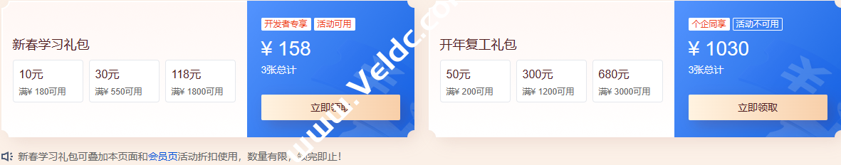 新春学习礼包限个人领取,有效期至2月28日;开年复工礼包个企同享,领取后30天内有效