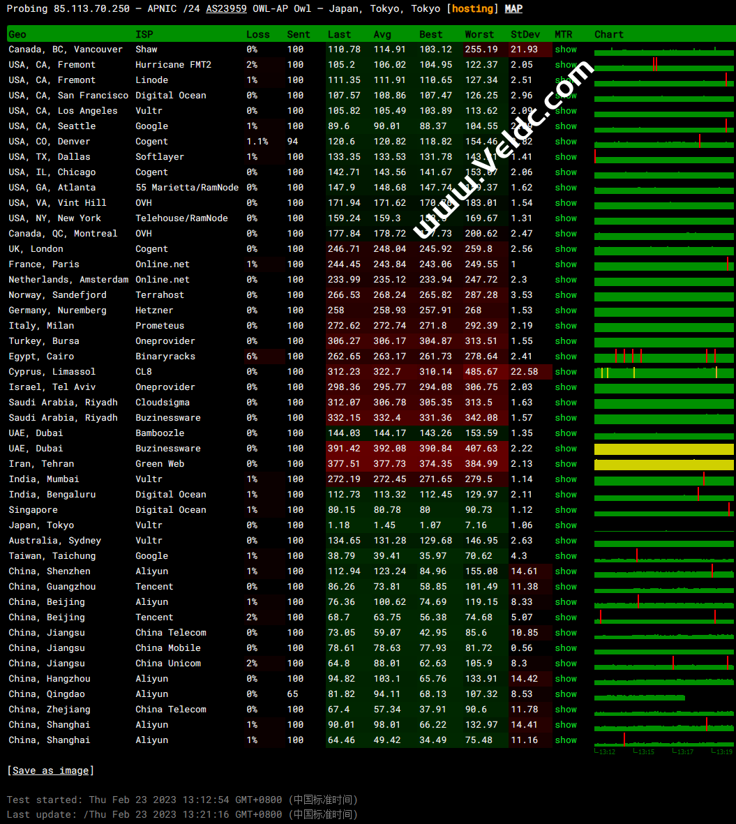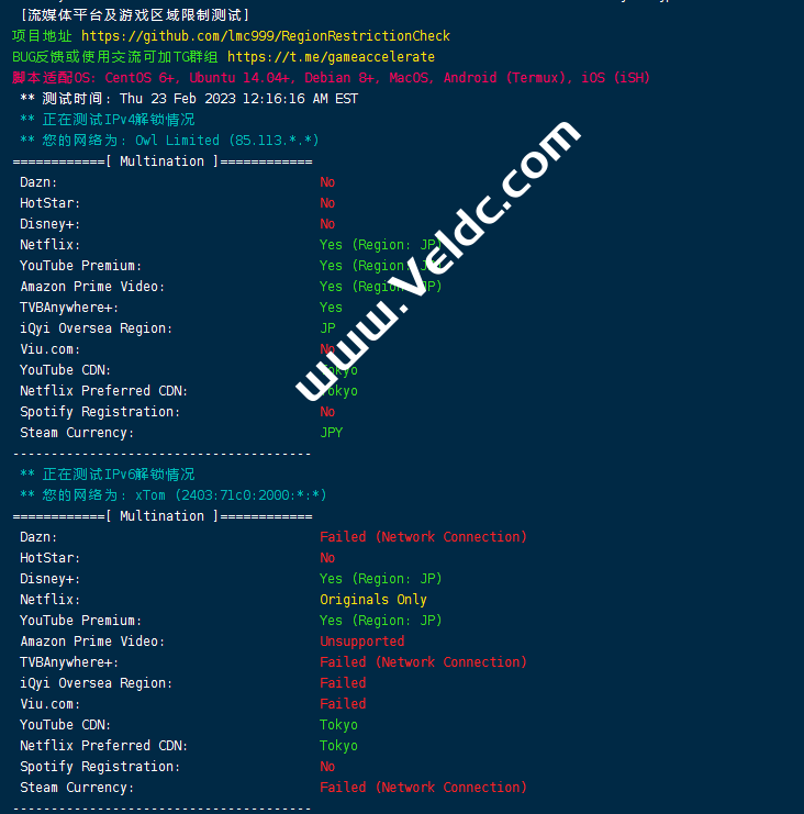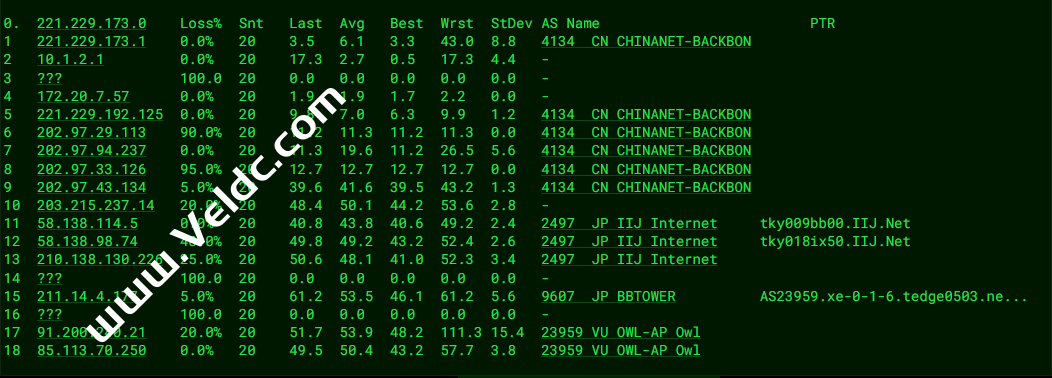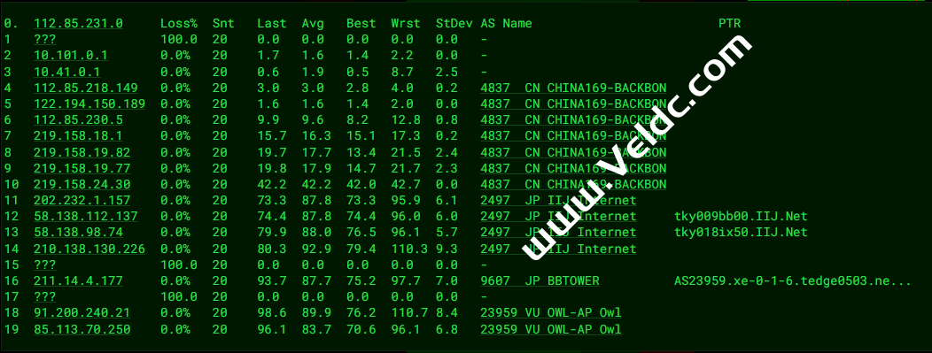 ---------------------------------------------------------------------- 广州电信 traceroute to 14.215.116.1 (14.215.116.1), 30 hops max, 32 byte packets 1 45.142.166.1 0.62 ms AS23959 日本, 东京都, 东京, hizakura.nl 2 * 3 91.200.240.71 0.63 ms AS23959 日本, 东京都, 东京, xtom.com 4 * 5 AS23959.xe-0-1-6.tedge0503.newote.bbtower.ad.jp (211.14.4.177) 0.54 ms AS9607 日本, 东京都, bbtower.co.jp 6 xe-0-1-6.tedge0503.newote.bbtower.ad.jp (211.14.4.178) 0.91 ms AS9607 日本, 东京都, bbtower.co.jp 7 172.29.0.10 0.58 ms * 局域网 8 210.138.130.225 0.76 ms AS2497 日本, 东京都, iij.ad.jp 9 tky001bb01.IIJ.Net (58.138.98.69) 0.92 ms AS2497 日本, 东京都, 东京, iij.ad.jp 10 tky001ix15.IIJ.Net (58.138.102.214) 2.37 ms AS2497 日本, 东京都, 东京, iij.ad.jp 11 203.215.236.65 1.84 ms AS4134 日本, 东京都, 东京, chinatelecom.com.cn, 电信 12 202.97.97.114 1.89 ms AS4134 日本, 东京都, 东京, chinatelecom.com.cn, 电信 13 * 14 202.97.12.10 54.80 ms AS4134 中国, 广东, 广州, chinatelecom.com.cn, 电信 15 202.97.91.13 55.16 ms AS4134 中国, 广东, 广州, chinatelecom.com.cn, 电信 16 * 17 113.96.4.226 64.92 ms AS4134 中国, 广东, 广州, chinatelecom.com.cn, 电信 18 183.56.128.10 57.10 ms AS4134 中国, 广东, 广州, chinatelecom.com.cn, 电信 19 14.215.116.1 57.55 ms AS4134 中国, 广东, 广州, chinatelecom.com.cn, 电信 ---------------------------------------------------------------------- 上海电信 traceroute to 202.96.209.133 (202.96.209.133), 30 hops max, 32 byte packets 1 45.142.166.1 0.52 ms AS23959 日本, 东京都, 东京, hizakura.nl 2 * 3 91.200.240.71 0.81 ms AS23959 日本, 东京都, 东京, xtom.com 4 * 5 AS23959.xe-0-1-6.tedge0503.newote.bbtower.ad.jp (211.14.4.177) 0.86 ms AS9607 日本, 东京都, bbtower.co.jp 6 xe-0-1-6.tedge0503.newote.bbtower.ad.jp (211.14.4.178) 0.70 ms AS9607 日本, 东京都, bbtower.co.jp 7 172.29.0.10 0.71 ms * 局域网 8 210.138.130.225 4.47 ms AS2497 日本, 东京都, iij.ad.jp 9 tky001bb01.IIJ.Net (58.138.98.69) 1.08 ms AS2497 日本, 东京都, 东京, iij.ad.jp 10 tky001ix11.IIJ.Net (58.138.102.206) 1.05 ms AS2497 日本, 东京都, 东京, iij.ad.jp 11 203.215.237.9 10.35 ms * 日本, 东京都, 东京, chinatelecom.com.cn, 电信 12 * 13 * 14 * 15 * 16 * 17 * 18 * 19 * 20 * 21 * 22 * 23 * 24 * 25 * 26 * 27 * 28 * 29 * 30 * ---------------------------------------------------------------------- 厦门电信 traceroute to 117.28.254.129 (117.28.254.129), 30 hops max, 32 byte packets 1 45.142.166.1 0.83 ms AS23959 日本, 东京都, 东京, hizakura.nl 2 * 3 91.200.240.71 0.70 ms AS23959 日本, 东京都, 东京, xtom.com 4 * 5 AS23959.xe-0-1-6.tedge0503.newote.bbtower.ad.jp (211.14.4.177) 0.50 ms AS9607 日本, 东京都, bbtower.co.jp 6 xe-0-1-6.tedge0503.newote.bbtower.ad.jp (211.14.4.178) 0.63 ms AS9607 日本, 东京都, bbtower.co.jp 7 172.29.0.10 0.80 ms * 局域网 8 unknown.telstraglobal.net (202.127.69.134) 3.24 ms AS4637 日本, 东京都, 东京, telstra.com 9 i-95.jtha-core02.telstraglobal.net (202.47.216.145) 3.45 ms AS4637 日本, 东京都, 东京, telstra.com 10 i-95.jtha-core02.telstraglobal.net (202.47.216.145) 88.19 ms AS4637 日本, 东京都, 东京, telstra.com 11 * 12 i-91.istt04.telstraglobal.net (202.84.224.197) 80.38 ms AS4637 新加坡, telstra.com 13 unknown.telstraglobal.net (210.57.30.22) 79.94 ms AS4637 新加坡, telstra.com 14 59.43.182.121 119.68 ms * 中国, 广东, 广州, chinatelecom.com.cn, 电信 15 * 16 * 17 59.43.140.34 142.01 ms * 中国, 福建, chinatelecom.com.cn, 电信 18 110.80.128.94 101.99 ms AS133775 中国, 福建, 厦门, chinatelecom.com.cn, 电信 19 * 20 * 21 * 22 117.28.254.129 146.03 ms AS4809 中国, 福建, 厦门, chinatelecom.com.cn, 电信 ---------------------------------------------------------------------- 重庆联通 traceroute to 113.207.25.138 (113.207.25.138), 30 hops max, 32 byte packets 1 45.142.166.1 0.58 ms AS23959 日本, 东京都, 东京, hizakura.nl 2 * 3 91.200.240.71 2.52 ms AS23959 日本, 东京都, 东京, xtom.com 4 * 5 AS23959.xe-0-1-6.tedge0503.newote.bbtower.ad.jp (211.14.4.177) 0.66 ms AS9607 日本, 东京都, bbtower.co.jp 6 xe-0-1-6.tedge0503.newote.bbtower.ad.jp (211.14.4.178) 0.82 ms AS9607 日本, 东京都, bbtower.co.jp 7 172.29.0.10 0.70 ms * 局域网 8 210.138.130.225 0.73 ms AS2497 日本, 东京都, iij.ad.jp 9 tky009bb00.IIJ.Net (58.138.98.73) 1.28 ms AS2497 日本, 东京都, 东京, iij.ad.jp 10 tky009ix03.IIJ.Net (58.138.112.138) 1.47 ms AS2497 日本, 东京都, 东京, iij.ad.jp 11 202.232.1.158 52.71 ms AS2497 日本, 东京都, 东京, iij.ad.jp 12 219.158.24.29 81.32 ms AS4837 中国, 上海, chinaunicom.com, 联通 13 219.158.113.118 88.28 ms AS4837 中国, 上海, chinaunicom.com, 联通 14 219.158.113.101 86.61 ms AS4837 中国, 上海, chinaunicom.com, 联通 15 219.158.106.254 122.34 ms AS4837 中国, 重庆, chinaunicom.com, 联通 16 * 17 * 18 * 19 * 20 * 21 * 22 * 23 * 24 * 25 * 26 * 27 * 28 * 29 * 30 * ---------------------------------------------------------------------- 成都联通 traceroute to 119.6.6.6 (119.6.6.6), 30 hops max, 32 byte packets 1 45.142.166.1 0.76 ms AS23959 日本, 东京都, 东京, hizakura.nl 2 * 3 91.200.240.71 4.26 ms AS23959 日本, 东京都, 东京, xtom.com 4 * 5 AS23959.xe-0-1-2.tedge0504.newote.bbtower.ad.jp (211.14.4.221) 1.21 ms AS9607 日本, 东京都, bbtower.co.jp 6 xe-0-1-2.tedge0504.newote.bbtower.ad.jp (211.14.4.222) 0.56 ms AS9607 日本, 东京都, bbtower.co.jp 7 172.29.0.10 0.71 ms * 局域网 8 210.138.130.225 0.75 ms AS2497 日本, 东京都, iij.ad.jp 9 tky009bb00.IIJ.Net (58.138.98.73) 1.40 ms AS2497 日本, 东京都, 东京, iij.ad.jp 10 tky009ix03.IIJ.Net (58.138.112.50) 1.31 ms AS2497 日本, 东京都, 东京, iij.ad.jp 11 202.232.1.158 51.10 ms AS2497 日本, 东京都, 东京, iij.ad.jp 12 219.158.30.69 94.34 ms AS4837 中国, 上海, chinaunicom.com, 联通 13 * 14 * 15 * 16 * 17 119.6.195.38 113.79 