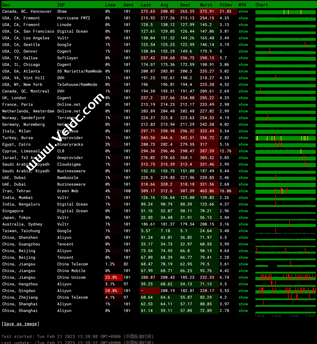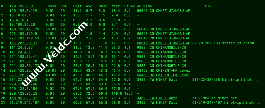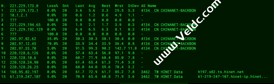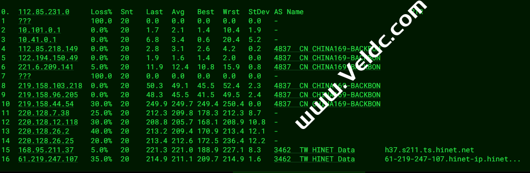 ---------------------------------------------------------------------- 广州电信 traceroute to 14.215.116.1 (14.215.116.1), 30 hops max, 32 byte packets 1 192.168.23.98 0.88 ms * 局域网 2 61-219-247-65.hinet-ip.hinet.net (61.219.247.65) 11.15 ms AS3462 中国, 台湾, 台北市, cht.com.tw 3 tpdt-3308.hinet.net (168.95.83.198) 1.93 ms AS3462 中国, 台湾, 台北市, cht.com.tw 4 tpdt-3032.hinet.net (220.128.27.94) 2.91 ms * 中国, 台湾, 台北市, cht.com.tw 5 tpdt-3011.hinet.net (220.128.26.5) 4.93 ms * 中国, 台湾, 台北市, cht.com.tw 6 r4105-s2.tp.hinet.net (220.128.10.5) 46.84 ms * 中国, 台湾, 台北市, cht.com.tw 7 r4005-s2.tp.hinet.net (220.128.6.125) 1.26 ms * 中国, 台湾, 台北市, cht.com.tw 8 * 9 202.97.12.38 29.89 ms AS4134 中国, 广东, 广州, chinatelecom.com.cn, 电信 10 202.97.89.157 32.09 ms AS4134 中国, 广东, 广州, chinatelecom.com.cn, 电信 11 113.96.4.66 30.27 ms AS4134 中国, 广东, 广州, chinatelecom.com.cn, 电信 12 183.58.35.22 41.32 ms AS4134 中国, 广东, 广州, chinatelecom.com.cn, 电信 13 * 14 14.215.116.1 37.26 ms AS4134 中国, 广东, 广州, chinatelecom.com.cn, 电信 ---------------------------------------------------------------------- 上海电信 traceroute to 202.96.209.133 (202.96.209.133), 30 hops max, 32 byte packets 1 192.168.23.98 0.64 ms * 局域网 2 61-219-247-65.hinet-ip.hinet.net (61.219.247.65) 13.05 ms AS3462 中国, 台湾, 台北市, cht.com.tw 3 tpdt-3307.hinet.net (168.95.80.198) 3.51 ms AS3462 中国, 台湾, 台北市, cht.com.tw 4 220-128-27-26.hinet-ip.hinet.net (220.128.27.26) 2.09 ms * 中国, 台湾, cht.com.tw 5 pcpd-3052.hinet.net (220.128.27.81) 2.05 ms * 中国, 台湾, 新北市, cht.com.tw 6 pcpd-4102.hinet.net (220.128.12.117) 1.39 ms * 中国, 台湾, 新北市, cht.com.tw 7 pcpd-4002.hinet.net (220.128.7.41) 4.96 ms * 中国, 台湾, 新北市, cht.com.tw 8 202.97.6.57 42.22 ms AS4134 中国, 上海, chinatelecom.com.cn, 电信 9 * 10 * 11 * 12 124.74.229.238 58.85 ms AS4812 中国, 上海, chinatelecom.com.cn, 电信 13 * 14 * 15 * 16 * 17 * 18 * 19 * 20 * 21 * 22 * 23 * 24 * 25 * 26 * 27 * 28 * 29 * 30 * ---------------------------------------------------------------------- 厦门电信 traceroute to 117.28.254.129 (117.28.254.129), 30 hops max, 32 byte packets 1 192.168.23.98 0.68 ms * 局域网 2 61-219-247-65.hinet-ip.hinet.net (61.219.247.65) 7.70 ms AS3462 中国, 台湾, 台北市, cht.com.tw 3 tpdt-3307.hinet.net (168.95.80.198) 1.46 ms AS3462 中国, 台湾, 台北市, cht.com.tw 4 tpdt-3032.hinet.net (220.128.2.50) 2.33 ms * 中国, 台湾, 台北市, cht.com.tw 5 220-128-2-153.hinet-ip.hinet.net (220.128.2.153) 4.91 ms * 中国, 台湾, 台北市, cht.com.tw 6 211-22-33-73.hinet-ip.hinet.net (211.22.33.73) 22.86 ms AS3462 中国, 香港, cht.com.tw 7 59.43.183.105 30.53 ms * 中国, 广东, 广州, chinatelecom.com.cn, 电信 8 * 9 * 10 59.43.140.34 51.80 ms * 中国, 福建, chinatelecom.com.cn, 电信 11 * 12 27.148.195.2 54.19 ms AS133775 中国, 福建, 厦门, chinatelecom.com.cn, 电信 13 * 14 * 15 117.28.254.129 60.72 ms AS4809 中国, 福建, 厦门, chinatelecom.com.cn, 电信 ---------------------------------------------------------------------- 重庆联通 traceroute to 113.207.25.138 (113.207.25.138), 30 hops max, 32 byte packets 1 192.168.23.98 0.43 ms * 局域网 2 61-219-247-65.hinet-ip.hinet.net (61.219.247.65) 16.66 ms AS3462 中国, 台湾, 台北市, cht.com.tw 3 tpdt-3308.hinet.net (168.95.82.198) 15.77 ms AS3462 中国, 台湾, 台北市, cht.com.tw 4 220-128-26-26.hinet-ip.hinet.net (220.128.26.26) 5.28 ms * 中国, 台湾, cht.com.tw 5 pcpd-3052.hinet.net (220.128.27.77) 1.30 ms * 中国, 台湾, 新北市, cht.com.tw 6 pcpd-4102.hinet.net (220.128.13.117) 5.17 ms * 中国, 台湾, 新北市, cht.com.tw 7 pcpd-4002.hinet.net (220.128.7.149) 6.87 ms * 中国, 台湾, 新北市, cht.com.tw 8 219.158.44.53 175.27 ms AS4837 中国, 广东, 广州, chinaunicom.com, 联通 9 219.158.4.125 180.88 ms AS4837 中国, 广东, 广州, chinaunicom.com, 联通 10 219.158.3.21 182.17 ms AS4837 中国, 广东, 广州, chinaunicom.com, 联通 11 219.158.99.210 209.82 ms AS4837 中国, 重庆, chinaunicom.com, 联通 12 * 13 * 14 * 15 * 16 * 17 * 18 * 19 * 20 * 21 * 22 * 23 * 24 * 25 * 26 * 27 * 28 * 29 * 30 * ---------------------------------------------------------------------- 成都联通 traceroute to 119.6.6.6 (119.6.6.6), 30 hops max, 32 byte packets 1 192.168.23.98 0.80 ms * 局域网 2 61-219-247-65.hinet-ip.hinet.net (61.219.247.65) 14.09 ms AS3462 中国, 台湾, 台北市, cht.com.tw 3 tpdt-3308.hinet.net (168.95.82.198) 6.06 ms AS3462 中国, 台湾, 台北市, cht.com.tw 4 220-128-26-26.hinet-ip.hinet.net (220.128.26.26) 4.33 ms * 中国, 台湾, cht.com.tw 5 pcpd-3052.hinet.net (220.128.27.77) 19.66 ms * 中国, 台湾, 新北市, cht.com.tw 6 pcpd-4102.hinet.net (220.128.12.117) 5.22 ms * 中国, 台湾, 新北市, cht.com.tw 7 pcpd-4002.hinet.net (220.128.7.37) 5.35 ms * 中国, 台湾, 新北市, cht.com.tw 8 219.158.44.53 183.36 ms AS4837 中国, 广东, 广州, chinaunicom.com, 联通 9 * 10 219.158.8.121 175.82 ms AS4837 中国, 广东, 广州, chinaunicom.com, 联通 11 * 12 * 13 119.6.195.38 214.89 ms AS4837 中国, 四川, 成都, chinaunicom.com, 联通 14 * 15 * 16 * 17 * 18 * 19 * 20 * 21 * 22 * 23 * 24 * 25 * 26 * 27 * 28 * 29 * 30 * ---------------------------------------------------------------------- 上海移动 traceroute to 120.204.197.126 (120.204.197.126), 30 hops max, 32 byte packets 1 192.168.23.98 0.76 ms * 局域网 2 61-219-247-65.hinet-ip.hinet.net (61.219.247.65) 15.02 ms AS3462 中国, 台湾, 台北市, cht.com.tw 3 tpdt-3308.hinet.net (168.95.211.38) 1.05 ms AS3462 中国, 台湾, 台北市, cht.com.tw 4 tpdb-3031.hinet.net (220.128.1.50) 5.82 ms * 中国, 台湾, 台北市, cht.com.tw 5 220-128-1-41.hinet-ip.hinet.net (220.128.1.41) 1.22 ms * 中国, 台湾, 台北市, cht.com.tw 6 220-128-6-233.hinet-ip.hinet