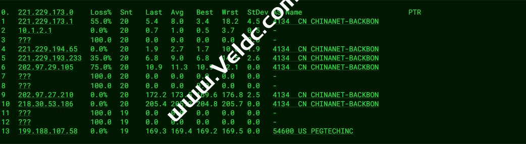 ---------------------------------------------------------------------- 广州电信 traceroute to 14.215.116.1 (14.215.116.1), 30 hops max, 32 byte packets 1 199.188.107.62 0.81 ms AS54600 美国, 加利福尼亚州, 圣何塞, petaexpress.com 2 10.255.254.6 0.97 ms * 局域网 3 10.255.254.76 1.17 ms * 局域网 4 218.30.53.185 4.88 ms AS4134 美国, 加利福尼亚州, 圣何塞, chinatelecom.com.cn, 电信 5 * 6 202.97.12.22 182.73 ms AS4134 中国, 广东, 广州, chinatelecom.com.cn, 电信 7 * 8 * 9 113.96.4.230 177.10 ms AS4134 中国, 广东, 广州, chinatelecom.com.cn, 电信 10 * 11 14.215.116.1 155.62 ms AS4134 中国, 广东, 广州, chinatelecom.com.cn, 电信 ---------------------------------------------------------------------- 上海电信 traceroute to 202.96.209.133 (202.96.209.133), 30 hops max, 32 byte packets 1 199.188.107.62 0.74 ms AS54600 美国, 加利福尼亚州, 圣何塞, petaexpress.com 2 10.255.254.6 0.92 ms * 局域网 3 10.255.255.18 1.26 ms * 局域网 4 nbo-link.telia.net (62.115.44.132) 1.23 ms AS1299 美国, 加利福尼亚州, 圣何塞, telia.com 5 218.30.54.181 3.03 ms AS4134 美国, 加利福尼亚州, 圣何塞, chinatelecom.com.cn, 电信 6 * 7 * 8 * 9 61.152.25.141 134.76 ms AS4812 中国, 上海, chinatelecom.com.cn, 电信 10 180.169.255.118 144.02 ms AS4812 中国, 上海, chinatelecom.com.cn, 电信 11 180.169.255.122 240.43 ms AS4812 中国, 上海, chinatelecom.com.cn, 电信 12 * 13 * 14 * 15 * 16 * 17 * 18 * 19 * 20 * 21 * 22 * 23 * 24 * 25 * 26 * 27 * 28 * 29 * 30 * ---------------------------------------------------------------------- 厦门电信 traceroute to 117.28.254.129 (117.28.254.129), 30 hops max, 32 byte packets 1 199.188.107.62 0.78 ms AS54600 美国, 加利福尼亚州, 圣何塞, petaexpress.com 2 10.255.254.6 0.78 ms * 局域网 3 10.255.255.18 1.36 ms * 局域网 4 nbo-link.telia.net (62.115.44.132) 0.97 ms AS1299 美国, 加利福尼亚州, 圣何塞, telia.com 5 sjo-b1-link.ip.twelve99.net (62.115.125.161) 1.20 ms AS1299 美国, 加利福尼亚州, 圣何塞, telia.com 6 chinatelecom-ic307264-sjo-b21.ip.twelve99-cust.net (80.239.132.158) 1.42 ms AS1299 美国, 加利福尼亚州, 圣何塞, telia.com 7 59.43.181.157 126.49 ms * 中国, 上海, chinatelecom.com.cn, 电信 8 * 9 59.43.130.217 128.72 ms * 中国, 上海, chinatelecom.com.cn, 电信 10 59.43.138.186 155.42 ms * 中国, 福建, chinatelecom.com.cn, 电信 11 * 12 27.148.195.98 147.12 ms AS133775 中国, 福建, 厦门, chinatelecom.com.cn, 电信 13 * 14 * 15 117.28.254.129 164.25 ms AS4809 中国, 福建, 厦门, chinatelecom.com.cn, 电信 ---------------------------------------------------------------------- 重庆联通 traceroute to 113.207.25.138 (113.207.25.138), 30 hops max, 32 byte packets 1 199.188.107.62 0.81 ms AS54600 美国, 加利福尼亚州, 圣何塞, petaexpress.com 2 10.255.254.6 0.82 ms * 局域网 3 10.255.254.87 1.36 ms * 局域网 4 219.158.45.177 6.53 ms AS4837 美国, 加利福尼亚州, 圣何塞, chinaunicom.com, 联通 5 219.158.6.5 128.95 ms AS4837 中国, 上海, chinaunicom.com, 联通 6 219.158.113.122 128.81 ms AS4837 中国, 上海, chinaunicom.com, 联通 7 219.158.113.105 129.13 ms AS4837 中国, 上海, chinaunicom.com, 联通 8 219.158.12.98 155.16 ms AS4837 中国, 重庆, chinaunicom.com, 联通 9 * 10 * 11 * 12 * 13 * 14 * 15 * 16 * 17 * 18 * 19 * 20 * 21 * 22 * 23 * 24 * 25 * 26 * 27 * 28 * 29 * 30 * ---------------------------------------------------------------------- 成都联通 traceroute to 119.6.6.6 (119.6.6.6), 30 hops max, 32 byte packets 1 199.188.107.62 2.37 ms AS54600 美国, 加利福尼亚州, 圣何塞, petaexpress.com 2 10.255.254.6 0.74 ms * 局域网 3 10.255.254.87 1.26 ms * 局域网 4 219.158.45.177 2.03 ms AS4837 美国, 加利福尼亚州, 圣何塞, chinaunicom.com, 联通 5 219.158.116.237 136.37 ms AS4837 中国, 上海, chinaunicom.com, 联通 6 219.158.113.138 131.72 ms AS4837 中国, 上海, chinaunicom.com, 联通 7 219.158.113.109 139.28 ms AS4837 中国, 上海, chinaunicom.com, 联通 8 * 9 * 10 119.6.195.34 163.20 ms AS4837 中国, 四川, 成都, chinaunicom.com, 联通 11 * 12 * 13 * 14 * 15 * 16 * 17 * 18 * 19 * 20 * 21 * 22 * 23 * 24 * 25 * 26 * 27 * 28 * 29 * 30 * ---------------------------------------------------------------------- 上海移动 traceroute to 120.204.197.126 (120.204.197.126), 30 hops max, 32 byte packets 1 199.188.107.62 0.80 ms AS54600 美国, 加利福尼亚州, 圣何塞, petaexpress.com 2 10.255.254.6 1.18 ms * 局域网 3 10.255.254.190 1.19 ms * 局域网 4 223.119.66.53 1.34 ms AS58453 美国, 加利福尼亚州, 圣何塞, chinamobile.com, 移动 5 223.120.6.69 1.02 ms AS58453 美国, 加利福尼亚州, 圣何塞, chinamobile.com, 移动 6 223.120.12.142 183.02 ms AS58453 中国, 上海, chinamobile.com, 移动 7 221.183.89.170 184.90 ms AS9808 中国, 上海, chinamobile.com, 移动 8 * 9 * 10 * 11 120.204.194.6 186.78 ms AS9808 中国, 上海, chinamobile.com, 移动 12 120.204.194.14 190.03 ms AS9808 中国, 上海, chinamobile.com, 移动 13 120.204.197.126 187.31 ms AS9808 中国, 上海, chinamobile.com, 移动 ---------------------------------------------------------------------- 成都移动 traceroute to 183.221.253.100 (183.221.253.100), 30 hops max, 32 byte packets 1 199.188.107.62 0.89 ms AS54600 美国, 加利福尼亚州, 圣何塞, petaexpress.com 2 10.255.254.6 0.74 ms * 局域网 3 10.255.254.76 1.21 ms * 局域网 4 223.119.66.168 1.41 ms AS58453 美国, 加利福尼亚州, 圣何塞, chinamobile.com, 移动 5 223.120.6.225 18.96 ms AS58453 美国, chinamobile.com, 移动 6 223.120.12.138 183.99 ms AS58453 中国, 上海, chinamobile.com, 移动 7 223.120.12.170 187.35 ms AS58453 中国, 上海, chinamobile.com, 移动 8 221.183.89.69 183.74 ms AS9808 中国, 上海, chinamobile.com, 移动 9 * 10 * 11 221.183.46.178 211.81 ms AS9808 中国, 北京, chinamobile.com, 移动 12 * 13 * 14 * 15 * 16 * 17 * 18 * 19 * 20 * 21 * 22 * 23