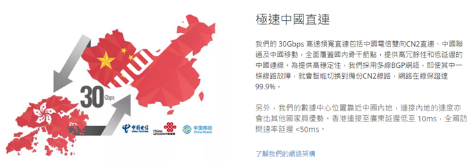 我們以多條10G、40G及100G光纖連接CN2、香港本地及世界各大電信商,高速接通全世界網路、更為您提供後備線路,當主線路故障時會自動切換後備線路。