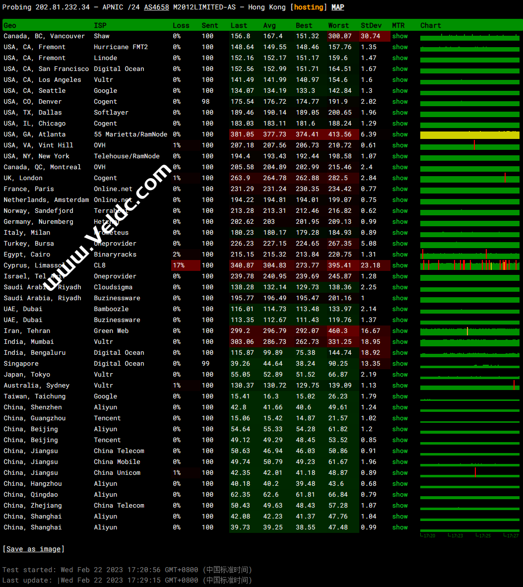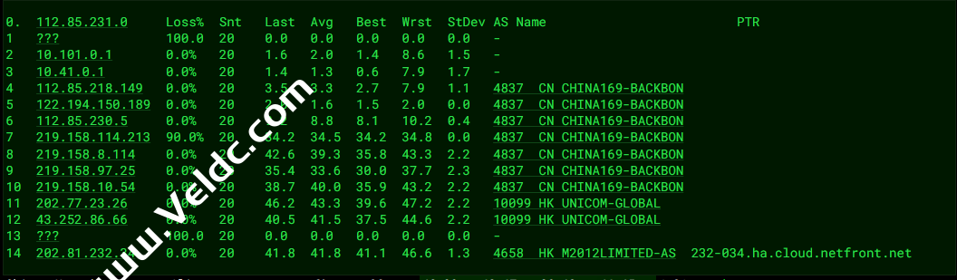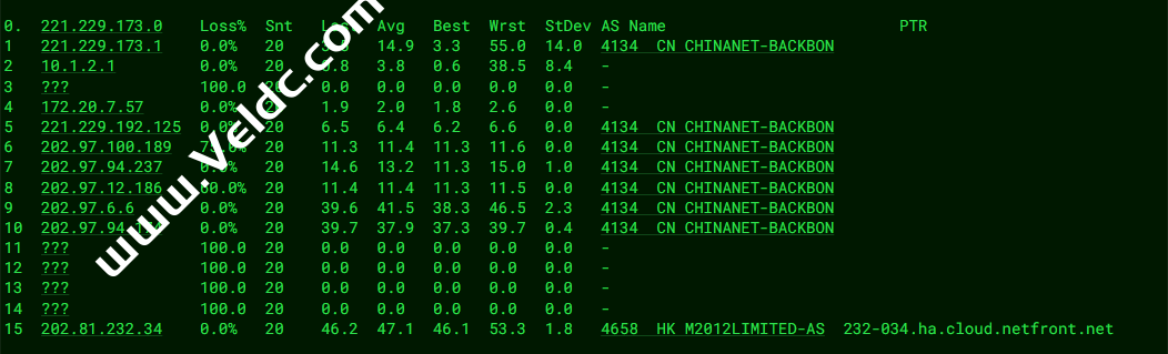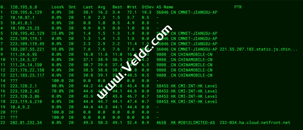 ---------------------------------------------------------------------- 广州电信 traceroute to 14.215.116.1 (14.215.116.1), 30 hops max, 32 byte packets 1 * 2 * 3 * 4 * 5 * 6 * 7 * 8 * 9 * 10 * 11 * 12 113.96.4.74 40.78 ms AS4134 中国, 广东, 广州, chinatelecom.com.cn, 电信 13 58.63.249.30 37.26 ms AS4134 中国, 广东, 广州, chinatelecom.com.cn, 电信 14 * 15 14.215.116.1 39.80 ms AS4134 中国, 广东, 广州, chinatelecom.com.cn, 电信 ---------------------------------------------------------------------- 上海电信 traceroute to 202.96.209.133 (202.96.209.133), 30 hops max, 32 byte packets 1 * 2 * 3 * 4 * 5 * 6 * 7 * 8 * 9 * 10 * 11 61.152.24.73 34.16 ms AS4812 中国, 上海, chinatelecom.com.cn, 电信 12 124.74.229.238 34.86 ms AS4812 中国, 上海, chinatelecom.com.cn, 电信 13 180.169.255.118 34.19 ms AS4812 中国, 上海, chinatelecom.com.cn, 电信 14 * 15 * 16 * 17 * 18 * 19 * 20 * 21 * 22 * 23 * 24 * 25 * 26 * 27 * 28 * 29 * 30 * ---------------------------------------------------------------------- 厦门电信 traceroute to 117.28.254.129 (117.28.254.129), 30 hops max, 32 byte packets 1 * 2 * 3 * 4 59.43.248.245 9.83 ms * 中国, 广东, 广州, chinatelecom.com.cn, 电信 5 * 6 * 7 59.43.46.214 26.03 ms * 中国, 福建, 福州, chinatelecom.com.cn, 电信 8 * 9 * 10 * 11 * 12 117.28.254.129 28.88 ms AS4809 中国, 福建, 厦门, chinatelecom.com.cn, 电信 ---------------------------------------------------------------------- 重庆联通 traceroute to 113.207.25.138 (113.207.25.138), 30 hops max, 32 byte packets 1 * 2 * 3 * 4 * 5 * 6 * 7 * 8 * 9 * 10 * 11 * 12 * 13 * 14 * 15 * 16 * 17 * 18 * 19 * 20 * 21 * 22 * 23 * 24 * 25 * 26 * 27 * 28 * 29 * 30 * ---------------------------------------------------------------------- 成都联通 traceroute to 119.6.6.6 (119.6.6.6), 30 hops max, 32 byte packets 1 * 2 * 3 * 4 * 5 * 6 * 7 * 8 * 9 119.6.197.10 38.57 ms AS4837 中国, 四川, 成都, chinaunicom.com, 联通 10 119.6.195.38 38.33 ms AS4837 中国, 四川, 成都, chinaunicom.com, 联通 11 * 12 * 13 * 14 * 15 * 16 * 17 * 18 * 19 * 20 * 21 * 22 * 23 * 24 * 25 * 26 * 27 * 28 * 29 * 30 * ---------------------------------------------------------------------- 上海移动 traceroute to 120.204.197.126 (120.204.197.126), 30 hops max, 32 byte packets 1 * 2 * 3 * 4 * 5 * 6 * 7 * 8 * 9 * 10 120.204.197.126 38.40 ms AS9808 中国, 上海, chinamobile.com, 移动 ---------------------------------------------------------------------- 成都移动 traceroute to 183.221.253.100 (183.221.253.100), 30 hops max, 32 byte packets 1 * 2 * 3 * 4 * 5 * 6 * 7 * 8 * 9 * 10 * 11 * 12 * 13 * 14 * 15 * 16 * 17 * 18 * 19 * 20 * 21 * 22 * 23 * 24 * 25 * 26 * 27 * 28 * 29 * 30 * ---------------------------------------------------------------------- 广东移动 traceroute to 211.139.145.129 (211.139.145.129), 30 hops max, 32 byte packets 1 * 2 * 3 * 4 * 5 * 6 * 7 * 8 * 9 * 10 211.136.249.146 15.50 ms AS56040 中国, 广东, 广州, chinamobile.com, 移动 11 183.235.228.62 22.75 ms AS56040 中国, 广东, 惠州, chinamobile.com, 移动 12 211.136.241.254 20.75 ms AS56040 中国, 广东, 惠州, chinamobile.com, 移动 13 120.198.26.254 33.09 ms AS56040 中国, 广东, 惠州, chinamobile.com, 移动 14 * 15 * 16 211.139.145.129 21.58 ms AS56040 中国, 广东, 惠州, chinamobile.com, 移动 ---------------------------------------------------------------------- 成都教育网 traceroute to 202.112.14.151 (202.112.14.151), 30 hops max, 32 byte packets 1 * 2 * 3 * 4 202.153.88.197 2.52 ms AS24077 中国, 香港, telekommalaysia.com.hk 5 202.55.1.173 3.00 ms AS4809 中国, 香港, chinatelecom.com.cn, 电信 6 69.194.186.173 2.82 ms AS32505 美国, 路易斯安那州, conterra.com 7 * 8 * 9 59.43.130.105 12.54 ms * 中国, 广东, 广州, chinatelecom.com.cn, 电信 10 * 11 202.97.81.254 15.19 ms AS4134 中国, 广东, 广州, chinatelecom.com.cn, 电信 12 * 13 * 14 101.4.116.90 108.57 ms AS4538 中国, 四川, 成都, edu.cn, 教育网 15 * 16 202.115.254.246 61.14 ms AS4538 中国, 四川, 成都, 四川教育和科研计算机网, edu.cn, 教育网 17 202.115.0.1 63.08 ms AS4538,AS24355 中国, 四川, 成都, 电子科技大学, edu.cn, 教育网 18 * 19 * 20 * 21 * 22 * 23 * 24 * 25 * 26 * 27 * 28 * 29 * 30 * ----------------------------------------------------------------------