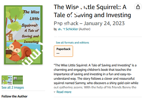 他在几个小时内就创作出了一本30页的儿童故事书,名为《聪明的小松鼠:储蓄与投资的故事》,并在1月份通过亚马逊的自助出版出售,电子书定价2.99美元,印刷版售价9.99美元。