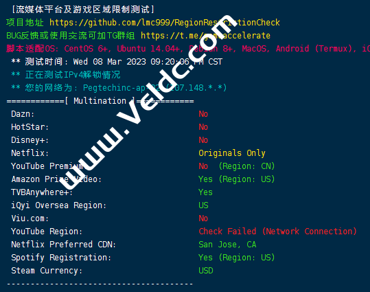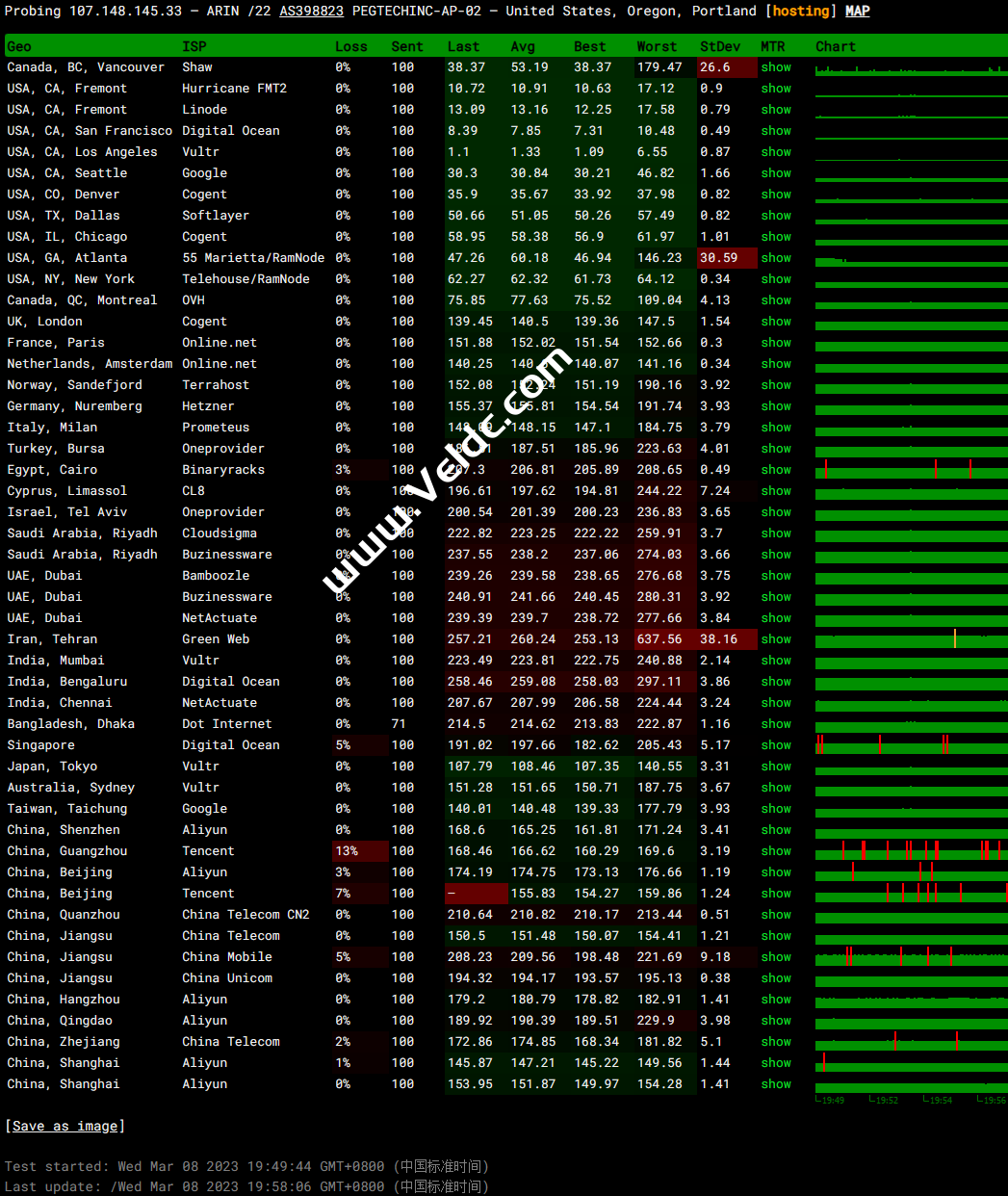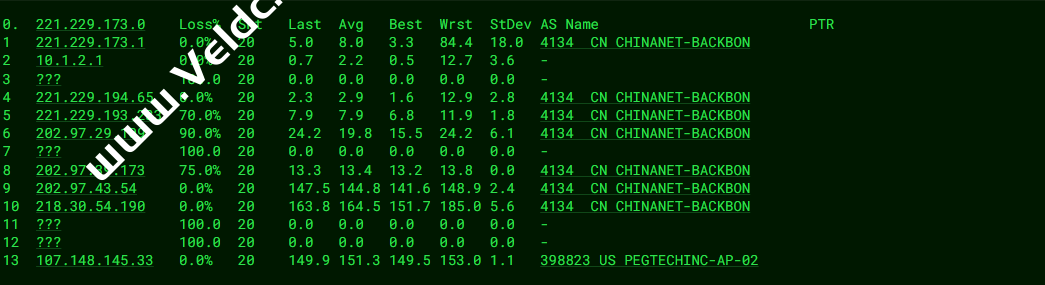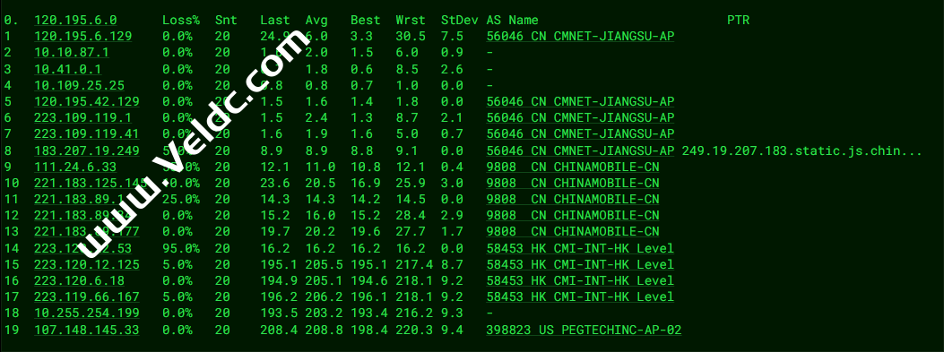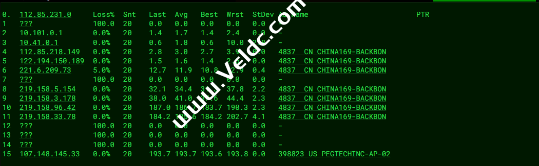 ---------------------------------------------------------------------- 广州电信 traceroute to 14.215.116.1 (14.215.116.1), 30 hops max, 32 byte packets 1 107.148.133.254 0.66 ms AS398823 美国, 加利福尼亚州, 洛杉矶, petaexpress.com 2 10.255.254.205 0.88 ms * 局域网 3 218.30.53.69 7.22 ms AS4134 美国, 加利福尼亚州, 洛杉矶, chinatelecom.com.cn, 电信 4 202.97.86.137 154.52 ms AS4134 中国, 广东, 广州, chinatelecom.com.cn, 电信 5 202.97.65.90 164.45 ms AS4134 中国, 广东, 广州, chinatelecom.com.cn, 电信 6 202.97.94.141 158.23 ms AS4134 中国, 广东, 广州, chinatelecom.com.cn, 电信 7 * 8 183.58.35.26 160.17 ms AS4134 中国, 广东, 广州, chinatelecom.com.cn, 电信 9 183.56.129.10 158.46 ms AS4134 中国, 广东, 广州, chinatelecom.com.cn, 电信 10 14.215.116.1 166.67 ms AS4134 中国, 广东, 广州, chinatelecom.com.cn, 电信 ---------------------------------------------------------------------- 上海电信 traceroute to 202.96.209.133 (202.96.209.133), 30 hops max, 32 byte packets 1 107.148.133.254 0.84 ms AS398823 美国, 加利福尼亚州, 洛杉矶, petaexpress.com 2 10.255.254.205 0.85 ms * 局域网 3 218.30.53.69 6.15 ms AS4134 美国, 加利福尼亚州, 洛杉矶, chinatelecom.com.cn, 电信 4 * 5 * 6 * 7 * 8 180.169.255.122 144.88 ms AS4812 中国, 上海, chinatelecom.com.cn, 电信 9 * 10 * 11 * 12 * 13 * 14 * 15 * 16 * 17 * 18 * 19 * 20 * 21 * 22 * 23 * 24 * 25 * 26 * 27 * 28 * 29 * 30 * ---------------------------------------------------------------------- 厦门电信 traceroute to 117.28.254.129 (117.28.254.129), 30 hops max, 32 byte packets 1 107.148.133.254 0.75 ms AS398823 美国, 加利福尼亚州, 洛杉矶, petaexpress.com 2 10.255.254.198 0.91 ms * 局域网 3 * 4 * 5 * 6 * 7 * 8 chinatelecomglobal-as4809.sgix.sg (103.16.102.53) 189.65 ms * 新加坡, sgix.sg 9 59.43.249.181 189.70 ms * 新加坡, chinatelecom.com.cn, 电信 10 59.43.184.121 189.69 ms * 中国, 广东, 广州, chinatelecom.com.cn, 电信 11 * 12 59.43.16.181 193.72 ms * 中国, 广东, 广州, chinatelecom.com.cn, 电信 13 59.43.140.34 206.87 ms * 中国, 福建, chinatelecom.com.cn, 电信 14 110.80.128.86 203.88 ms AS133775 中国, 福建, 厦门, chinatelecom.com.cn, 电信 15 27.159.81.202 207.27 ms AS133775 中国, 福建, 厦门, chinatelecom.com.cn, 电信 16 * 17 * 18 117.28.254.129 215.49 ms AS4809 中国, 福建, 厦门, chinatelecom.com.cn, 电信 ---------------------------------------------------------------------- 重庆联通 traceroute to 113.207.25.138 (113.207.25.138), 30 hops max, 32 byte packets 1 107.148.133.254 0.83 ms AS398823 美国, 加利福尼亚州, 洛杉矶, petaexpress.com 2 10.255.254.198 0.97 ms * 局域网 3 172.30.31.10 3.50 ms * 局域网 4 10.31.0.238 11.84 ms * 局域网 5 219.158.33.77 16.89 ms AS4837 中国, chinaunicom.com, 联通 6 219.158.96.41 180.13 ms AS4837 中国, 北京, chinaunicom.com, 联通 7 219.158.9.218 161.89 ms AS4837 中国, 北京, chinaunicom.com, 联通 8 * 9 219.158.12.70 194.10 ms AS4837 中国, 重庆, chinaunicom.com, 联通 10 * 11 * 12 * 13 * 14 * 15 * 16 * 17 * 18 * 19 * 20 * 21 * 22 * 23 * 24 * 25 * 26 * 27 * 28 * 29 * 30 * ---------------------------------------------------------------------- 成都联通 traceroute to 119.6.6.6 (119.6.6.6), 30 hops max, 32 byte packets 1 107.148.133.254 0.78 ms AS398823 美国, 加利福尼亚州, 洛杉矶, petaexpress.com 2 10.255.254.198 0.75 ms * 局域网 3 172.30.31.10 0.62 ms * 局域网 4 10.31.0.238 11.91 ms * 局域网 5 219.158.33.77 14.29 ms AS4837 中国, chinaunicom.com, 联通 6 219.158.96.41 185.31 ms AS4837 中国, 北京, chinaunicom.com, 联通 7 219.158.111.122 195.99 ms AS4837 中国, 广东, 广州, chinaunicom.com, 联通 8 219.158.96.206 197.68 ms AS4837 中国, 广东, 广州, chinaunicom.com, 联通 9 * 10 * 11 119.6.197.170 204.26 ms AS4837 中国, 四川, 成都, chinaunicom.com, 联通 12 119.6.195.38 214.53 ms AS4837 中国, 四川, 成都, chinaunicom.com, 联通 13 * 14 * 15 * 16 * 17 * 18 * 19 * 20 * 21 * 22 * 23 * 24 * 25 * 26 * 27 * 28 * 29 * 30 * ---------------------------------------------------------------------- 上海移动 traceroute to 120.204.197.126 (120.204.197.126), 30 hops max, 32 byte packets 1 107.148.133.254 0.80 ms AS398823 美国, 加利福尼亚州, 洛杉矶, petaexpress.com 2 10.255.254.198 1.05 ms * 局域网 3 223.119.66.166 0.76 ms AS58453 CHINAMOBILE.COM 骨干网, chinamobile.com, 移动 4 223.120.6.17 0.74 ms AS58453 美国, 加利福尼亚州, 洛杉矶, chinamobile.com, 移动 5 223.120.12.130 214.83 ms AS58453 中国, 上海, chinamobile.com, 移动 6 221.183.89.174 202.96 ms AS9808 中国, 上海, chinamobile.com, 移动 7 * 8 221.183.89.10 198.65 ms AS9808 中国, 上海, chinamobile.com, 移动 9 * 10 120.204.194.14 207.85 ms AS9808 中国, 上海, chinamobile.com, 移动 11 120.204.197.126 204.33 ms AS9808 中国, 上海, chinamobile.com, 移动 ---------------------------------------------------------------------- 成都移动 traceroute to 183.221.253.100 (183.221.253.100), 30 hops max, 32 byte packets 1 107.148.133.254 0.98 ms AS398823 美国, 加利福尼亚州, 洛杉矶, petaexpress.com 2 10.255.254.198 2.19 ms * 局域网 3 223.119.66.152 1.02 ms AS58453 CHINAMOBILE.COM 骨干网, chinamobile.com, 移动 4 223.120.6.17 1.02 ms AS58453 美国, 加利福尼亚州, 洛杉矶, chinamobile.com, 移动 5 223.120.12.130 198.69 ms AS58453 中国, 上海, chinamobile.com, 移动 6 221.183.89.170 201.08 ms AS9808 中国, 上海, chinamobile.com, 移动 7 221.183.89.69 201.65 ms AS9808 中国, 上海, chinamobile.com, 移动 8 221.183.89.50 201.32 ms AS9808 中国, 上海, chinamobile.com, 移动 9 * 10 221.183.46.178 228.31 ms AS9808 中国, 北京, chinamobile.com, 移动 11 * 12 * 13 * 14 * 15 * 16 * 17 * 18 * 19 * 20 * 21 * 22 * 23 * 24 * 25 * 26 * 27 * 28 * 29 * 30 * ---------------------------------------------------------------------- 广东移动 traceroute to 211.1