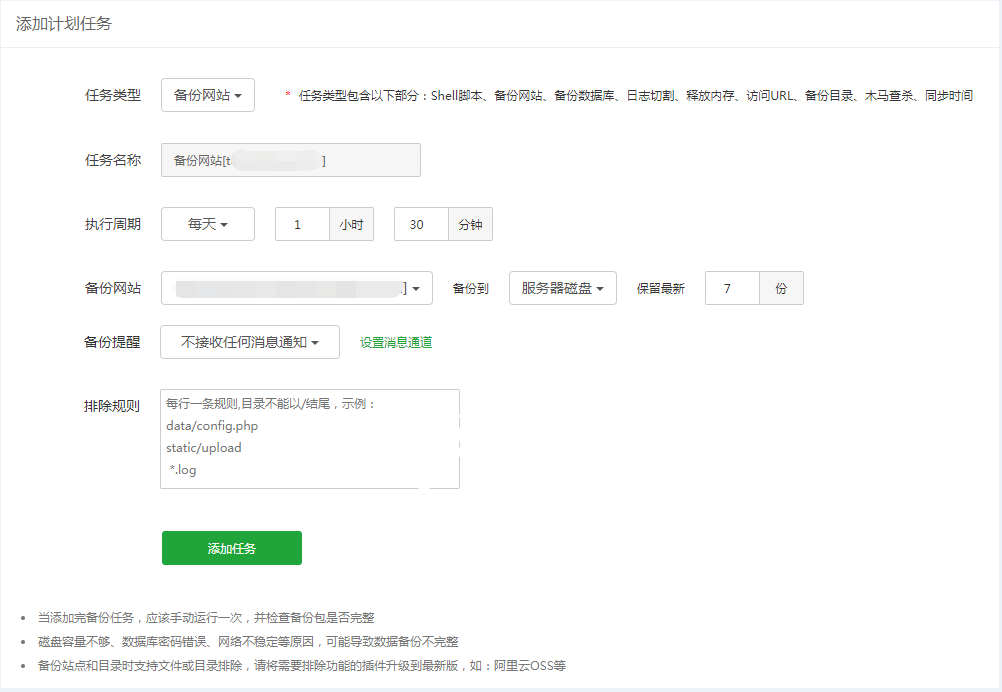 备份站点和目录时支持文件或目录排除,请将需要排除功能的插件升级到最新版,如:阿里云OSS等