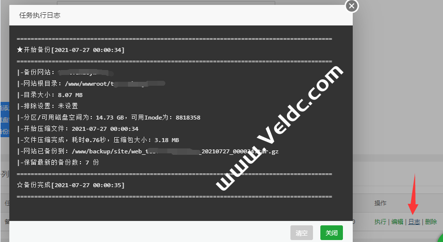 4、点击任务列表对应的任务计划日志功能可以看到备份具体情况,备份存储路径