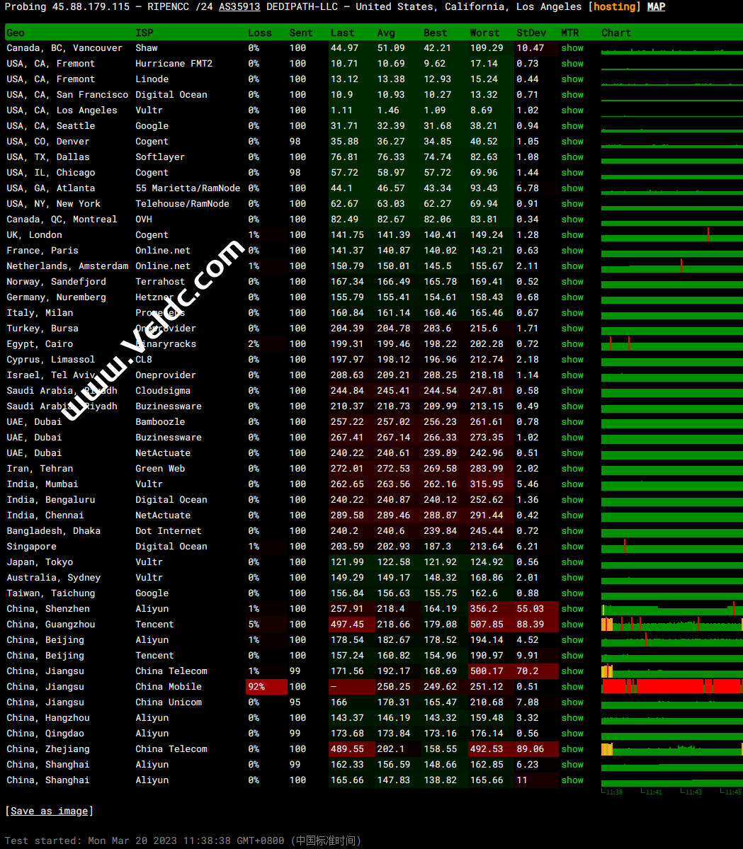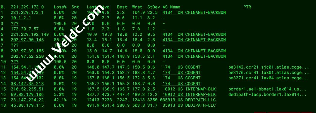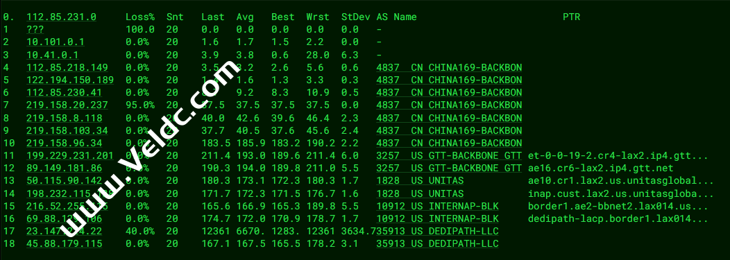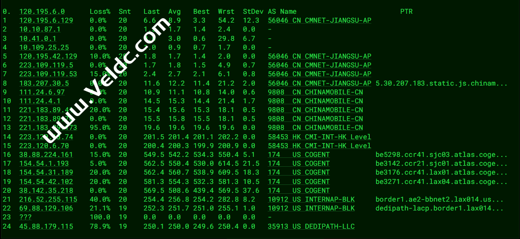---------------------------------------------------------------------- 广州电信 traceroute to 14.215.116.1 (14.215.116.1), 30 hops max, 32 byte packets 1 * 2 23.147.224.21 0.47 ms AS35913 美国, 加利福尼亚州, 洛杉矶, dedipath.com 3 ae66.edge7.LosAngeles1.Level3.net (4.78.193.5) 2.08 ms AS3356 美国, 加利福尼亚州, 洛杉矶, level3.com 4 ae1.3505.edge9.SanJose1.level3.net (4.69.219.61) 10.07 ms AS3356 美国, 加利福尼亚州, 圣何塞, level3.com 5 4.15.125.54 12.39 ms AS3356 美国, 加利福尼亚州, 圣何塞, level3.com 6 202.97.27.237 158.39 ms AS4134 中国, 广东, 广州, chinatelecom.com.cn, 电信 7 * 8 * 9 * 10 183.58.35.2 159.23 ms AS4134 中国, 广东, 广州, chinatelecom.com.cn, 电信 11 183.56.129.2 175.51 ms AS4134 中国, 广东, 广州, chinatelecom.com.cn, 电信 12 * 13 14.215.116.1 171.30 ms AS4134 中国, 广东, 广州, chinatelecom.com.cn, 电信 ---------------------------------------------------------------------- 上海电信 traceroute to 202.96.209.133 (202.96.209.133), 30 hops max, 32 byte packets 1 * 2 23.147.224.21 5.40 ms AS35913 美国, 加利福尼亚州, 洛杉矶, dedipath.com 3 ae66.edge7.LosAngeles1.Level3.net (4.78.193.5) 1.28 ms AS3356 美国, 加利福尼亚州, 洛杉矶, level3.com 4 * 5 4.15.125.54 15.88 ms AS3356 美国, 加利福尼亚州, 圣何塞, level3.com 6 * 7 202.97.39.202 150.46 ms AS4134 中国, 上海, chinatelecom.com.cn, 电信 8 202.97.83.134 155.92 ms AS4134 中国, 上海, chinatelecom.com.cn, 电信 9 * 10 124.74.229.234 155.14 ms AS4812 中国, 上海, chinatelecom.com.cn, 电信 11 * 12 * 13 * 14 * 15 * 16 * 17 * 18 * 19 * 20 * 21 * 22 * 23 * 24 * 25 * 26 * 27 * 28 * 29 * 30 * ---------------------------------------------------------------------- 厦门电信 traceroute to 117.28.254.129 (117.28.254.129), 30 hops max, 32 byte packets 1 * 2 23.147.224.21 0.98 ms AS35913 美国, 加利福尼亚州, 洛杉矶, dedipath.com 3 border1.ae4.dedipath-lacp.lax014.us.unitasglobal.net (69.88.129.105) 0.50 ms AS10912 美国, 加利福尼亚州, 洛杉矶, inap.com 4 core4.ae1-80g-bbnet1.lax012.us.unitasglobal.net (216.52.255.17) 1.44 ms AS10912 美国, 加利福尼亚州, 洛杉矶, inap.com 5 * 6 chinatelecom-ic320371-las-b24.ip.twelve99-cust.net (213.248.79.253) 1.49 ms AS1299 美国, 加利福尼亚州, 洛杉矶, telia.com 7 59.43.184.157 132.16 ms * 中国, 上海, chinatelecom.com.cn, 电信 8 * 9 59.43.130.209 135.88 ms * 中国, 上海, chinatelecom.com.cn, 电信 10 59.43.138.186 167.19 ms * 中国, 福建, chinatelecom.com.cn, 电信 11 * 12 27.159.81.202 170.36 ms AS133775 中国, 福建, 厦门, chinatelecom.com.cn, 电信 13 * 14 * 15 117.28.254.129 170.93 ms AS4809 中国, 福建, 厦门, chinatelecom.com.cn, 电信 ---------------------------------------------------------------------- 重庆联通 traceroute to 113.207.25.138 (113.207.25.138), 30 hops max, 32 byte packets 1 * 2 23.147.224.21 2.46 ms AS35913 美国, 加利福尼亚州, 洛杉矶, dedipath.com 3 ae66.edge7.LosAngeles1.Level3.net (4.78.193.5) 1.59 ms AS3356 美国, 加利福尼亚州, 洛杉矶, level3.com 4 4.69.209.165 10.42 ms AS3356 美国, 加利福尼亚州, 圣何塞, level3.com 5 CHINA-UNICO.edge1.SanJose3.Level3.net (4.53.209.22) 18.27 ms AS3356 美国, 加利福尼亚州, 圣何塞, level3.com 6 219.158.102.129 169.03 ms AS4837 中国, 上海, chinaunicom.com, 联通 7 219.158.8.181 164.08 ms AS4837 中国, 上海, chinaunicom.com, 联通 8 219.158.7.125 161.59 ms AS4837 中国, 上海, chinaunicom.com, 联通 9 219.158.12.98 168.03 ms AS4837 中国, 重庆, chinaunicom.com, 联通 10 * 11 * 12 * 13 * 14 * 15 * 16 * 17 * 18 * 19 * 20 * 21 * 22 * 23 * 24 * 25 * 26 * 27 * 28 * 29 * 30 * ---------------------------------------------------------------------- 成都联通 traceroute to 119.6.6.6 (119.6.6.6), 30 hops max, 32 byte packets 1 * 2 23.147.224.21 1.45 ms AS35913 美国, 加利福尼亚州, 洛杉矶, dedipath.com 3 ae66.edge7.LosAngeles1.Level3.net (4.78.193.5) 1.94 ms AS3356 美国, 加利福尼亚州, 洛杉矶, level3.com 4 4.69.209.165 12.69 ms AS3356 美国, 加利福尼亚州, 圣何塞, level3.com 5 CHINA-NETCO.edge1.SanJose3.Level3.net (4.53.208.118) 11.25 ms AS3356 美国, 加利福尼亚州, 圣何塞, level3.com 6 219.158.6.5 162.78 ms AS4837 中国, 上海, chinaunicom.com, 联通 7 219.158.113.122 165.37 ms AS4837 中国, 上海, chinaunicom.com, 联通 8 219.158.113.113 157.80 ms AS4837 中国, 上海, chinaunicom.com, 联通 9 * 10 * 11 119.6.195.38 203.80 ms AS4837 中国, 四川, 成都, chinaunicom.com, 联通 12 * 13 * 14 * 15 * 16 * 17 * 18 * 19 * 20 * 21 * 22 * 23 * 24 * 25 * 26 * 27 * 28 * 29 * 30 * ---------------------------------------------------------------------- 上海移动 traceroute to 120.204.197.126 (120.204.197.126), 30 hops max, 32 byte packets 1 * 2 23.147.224.21 0.38 ms AS35913 美国, 加利福尼亚州, 洛杉矶, dedipath.com 3 border1.ae4.dedipath-lacp.lax014.us.unitasglobal.net (69.88.129.105) 0.43 ms AS10912 美国, 加利福尼亚州, 洛杉矶, inap.com 4 core4.ae1-80g-bbnet1.lax012.us.unitasglobal.net (216.52.255.17) 1.33 ms AS10912 美国, 加利福尼亚州, 洛杉矶, inap.com 5 * 6 lax-b23-link.ip.twelve99.net (62.115.143.38) 1.37 ms AS1299 美国, 加利福尼亚州, 洛杉矶, telia.com 7 sjo-b23-link.ip.twelve99.net (62.115.116.40) 11.67 ms AS1299 美国, 加利福尼亚州, 圣何塞, telia.com 8 sea-b1-link.ip.twelve99.net (62.115.132.153) 30.61 ms AS1299 美国, 华盛顿州, 西雅图, telia.com 9 * 10 * 11 * 12 * 13 * 14 * 15 * 16 * 17 * 18 * 19 * 20 * 21 * 22 * 23 * 24 * 25 * 26 * 27 * 28 * 29 * 30 * ---------------------------------------------------------------------- 成都移动 traceroute to 183.221.253.100 (183.221.253.100), 30 hops max, 32 byte packets 1 * 2 23.147.224.21 1.67 ms AS35913 美国, 加利福尼亚州, 洛杉矶, dedipath.com 3 ae66.edge7.LosAngeles1.Level3.net (4.78.193.5) 1.74 ms AS3356 美国, 加利福尼亚州, 洛杉矶, level3.c