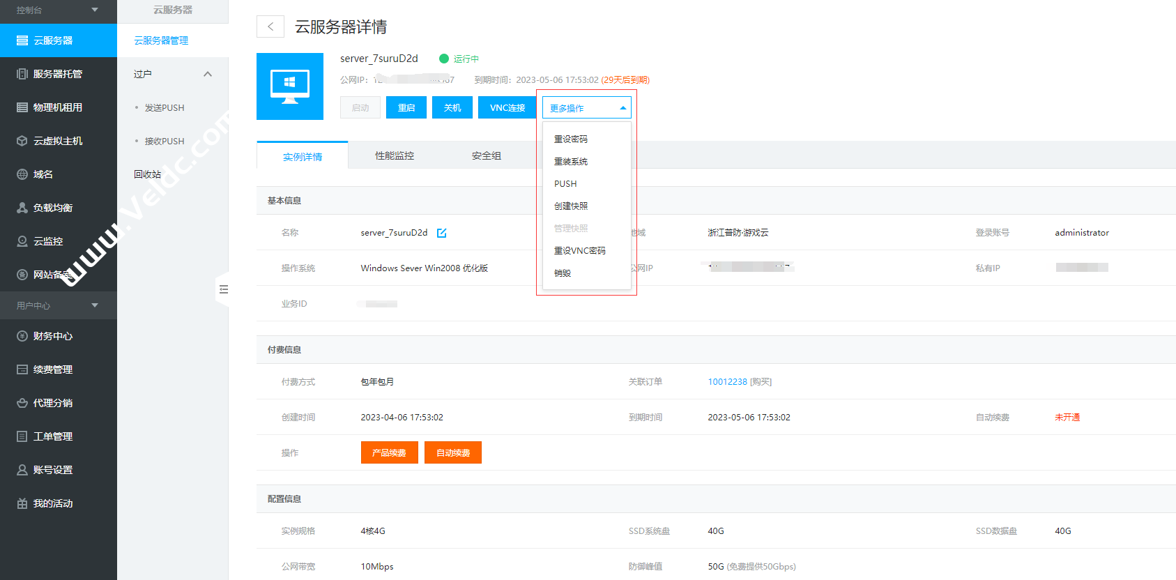 云服务器管理面板功能丰富,支持一键下单在线支付开通云服务器,支持VNC,安全组,重装重启,PUSH在线过户交易,支持性能监控,支持在线重置密码,可自行销毁主机!
