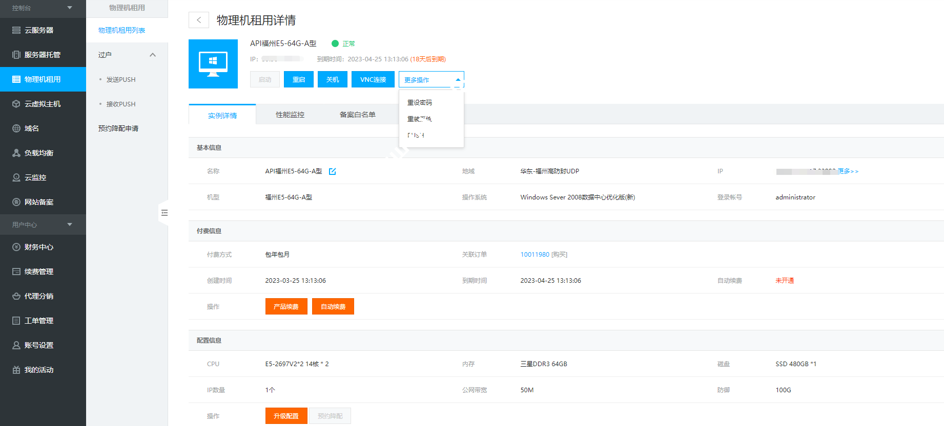 物理机管理面板功能展示,支持一键下单在线支付开通物理服务器,支持VNC连接,重装重启,PUSH在线过户交易,支持性能监控,支持白名单在线提交,支持在线升级防御带宽,短信到期提醒,微信推送服务器信息!