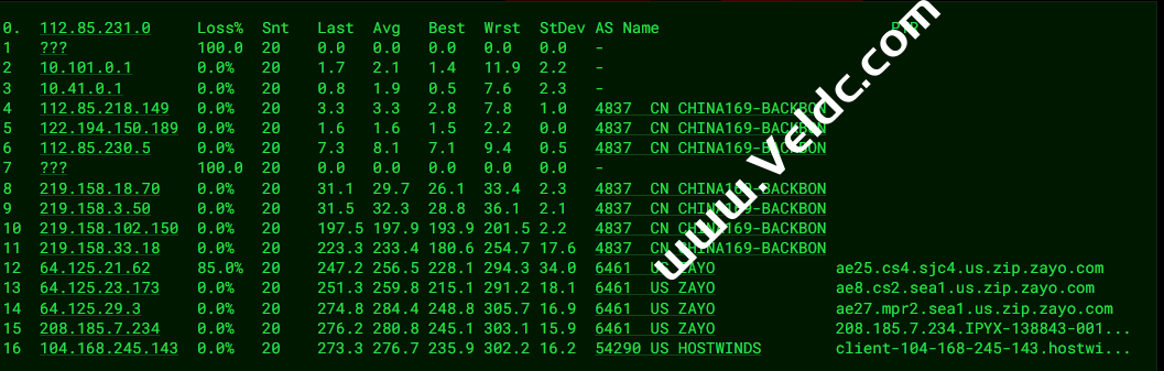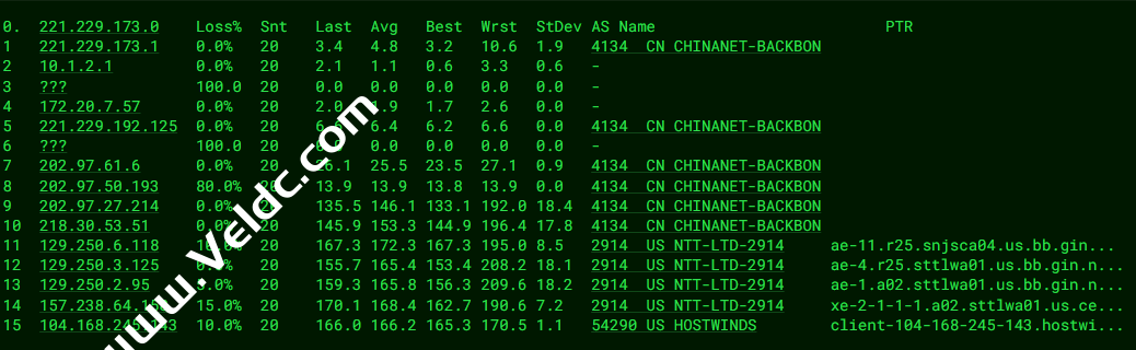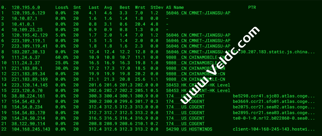 ---------------------------------------------------------------------- 广州电信 traceroute to 14.215.116.1 (14.215.116.1), 30 hops max, 32 byte packets 1 10.5.0.1 0.63 ms * 局域网 2 xe-2-2-3.mpr2.sea1.us.zip.zayo.com (208.185.7.233) 0.61 ms AS6461 美国, 华盛顿州, 西雅图, zayo.com 3 ae-2.r25.sttlwa01.us.bb.gin.ntt.net (129.250.2.94) 14.19 ms AS2914 美国, 华盛顿州, 西雅图, ntt.com 4 ae-3.r25.snjsca04.us.bb.gin.ntt.net (129.250.3.124) 29.37 ms AS2914 美国, 加利福尼亚州, 圣何塞, ntt.com 5 ae13.mpr4.sjc7.us.zip.zayo.com (64.125.22.183) 24.04 ms AS6461 美国, 加利福尼亚州, 圣何塞, zayo.com 6 zayo-ct-4.sjc7.us.zip.zayo.com (64.125.14.78) 27.03 ms AS6461 美国, 加利福尼亚州, 圣何塞, zayo.com 7 * 8 * 9 202.97.71.253 181.33 ms AS4134 中国, 广东, 广州, chinatelecom.com.cn, 电信 10 * 11 121.14.50.222 209.63 ms AS4134 中国, 广东, 广州, chinatelecom.com.cn, 电信 12 183.56.129.2 220.90 ms AS4134 中国, 广东, 广州, chinatelecom.com.cn, 电信 13 14.215.116.1 228.26 ms AS4134 中国, 广东, 广州, chinatelecom.com.cn, 电信 ---------------------------------------------------------------------- 上海电信 traceroute to 202.96.209.133 (202.96.209.133), 30 hops max, 32 byte packets 1 10.5.0.1 0.32 ms * 局域网 2 be4550.nr12.b022860-0.sea03.atlas.cogentco.com (38.122.90.113) 1.00 ms AS174 美国, 华盛顿州, 西雅图, cogentco.com 3 te0-7-1-3.rcr21.sea03.atlas.cogentco.com (154.24.50.213) 7.61 ms AS174 美国, 华盛顿州, 西雅图, cogentco.com 4 * 5 ae-41.r02.snjsca04.us.bb.gin.ntt.net (129.250.6.119) 22.42 ms AS2914 美国, 加利福尼亚州, 圣何塞, ntt.com 6 218.30.53.50 27.22 ms AS4134 美国, 加利福尼亚州, 洛杉矶, chinatelecom.com.cn, 电信 7 * 8 * 9 * 10 * 11 * 12 180.169.255.122 226.77 ms AS4812 中国, 上海, chinatelecom.com.cn, 电信 13 * 14 * 15 * 16 * 17 * 18 * 19 * 20 * 21 * 22 * 23 * 24 * 25 * 26 * 27 * 28 * 29 * 30 * ---------------------------------------------------------------------- 厦门电信 traceroute to 117.28.254.129 (117.28.254.129), 30 hops max, 32 byte packets 1 10.5.0.1 0.83 ms * 局域网 2 xe-2-1-1-1.a02.sttlwa01.us.bb.gin.ntt.net (157.238.64.157) 2.59 ms AS2914 美国, 华盛顿州, 西雅图, ntt.com 3 ae-2.r24.sttlwa01.us.bb.gin.ntt.net (129.250.2.72) 3.48 ms AS2914 美国, 华盛顿州, 西雅图, ntt.com 4 ae-2.r24.sttlwa01.us.bb.gin.ntt.net (129.250.2.72) 2.92 ms AS2914 美国, 华盛顿州, 西雅图, ntt.com 5 ae-13.r30.tokyjp05.jp.bb.gin.ntt.net (129.250.4.143) 97.74 ms AS2914 日本, 东京都, 东京, ntt.com 6 ae-2.a00.tokyjp04.jp.bb.gin.ntt.net (129.250.2.69) 87.87 ms AS2914 日本, 东京都, 东京, ntt.com 7 xe-1-4-0-1.a01.tokyjp09.jp.ce.gin.ntt.net (117.103.177.106) 111.09 ms AS2914 日本, 东京都, 东京, ntt.com 8 xe-0-0-12-1.a00.tokyjp04.jp.ce.gin.ntt.net (120.88.54.134) 115.33 ms AS2914 日本, 东京都, 东京, ntt.com 9 * 10 * 11 59.43.138.186 174.83 ms * 中国, 福建, chinatelecom.com.cn, 电信 12 27.159.81.214 182.62 ms AS133775 中国, 福建, 厦门, chinatelecom.com.cn, 电信 13 27.159.81.190 188.49 ms AS133775 中国, 福建, 厦门, chinatelecom.com.cn, 电信 14 * 15 117.28.254.129 177.83 ms AS4809 中国, 福建, 厦门, chinatelecom.com.cn, 电信 ---------------------------------------------------------------------- 重庆联通 traceroute to 113.207.25.138 (113.207.25.138), 30 hops max, 32 byte packets 1 10.5.0.1 0.49 ms * 局域网 2 xe-2-2-3.mpr2.sea1.us.zip.zayo.com (208.185.7.233) 66.99 ms AS6461 美国, 华盛顿州, 西雅图, zayo.com 3 ae27.cs2.sea1.us.eth.zayo.com (64.125.29.2) 27.91 ms AS6461 美国, 华盛顿州, 西雅图, zayo.com 4 * 5 ae12.mpr3.sjc7.us.zip.zayo.com (64.125.31.45) 34.63 ms AS6461 美国, 加利福尼亚州, 圣何塞, zayo.com 6 219.158.33.17 82.25 ms AS4837 美国, 加利福尼亚州, 圣何塞, chinaunicom.com, 联通 7 219.158.33.17 71.16 ms AS4837 美国, 加利福尼亚州, 圣何塞, chinaunicom.com, 联通 8 219.158.117.1 263.03 ms AS4837 中国, 北京, chinaunicom.com, 联通 9 219.158.16.77 241.69 ms AS4837 中国, 北京, chinaunicom.com, 联通 10 * 11 219.158.101.106 316.00 ms AS4837 中国, 重庆, chinaunicom.com, 联通 12 * 13 * 14 * 15 * 16 * 17 * 18 * 19 * 20 * 21 * 22 * 23 * 24 * 25 * 26 * 27 * 28 * 29 * 30 * ---------------------------------------------------------------------- 成都联通 traceroute to 119.6.6.6 (119.6.6.6), 30 hops max, 32 byte packets 1 10.5.0.1 0.42 ms * 局域网 2 xe-2-2-3.mpr2.sea1.us.zip.zayo.com (208.185.7.233) 0.69 ms AS6461 美国, 华盛顿州, 西雅图, zayo.com 3 ae28.cs1.sea1.us.eth.zayo.com (64.125.29.102) 23.94 ms AS6461 美国, 华盛顿州, 西雅图, zayo.com 4 ae27.cs2.sea1.us.eth.zayo.com (64.125.29.2) 27.93 ms AS6461 美国, 华盛顿州, 西雅图, zayo.com 5 * 6 ae25.mpr3.sjc7.us.zip.zayo.com (64.125.21.63) 24.13 ms AS6461 美国, 加利福尼亚州, 圣何塞, zayo.com 7 219.158.33.17 49.51 ms AS4837 美国, 加利福尼亚州, 圣何塞, chinaunicom.com, 联通 8 219.158.115.158 247.76 ms AS4837 中国, 广东, 广州, chinaunicom.com, 联通 9 219.158.115.158 251.67 ms AS4837 中国, 广东, 广州, chinaunicom.com, 联通 10 * 11 * 12 119.6.197.10 290.00 ms AS4837 中国, 四川, 成都, chinaunicom.com, 联通 13 119.6.195.34 287.79 ms AS4837 中国, 四川, 成都, chinaunicom.com, 联通 14 * 15 * 16 * 17 * 18 * 19 * 20 * 21 * 22 * 23 * 24 * 25 * 26 * 27 * 28 * 29 * 30 * ---------------------------------------------------------------------- 上海移动 traceroute to 120.204.197.126 (120.204.197.126), 30 hops max, 32 byte packets 1 10.5.0.1 0.35 ms * 局域网 2 client-104-168-130-130.hostwindsdns.com (104.168.130.130) 5.25 ms AS54290 美国, 华盛顿州, 西雅图, hostwinds.com 3 xe-2-2-3.mpr2.sea1.us.zip.zayo.com (208.185.7.233) 0.85 ms AS6461 美国, 华盛顿州, 西雅图, zayo.com 4 ae28.cs1.sea1.us.eth.zayo.com (64.125.29.102) 0.83 ms AS6461 美国, 华盛顿州, 西雅图, zayo.com 5 six.chinamobile.com (206.81.81.181)