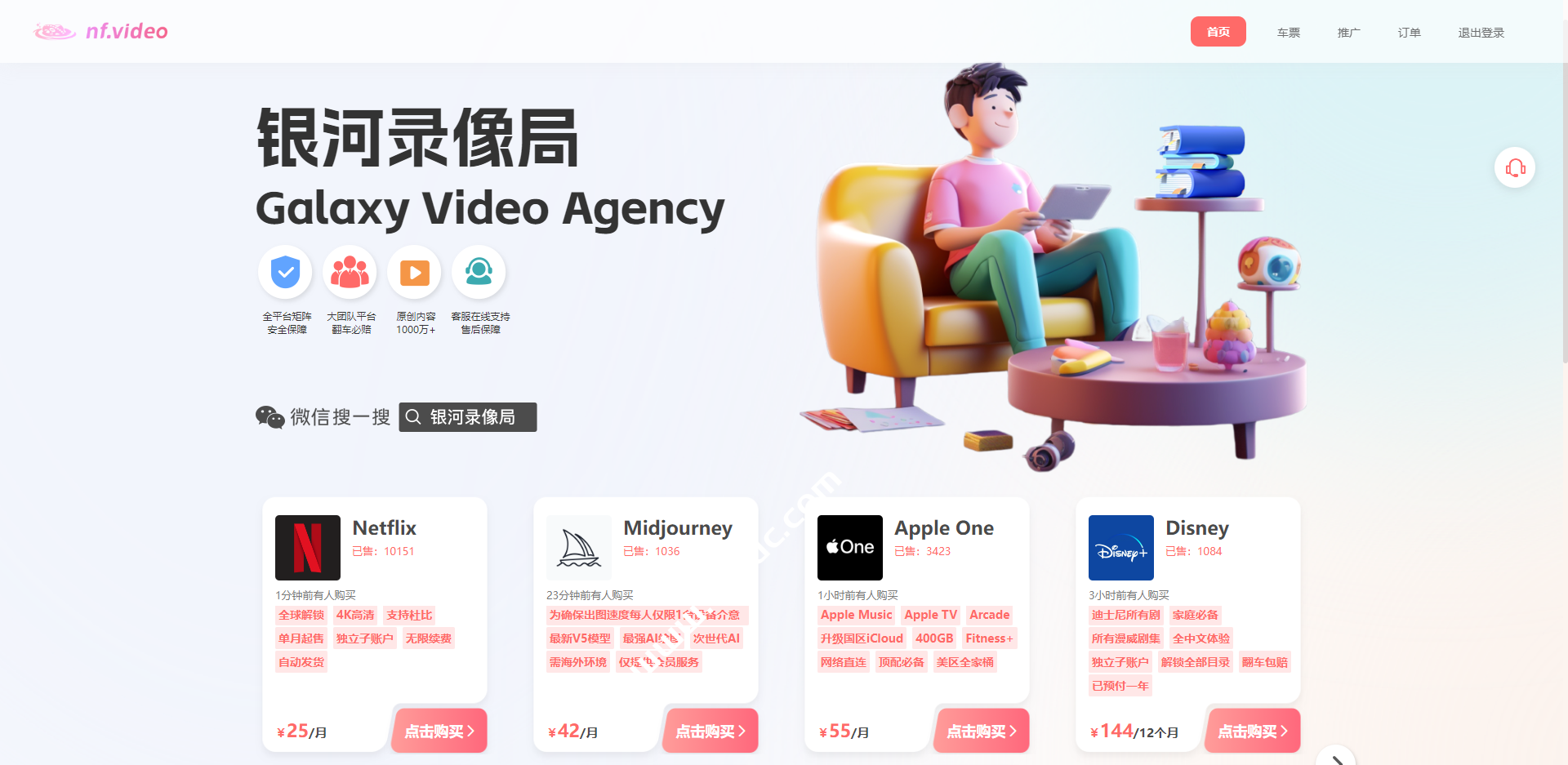 银河录像局是一家领先的流媒体与生产力软件共享平台,我们的合租服务涵盖各类流媒体与生产力工具,例如Netflix、Disney+、HBO、AppleTV+、Midjourney、ChatGPT、PrimeVideo、和Paramount+、等。致力于为广大用户提供卓越的在线娱乐与生产力解决方案。我们的使命是为客户提供便捷、高效且稳定的服务,带来卓越的娱乐与工作体验。