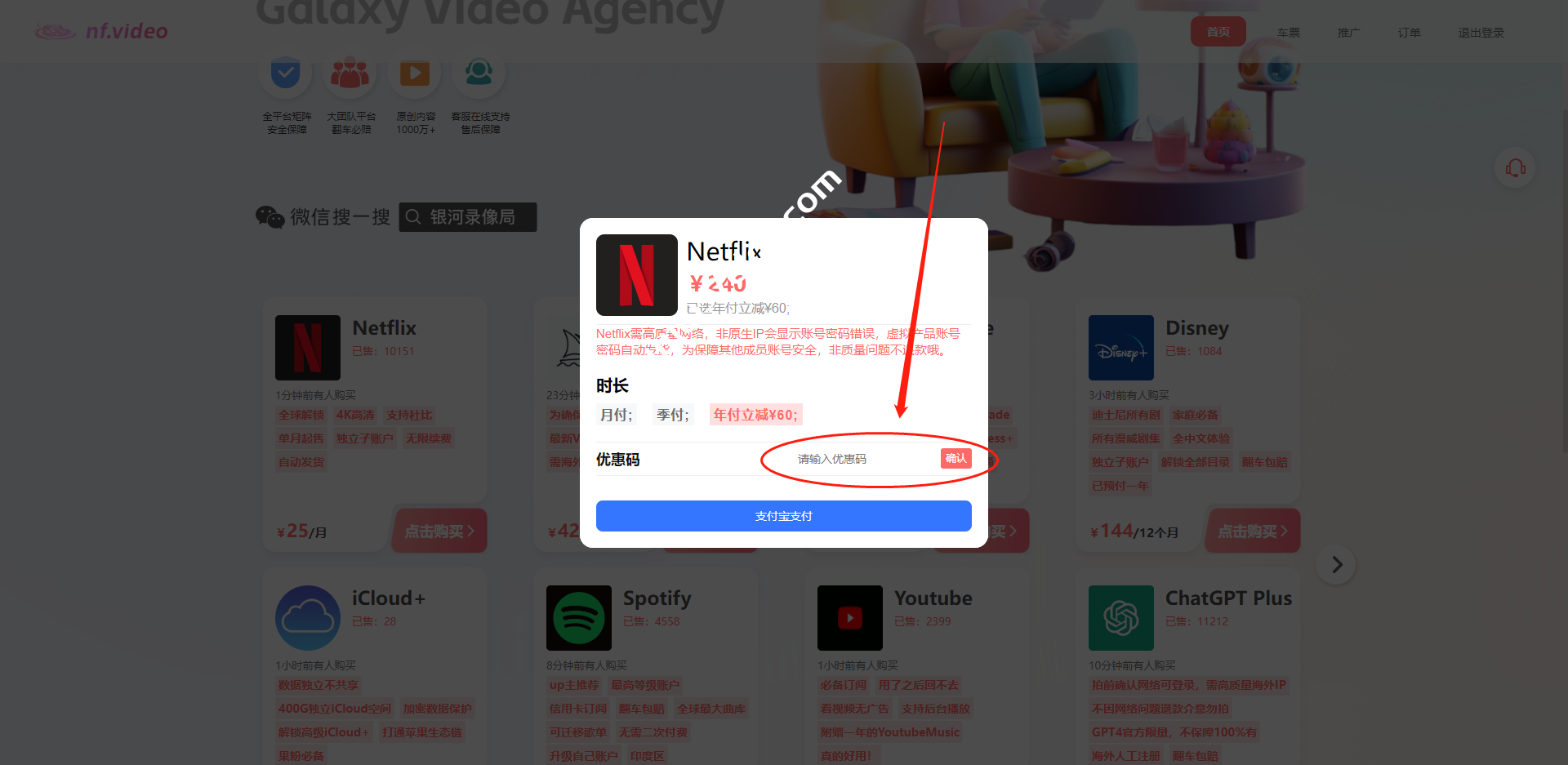 流媒体合租的优点在于,通过选择银河录像局的流媒体合租平台,用户可以享受到比单独购买或订阅流媒体服务更为便宜的价格,银河录像局也会给大家提供更灵活的选择,大家可以根据自己的需求和预算选择不同的合租方案,比如账号类型、订阅时长、不同平台的观看。