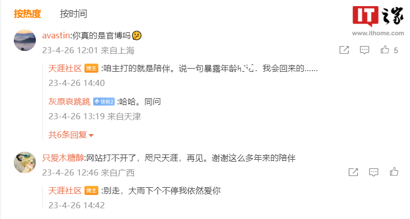 IT之家注意到,天涯社区的微博还在正常运营中。并且昨日“天涯社区”官博在评论区回复称:咱主打的就是一个陪伴。说一句暴露年龄的话:我会回来的……;别走,大雨下个不停依然爱你。