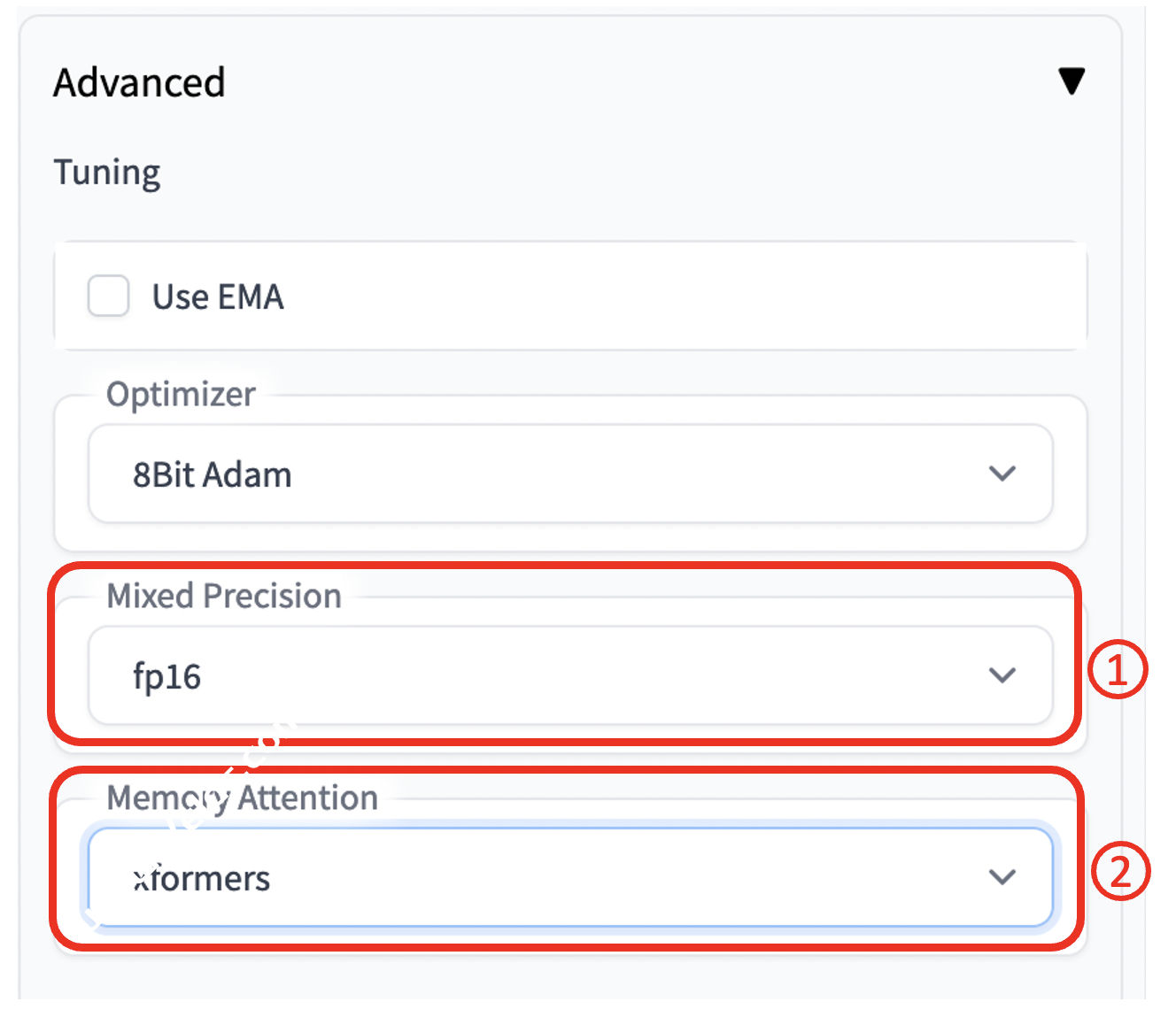 5. 点击 Advance 右侧箭头,展开选项卡。在 Mixed Precision 选择 fp16,Memory Attention 选择 xformers,其他选项保持默认即可,如下图所示。