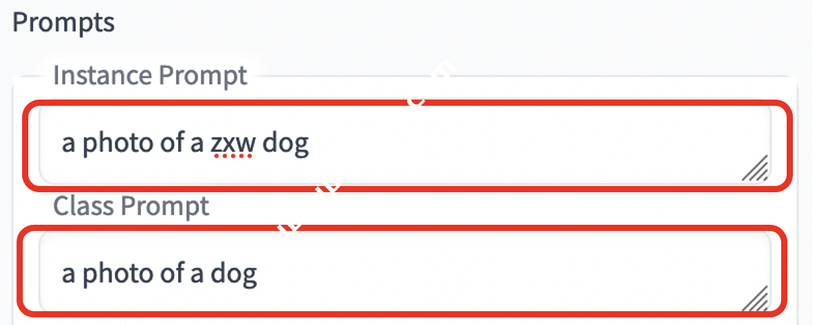 7. 向下拉动滚动条,在 Instance Prompt 中输入”a photo of a zxw dog”,在 Class Prompt 中输入”a photo of dog”,其他保持默认。