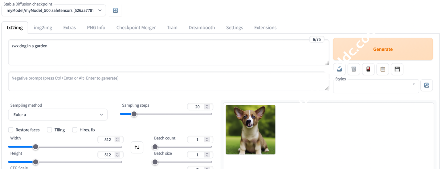 11. 点击 txt2img,跳转到文生图⻚面。输入 Prompt,注意要带上 zwx 前缀,查看结果。
