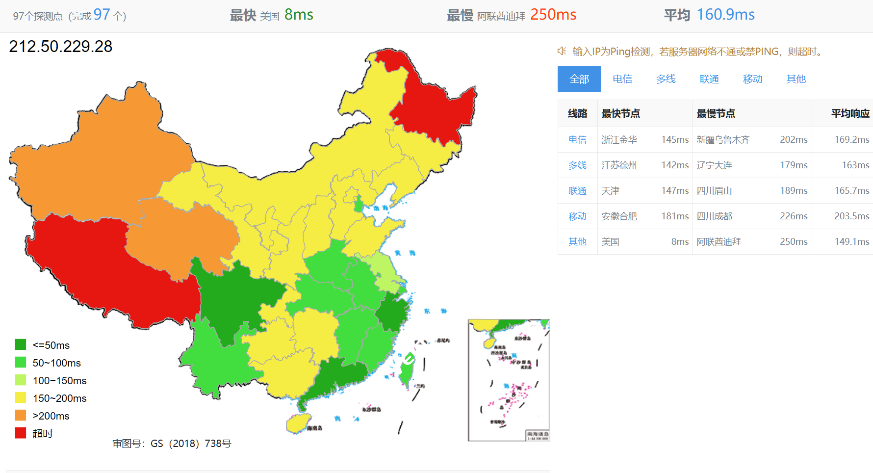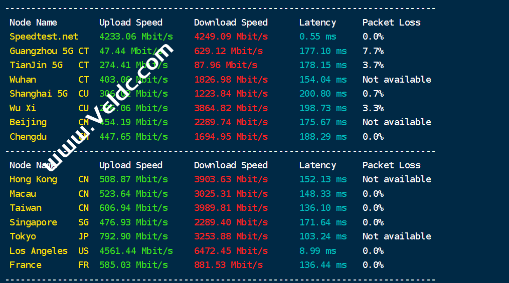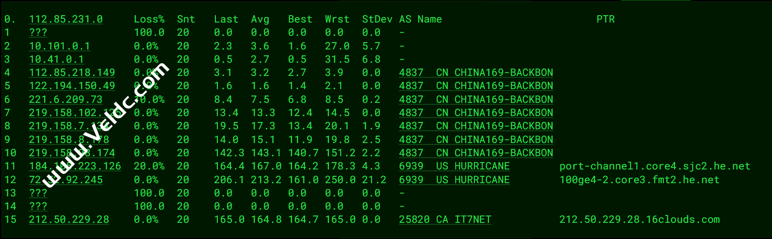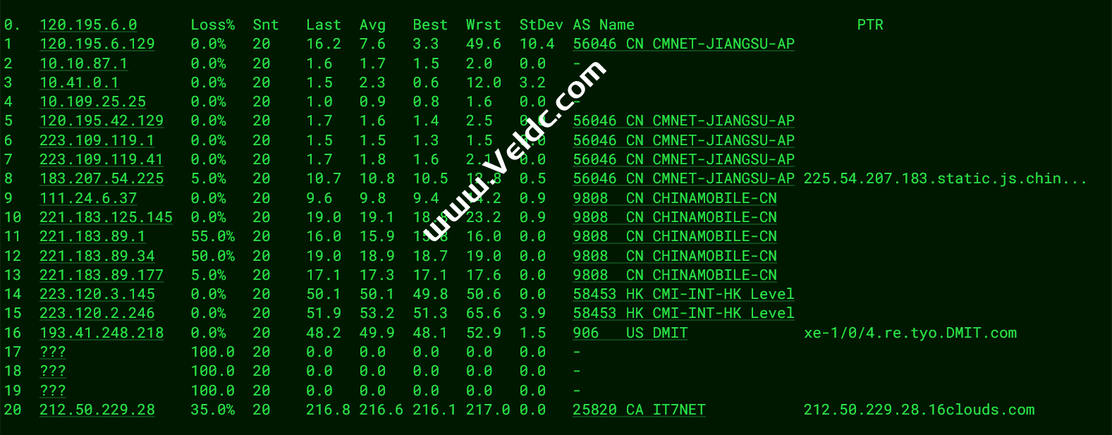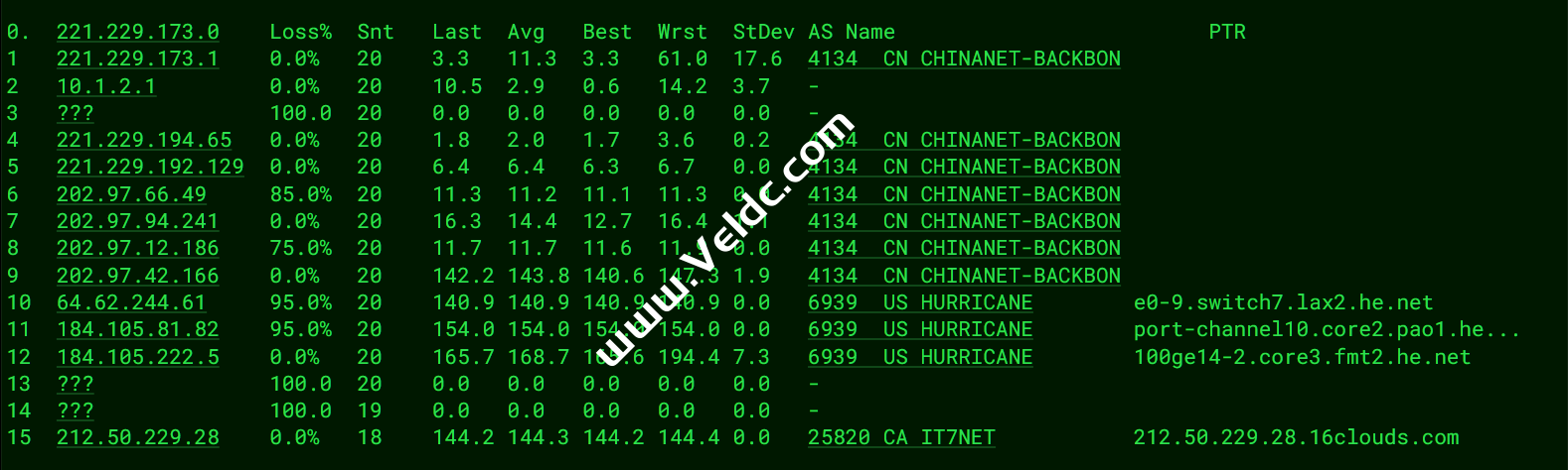 ---------------------------------------------------------------------- 广州电信 traceroute to 14.215.116.1 (14.215.116.1), 30 hops max, 32 byte packets 1 172.22.53.200 4.72 ms * 局域网 2 et17/4.er01-fmt.sjc.DMIT.com (193.41.250.44) 0.32 ms AS54574 美国, 加利福尼亚州, 圣何塞, dmit.io 3 ae5-1300.re.sjc.DMIT.com (193.41.250.10) 0.79 ms AS54574 美国, 加利福尼亚州, 圣何塞, dmit.io 4 AS4837.re.sjc.DMIT.com (193.41.250.13) 1.93 ms AS54574 美国, 加利福尼亚州, 圣何塞, dmit.io 5 219.158.6.5 130.20 ms AS4837 中国, 上海, chinaunicom.com, 联通 6 219.158.6.157 142.45 ms AS4837 中国, 上海, chinaunicom.com, 联通 7 * 8 * 9 219.158.9.30 158.04 ms AS4837 中国, 广东, 广州, chinaunicom.com, 联通 10 202.97.16.9 166.16 ms AS4134 中国, 广东, 广州, chinatelecom.com.cn, 电信 11 * 12 113.96.4.74 167.45 ms AS4134 中国, 广东, 广州, chinatelecom.com.cn, 电信 13 113.96.4.230 169.66 ms AS4134 中国, 广东, 广州, chinatelecom.com.cn, 电信 14 183.2.167.253 156.22 ms AS4134 中国, 广东, 广州, chinatelecom.com.cn, 电信 15 14.215.116.1 165.79 ms AS4134 中国, 广东, 广州, chinatelecom.com.cn, 电信 ---------------------------------------------------------------------- 上海电信 traceroute to 202.96.209.133 (202.96.209.133), 30 hops max, 32 byte packets 1 172.22.53.200 11.29 ms * 局域网 2 et17/4.er01-fmt.sjc.DMIT.com (193.41.250.44) 0.32 ms AS54574 美国, 加利福尼亚州, 圣何塞, dmit.io 3 ae5-1300.re.sjc.DMIT.com (193.41.250.10) 0.78 ms AS54574 美国, 加利福尼亚州, 圣何塞, dmit.io 4 AS4837.re.sjc.DMIT.com (193.41.250.13) 1.28 ms AS54574 美国, 加利福尼亚州, 圣何塞, dmit.io 5 219.158.6.5 129.54 ms AS4837 中国, 上海, chinaunicom.com, 联通 6 219.158.113.126 144.06 ms AS4837 中国, 上海, chinaunicom.com, 联通 7 219.158.113.105 145.74 ms AS4837 中国, 上海, chinaunicom.com, 联通 8 219.158.98.254 134.46 ms AS4837 中国, 上海, chinaunicom.com, 联通 9 202.97.17.189 138.41 ms AS4134 中国, 上海, chinatelecom.com.cn, 电信 10 * 11 * 12 124.74.229.234 155.51 ms AS4812 中国, 上海, chinatelecom.com.cn, 电信 13 * 14 * 15 * 16 * 17 * 18 * 19 * 20 * 21 * 22 * 23 * 24 * 25 * 26 * 27 * 28 * 29 * 30 * ---------------------------------------------------------------------- 厦门电信 traceroute to 117.28.254.129 (117.28.254.129), 30 hops max, 32 byte packets 1 172.22.53.200 4.67 ms * 局域网 2 et17/4.er01-fmt.sjc.DMIT.com (193.41.250.44) 0.30 ms AS54574 美国, 加利福尼亚州, 圣何塞, dmit.io 3 ae5-1300.re.sjc.DMIT.com (193.41.250.10) 0.78 ms AS54574 美国, 加利福尼亚州, 圣何塞, dmit.io 4 sjo-b23-link.ip.twelve99.net (62.115.185.161) 1.27 ms AS1299 美国, 加利福尼亚州, 圣何塞, telia.com 5 sjo-b1-link.ip.twelve99.net (62.115.125.161) 1.29 ms AS1299 美国, 加利福尼亚州, 圣何塞, telia.com 6 chinatelecom-ic307264-sjo-b21.ip.twelve99-cust.net (80.239.132.158) 163.88 ms AS1299 美国, 加利福尼亚州, 圣何塞, telia.com 7 59.43.182.146 161.19 ms * 中国, 上海, chinatelecom.com.cn, 电信 8 * 9 59.43.130.217 146.22 ms * 中国, 上海, chinatelecom.com.cn, 电信 10 59.43.138.186 166.38 ms * 中国, 福建, chinatelecom.com.cn, 电信 11 * 12 27.159.81.202 169.93 ms AS133775 中国, 福建, 厦门, chinatelecom.com.cn, 电信 13 * 14 * 15 117.28.254.129 175.80 ms AS4809 中国, 福建, 厦门, chinatelecom.com.cn, 电信 ---------------------------------------------------------------------- 重庆联通 traceroute to 113.207.25.138 (113.207.25.138), 30 hops max, 32 byte packets 1 172.22.53.200 4.26 ms * 局域网 2 et17/4.er01-fmt.sjc.DMIT.com (193.41.250.44) 0.32 ms AS54574 美国, 加利福尼亚州, 圣何塞, dmit.io 3 ae5-1300.re.sjc.DMIT.com (193.41.250.10) 0.79 ms AS54574 美国, 加利福尼亚州, 圣何塞, dmit.io 4 AS4837.re.sjc.DMIT.com (193.41.250.13) 4.22 ms AS54574 美国, 加利福尼亚州, 圣何塞, dmit.io 5 219.158.6.5 132.18 ms AS4837 中国, 上海, chinaunicom.com, 联通 6 219.158.6.205 145.86 ms AS4837 中国, 上海, chinaunicom.com, 联通 7 219.158.7.125 128.90 ms AS4837 中国, 上海, chinaunicom.com, 联通 8 219.158.12.98 153.76 ms AS4837 中国, 重庆, chinaunicom.com, 联通 9 * 10 * 11 * 12 * 13 * 14 * 15 * 16 * 17 * 18 * 19 * 20 * 21 * 22 * 23 * 24 * 25 * 26 * 27 * 28 * 29 * 30 * ---------------------------------------------------------------------- 成都联通 traceroute to 119.6.6.6 (119.6.6.6), 30 hops max, 32 byte packets 1 172.22.53.200 3.60 ms * 局域网 2 et17/4.er01-fmt.sjc.DMIT.com (193.41.250.44) 0.32 ms AS54574 美国, 加利福尼亚州, 圣何塞, dmit.io 3 ae5-1300.re.sjc.DMIT.com (193.41.250.10) 0.80 ms AS54574 美国, 加利福尼亚州, 圣何塞, dmit.io 4 AS4837.re.sjc.DMIT.com (193.41.250.13) 3.84 ms AS54574 美国, 加利福尼亚州, 圣何塞, dmit.io 5 219.158.116.237 132.87 ms AS4837 中国, 上海, chinaunicom.com, 联通 6 219.158.19.78 133.36 ms AS4837 中国, 上海, chinaunicom.com, 联通 7 219.158.19.69 139.08 ms AS4837 中国, 上海, chinaunicom.com, 联通 8 * 9 119.6.197.198 173.42 ms AS4837 中国, 四川, 成都, chinaunicom.com, 联通 10 119.6.195.34 179.89 ms AS4837 中国, 四川, 成都, chinaunicom.com, 联通 11 * 12 * 13 * 14 * 15 * 16 * 17 * 18 * 19 * 20 * 21 * 22 * 23 * 24 * 25 * 26 * 27 * 28 * 29 * 30 * ---------------------------------------------------------------------- 上海移动 traceroute to 120.204.197.126 (120.204.197.126), 30 hops max, 32 byte packets 1 172.22.53.200 0.76 ms * 局域网 2 et17/4.er01-fmt.sjc.DMIT.com (193.41.250.44) 0.31 ms AS54574 美国, 加利福尼亚州, 圣何塞, dmit.io 3 ae5-1300.re.sjc.DMIT.com (193.41.250.10) 0.79 ms AS54574 美国, 加利福尼亚州, 圣何塞, dmit.io 4 AS4837.re.sjc.DMIT.com (193.41.250.13) 4.51 ms AS54574 美国, 加利福尼亚州, 圣何塞, dmit.io 5 219.158.6.5 132.48 ms AS4837 中国, 上海, chinaunicom.com, 联通 6 219.158.6.185 131.68 ms AS4837 中国, 上海, chinaunicom.com, 联通 7 219.1