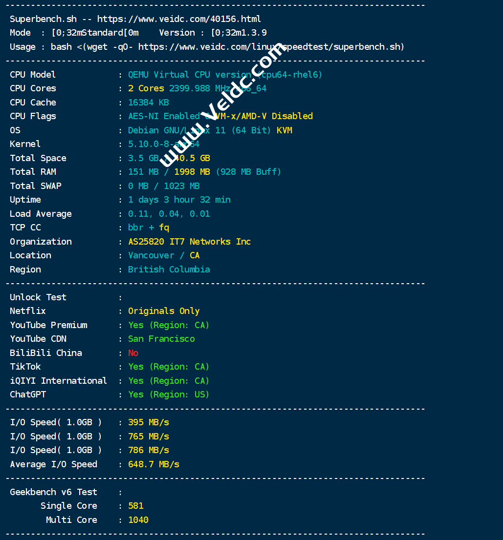 搬瓦工加拿大温哥华CN2 GIA是今年2月份新增的一条CN2 GIA线路,KiwiVM后台显示为CA: British Columbia, Vancouver (CN2GIA) [CABC_6],搬瓦工加拿大CN2 GIA机房(British Columbia, Vancouver)采用加拿大不列颠哥伦比亚省温哥华市数据中心,机房编号搬瓦工CABC_6,是搬瓦工第二个加拿大机房,机房提供2.5Gbps带宽,采用CN2 GIA国内优化线路,电信双向CN2 GIA、联通双向AS9929+10099,移动直连。目前还是没有可以直接购买的套餐,只有THE PLAN限量版套餐可以切换过去,本文测评一下搬瓦工加拿大温哥华CABC_6,看一下现在机房效果怎么样,包括加拿大CN2 GIA 机房的速度、延迟、丢包率、线路检测等。