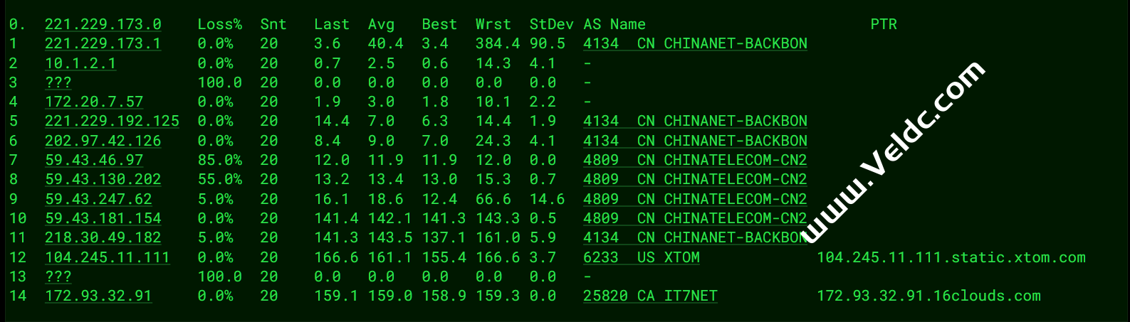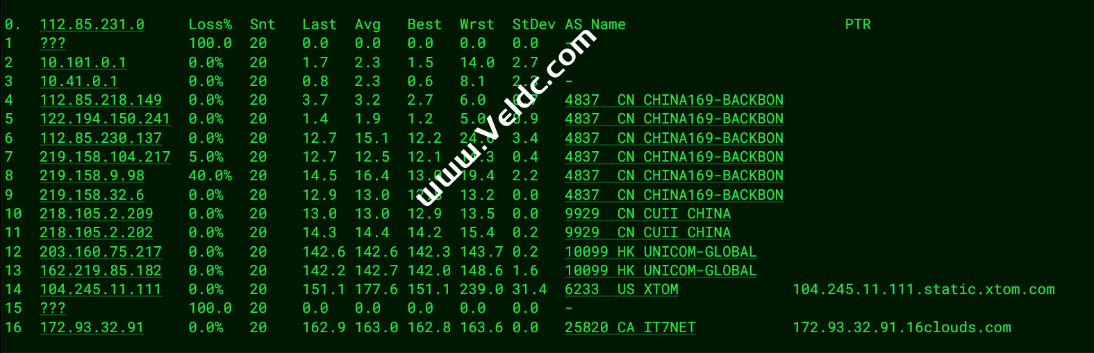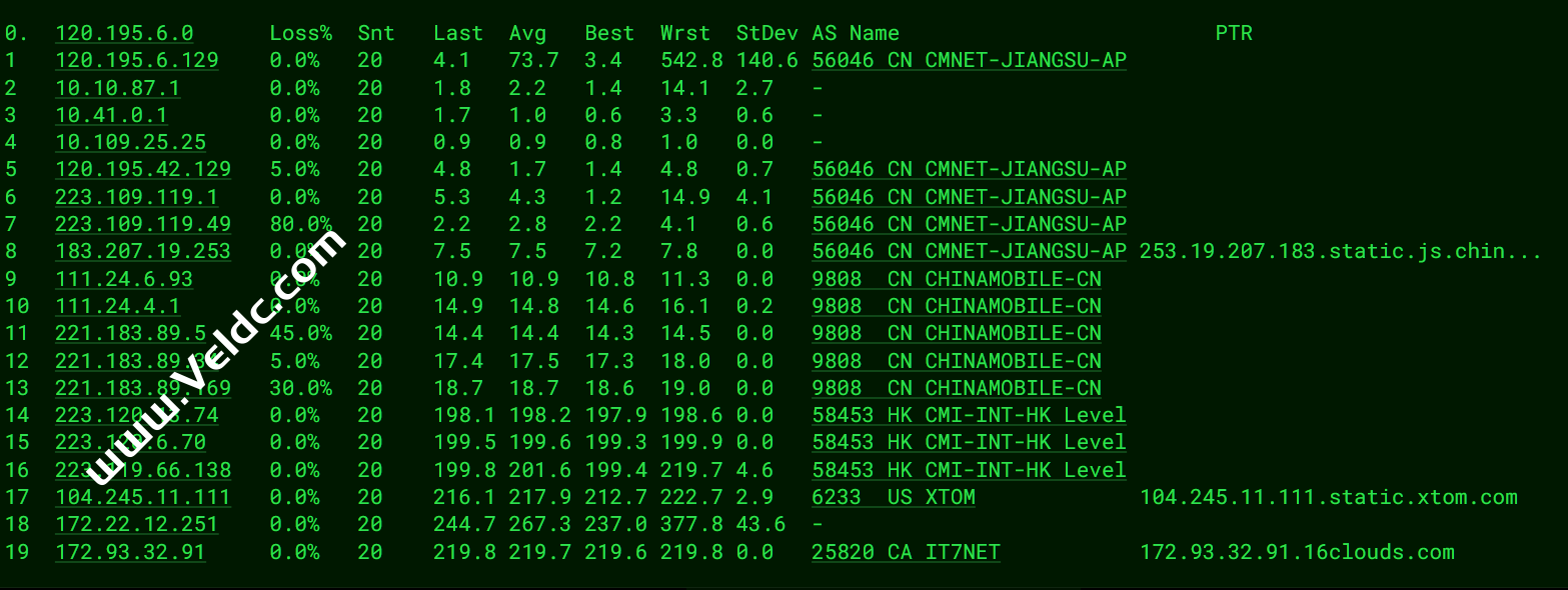 ---------------------------------------------------------------------------------- Traceroute to China, Guangzhou CT (TCP Mode, Max 30 Hop) ============================================================ traceroute to 113.108.209.1 (113.108.209.1), 30 hops max, 32 byte packets 1 172.22.12.200 23.63 ms * LAN Address 2 172.22.16.46 29.24 ms * LAN Address 3 104.245.11.110 20.63 ms AS6233 United States, California, San Jose, xtom.com 4 218.30.49.181 21.02 ms AS4134 United States, California, San Jose, ChinaTelecom 5 59.43.189.213 177.82 ms * China, Guangdong, Guangzhou, ChinaTelecom 6 * 7 * 8 202.97.82.57 193.86 ms AS4134 China, Guangdong, Guangzhou, ChinaTelecom 9 * 10 113.108.209.1 188.80 ms AS4134 China, Guangdong, Guangzhou, ChinaTelecom Traceroute to China, Shanghai CT (TCP Mode, Max 30 Hop) ============================================================ traceroute to 180.153.28.5 (180.153.28.5), 30 hops max, 32 byte packets 1 172.22.12.200 9.58 ms * LAN Address 2 172.22.16.46 26.72 ms * LAN Address 3 104.245.11.110 22.02 ms AS6233 United States, California, San Jose, xtom.com 4 218.30.49.181 21.03 ms AS4134 United States, California, San Jose, ChinaTelecom 5 59.43.182.182 142.23 ms * China, Shanghai, ChinaTelecom 6 * 7 59.43.138.49 147.08 ms * China, Shanghai, ChinaTelecom 8 101.95.88.162 148.49 ms AS4812 China, Shanghai, ChinaTelecom 9 * 10 124.74.232.66 149.53 ms AS4812 China, Shanghai, ChinaTelecom 11 101.227.255.34 148.89 ms AS4812 China, Shanghai, ChinaTelecom 12 * 13 * 14 * 15 * 16 * 17 * 18 * 19 * 20 * 21 * 22 * 23 * 24 * 25 * 26 * 27 * 28 * 29 * 30 * Traceroute to China, Beijing CT (TCP Mode, Max 30 Hop) ============================================================ traceroute to 180.149.128.9 (180.149.128.9), 30 hops max, 32 byte packets 1 172.22.12.200 16.55 ms * LAN Address 2 172.22.16.46 26.60 ms * LAN Address 3 104.245.11.110 20.94 ms AS6233 United States, California, San Jose, xtom.com 4 218.30.49.181 21.20 ms AS4134 United States, California, San Jose, ChinaTelecom 5 59.43.246.173 143.20 ms * China, Shanghai, ChinaTelecom 6 59.43.182.233 172.95 ms * China, Beijing, ChinaTelecom 7 * 8 59.43.131.253 172.87 ms * China, Beijing, ChinaTelecom 9 * 10 36.110.244.46 167.21 ms AS23724 China, Beijing, ChinaTelecom 11 * 12 * 13 * 14 * 15 * 16 * 17 * 18 * 19 * 20 * 21 * 22 * 23 * 24 * 25 * 26 * 27 * 28 * 29 * 30 * Traceroute to China, Guangzhou CU (TCP Mode, Max 30 Hop) ============================================================ traceroute to 210.21.4.130 (210.21.4.130), 30 hops max, 32 byte packets 1 172.22.12.200 18.98 ms * LAN Address 2 172.22.16.46 29.34 ms * LAN Address 3 104.245.11.110 20.74 ms AS6233 United States, California, San Jose, xtom.com 4 162.219.85.181 21.43 ms AS10099 United States, California, San Jose, ChinaUnicom 5 162.219.85.21 142.10 ms AS10099 United States, ChinaUnicom 6 210.14.186.141 150.00 ms * China, Shanghai, ChinaUnicom 7 218.105.131.197 175.23 ms AS9929 China, Guangdong, Guangzhou, ChinaUnicom 8 210.14.161.62 176.80 ms * China, Guangdong, Guangzhou, ChinaUnicom 9 219.158.32.21 175.89 ms AS4837 China, Guangdong, Guangzhou, ChinaUnicom 10 * 11 120.86.0.182 189.04 ms AS17816 China, Guangdong, Guangzhou, ChinaUnicom 12 120.80.169.118 177.19 ms AS17622 China, Guangdong, Guangzhou, ChinaUnicom 13 * 14 * 15 * 16 * 17 * 18 * 19 * 20 * 21 * 22 * 23 * 24 * 25 * 26 * 27 * 28 * 29 * 30 * Traceroute to China, Shanghai CU (TCP Mode, Max 30 Hop) ============================================================ traceroute to 58.247.8.158 (58.247.8.158), 30 hops max, 32 byte packets 1 172.22.12.200 14.28 ms * LAN Address 2 172.22.16.46 24.45 ms * LAN Address 3 104.245.11.110 20.70 ms AS6233 United States, California, San Jose, xtom.com 4 162.219.85.181 21.60 ms AS10099 United States, California, San Jose, ChinaUnicom 5 162.219.85.21 142.04 ms AS10099 United States, ChinaUnicom 6 210.14.186.145 149.14 ms * China, Shanghai, ChinaUnicom 7 218.105.2.150 149.71 ms AS9929 China, Shanghai, ChinaUnicom 8 219.158.32.1 150.71 ms AS4837 China, Shanghai, ChinaUnicom 9 219.158.120.17 151.03 ms AS4837 China, Shanghai, ChinaUnicom 10 * 11 139.226.204.154 150.91 ms AS17621 China, Shanghai, ChinaUnicom 12 139.226.225.22 152.12 ms AS17621 China, Shanghai, ChinaUnicom 13 58.247.8.153 160.91 ms AS17621 China, Shanghai, ChinaUnicom 14 * 15 * 16 * 17 * 18 * 19 * 20 * 21 * 22 * 23 * 24 * 25 * 26 * 27 * 28 * 29 * 30 * Traceroute to China, Beijing CU (TCP Mode, Max 30 Hop) ============================================================ traceroute to 123.125.99.1 (123.125.99.1), 30 hops max, 32 byte packets 1 172.22.12.200 21.71 ms * LAN Address 2 172.22.16.46 23.48 ms * LAN Address 3 104.245.11.110 24.19 ms AS6233 United States, California, San Jose, xtom.com 4 162.219.85.181 21.72 ms AS10099 United States, California, San Jose, ChinaUnicom 5 203.160.75.222 142.24 ms AS10099 China, Hong Kong, ChinaUnicom 6 210.14.186.137 150.51 ms * China, Shanghai, ChinaUnicom 7 218.105.131.101 169.65 ms AS9929 China, Beijing, ChinaUnicom 8 210.78.30.146 170.70 ms * China, Beijing, ChinaUnicom 9 219.158.32.189 174.61 ms AS4837 China, Beijing, ChinaUnicom 10 * 11 * 12 61.51.169.146 174.04 ms AS4808 China, Beijing, ChinaUnicom 13 61.135.113.154 172.95 ms AS4808 China, Beijing, ChinaUnicom 14 * 15 * 16 * 17 * 18 * 19 * 20 * 21 * 22 * 23 * 24 * 25 * 26 * 27 * 28 * 29 * 30 * Traceroute to China, Guangzhou CM (TCP Mode, Max 30 Hop) ============================================================ traceroute to 120.196.212.25 (120.196.212.25), 30 hops max, 32 byte packets 1 172.22.12.200 14.09 ms * LAN Address 2 172.22.16.46 24.30 ms * LAN Address 3 104.245.11.110 21.05 ms AS6233 United States, California, San Jose, xtom.com 4 223.119.66.137 21.09 ms AS58453 United States, California, San Jose, ChinaMobile 5 223.120.6.69 21.51 ms AS58453 United States, California, San Jose, ChinaMobile 6 223.120.12.142 201.68 ms AS58453 China, Shanghai, ChinaMobile 7 * 8 221.183.89.33 206.26 ms AS9808 China, Shanghai, ChinaMobile 9 221.183.89.46 204.3