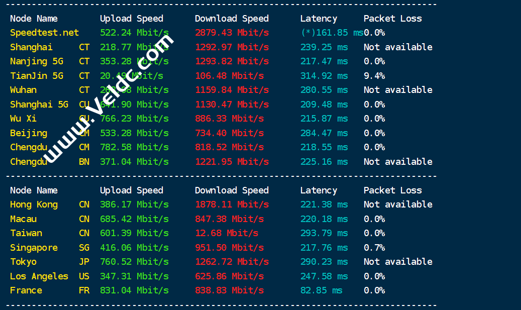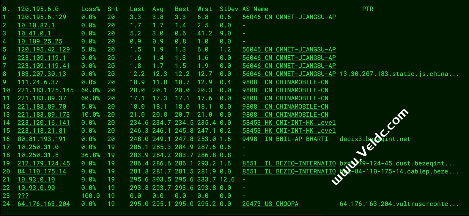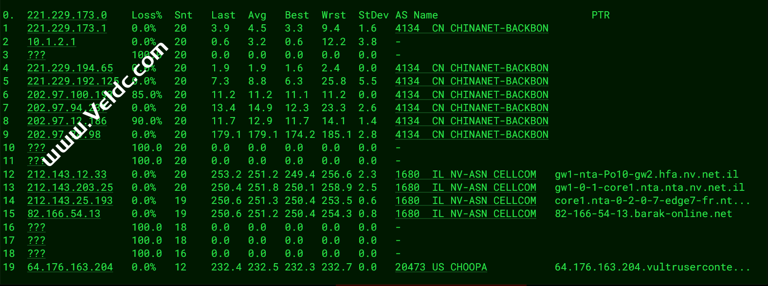 ---------------------------------------------------------------------------------- Traceroute to China, Guangzhou CT (TCP Mode, Max 30 Hop) ============================================================ traceroute to 113.108.209.1 (113.108.209.1), 30 hops max, 32 byte packets 1 * 2 100.100.200.1 0.33 ms * Shared Address 3 10.93.0.89 0.37 ms * LAN Address 4 10.93.0.5 0.55 ms * LAN Address 5 10.93.0.1 0.57 ms * LAN Address 6 10.250.3.5 50.80 ms * LAN Address 7 10.250.31.9 52.48 ms * LAN Address 8 10.250.31.11 55.21 ms * LAN Address 9 81.173.20.9 53.47 ms AS4134 Germany, Hesse, Frankfurt, cteurope.net 10 202.97.13.29 261.62 ms AS4134 China, Guangdong, Guangzhou, ChinaTelecom 11 * 12 * 13 202.97.66.153 267.60 ms AS4134 China, Guangdong, Guangzhou, ChinaTelecom 14 113.108.209.1 257.23 ms AS4134 China, Guangdong, Guangzhou, ChinaTelecom Traceroute to China, Shanghai CT (TCP Mode, Max 30 Hop) ============================================================ traceroute to 180.153.28.5 (180.153.28.5), 30 hops max, 32 byte packets 1 * 2 100.100.100.1 0.29 ms * Shared Address 3 10.93.0.77 0.88 ms * LAN Address 4 10.93.0.9 0.28 ms * LAN Address 5 10.93.0.1 0.54 ms * LAN Address 6 84.110.175.13 0.32 ms AS8551 Israel, bezeqint.net 7 212.179.124.82 0.84 ms AS8551 Israel, bezeqint.net 8 * 9 10.250.31.11 89.69 ms * LAN Address 10 * 11 81.173.20.9 53.26 ms AS4134 Germany, Hesse, Frankfurt, cteurope.net 12 * 13 * 14 101.95.88.77 237.73 ms AS4812 China, Shanghai, ChinaTelecom 15 124.74.232.66 238.12 ms AS4812 China, Shanghai, ChinaTelecom 16 124.74.232.62 224.81 ms AS4812 China, Shanghai, ChinaTelecom 17 101.227.255.46 222.90 ms AS4812 China, Shanghai, ChinaTelecom 18 101.227.255.46 218.75 ms AS4812 China, Shanghai, ChinaTelecom 19 * 20 * 21 * 22 * 23 * 24 * 25 * 26 * 27 * 28 * 29 * 30 * Traceroute to China, Beijing CT (TCP Mode, Max 30 Hop) ============================================================ traceroute to 180.149.128.9 (180.149.128.9), 30 hops max, 32 byte packets 1 * 2 100.100.100.1 1.91 ms * Shared Address 3 10.93.0.77 7.94 ms * LAN Address 4 10.93.0.13 0.30 ms * LAN Address 5 82.166.54.14 1.89 ms AS1680 Israel, cellcom.co.il 6 212.143.25.192 1.41 ms AS1680 Israel, cellcom.co.il 7 212.143.203.24 1.82 ms AS1680 Israel, cellcom.co.il 8 212.143.12.21 80.85 ms AS1680 Israel, cellcom.co.il 9 10.10.10.1 74.18 ms * LAN Address 10 80.249.212.76 80.68 ms * Netherlands, North Holland, Amsterdam, ams-ix.net 11 * 12 * 13 * 14 * 15 * 16 * 17 * 18 * 19 * 20 * 21 * 22 * 23 * 24 * 25 * 26 * 27 * 28 * 29 * 30 * Traceroute to China, Guangzhou CU (TCP Mode, Max 30 Hop) ============================================================ traceroute to 210.21.4.130 (210.21.4.130), 30 hops max, 32 byte packets 1 * 2 100.100.200.1 0.26 ms * Shared Address 3 10.93.0.85 1.06 ms * LAN Address 4 10.93.0.5 3.23 ms * LAN Address 5 10.93.0.2 0.29 ms * LAN Address 6 82.166.54.14 3.27 ms AS1680 Israel, cellcom.co.il 7 212.143.25.194 1.39 ms AS1680 Israel, cellcom.co.il 8 212.143.203.24 1.93 ms AS1680 Israel, cellcom.co.il 9 212.143.12.34 52.37 ms AS1680 Israel, cellcom.co.il 10 10.10.50.1 53.65 ms * LAN Address 11 * 12 4.69.153.125 195.44 ms AS3356 United States, California, Los Angeles, level3.com 13 4.26.1.158 316.31 ms AS3356 United States, California, Los Angeles, level3.com 14 219.158.96.29 285.88 ms AS4837 China, Guangdong, Guangzhou, ChinaUnicom 15 219.158.20.221 309.80 ms AS4837 China, Guangdong, Guangzhou, ChinaUnicom 16 219.158.8.113 273.59 ms AS4837 China, Guangdong, Guangzhou, ChinaUnicom 17 112.96.0.2 295.55 ms AS17816 China, Guangdong, Guangzhou, ChinaUnicom 18 120.80.169.118 292.20 ms AS17622 China, Guangdong, Guangzhou, ChinaUnicom 19 * 20 * 21 * 22 * 23 * 24 * 25 * 26 * 27 * 28 * 29 * 30 * Traceroute to China, Shanghai CU (TCP Mode, Max 30 Hop) ============================================================ traceroute to 58.247.8.158 (58.247.8.158), 30 hops max, 32 byte packets 1 * 2 100.100.100.1 0.31 ms * Shared Address 3 10.93.0.81 0.67 ms * LAN Address 4 10.93.0.9 3.61 ms * LAN Address 5 82.166.54.14 2.02 ms AS1680 Israel, cellcom.co.il 6 212.143.25.192 1.59 ms AS1680 Israel, cellcom.co.il 7 212.143.25.192 2.56 ms AS1680 Israel, cellcom.co.il 8 212.143.203.9 1.84 ms AS1680 Israel, cellcom.co.il 9 10.10.50.1 53.72 ms * LAN Address 10 10.10.50.1 54.00 ms * LAN Address 11 4.69.209.165 199.75 ms AS3356 United States, California, San Jose, level3.com 12 4.53.209.22 278.45 ms AS3356 United States, California, San Jose, level3.com 13 4.53.208.118 278.21 ms AS3356 United States, California, San Jose, level3.com 14 219.158.113.134 264.76 ms AS4837 China, Shanghai, ChinaUnicom 15 * 16 * 17 * 18 139.226.204.154 281.10 ms AS17621 China, Shanghai, ChinaUnicom 19 139.226.225.22 264.61 ms AS17621 China, Shanghai, ChinaUnicom 20 * 21 * 22 * 23 * 24 * 25 * 26 * 27 * 28 * 29 * 30 * Traceroute to China, Beijing CU (TCP Mode, Max 30 Hop) ============================================================ traceroute to 123.125.99.1 (123.125.99.1), 30 hops max, 32 byte packets 1 * 2 100.100.200.1 0.29 ms * Shared Address 3 10.93.0.89 0.55 ms * LAN Address 4 10.93.0.13 0.46 ms * LAN Address 5 82.166.54.14 2.14 ms AS1680 Israel, cellcom.co.il 6 212.143.25.194 1.47 ms AS1680 Israel, cellcom.co.il 7 212.143.203.9 2.17 ms AS1680 Israel, cellcom.co.il 8 212.143.12.34 52.66 ms AS1680 Israel, cellcom.co.il 9 10.10.50.1 53.62 ms * LAN Address 10 * 11 * 12 4.26.2.162 271.61 ms AS3356 United States, California, Los Angeles, level3.com 13 219.158.16.93 268.83 ms AS4837 China, Beijing, ChinaUnicom 14 219.158.16.69 264.84 ms AS4837 China, Beijing, ChinaUnicom 15 * 16 125.33.186.46 275.60 ms AS4808 China, Beijing, ChinaUnicom 17 219.232.11.202 268.69 ms AS4808 China, Beijing, ChinaUnicom 18 61.135.113.154 268.41 ms AS4808 China, Beijing, ChinaUnicom 19 * 20 * 21 * 22 * 23 * 24 * 25 * 26 * 27 * 28 * 29 * 30 * Traceroute to China, Guangzhou CM (TCP Mode, Max 30 Hop) ============================================================ traceroute to 120.196.212.25 (120.196.212.2