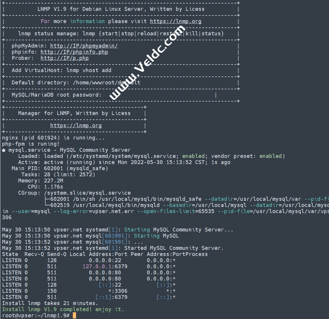 并且Nginx、MySQL、PHP都是running,80和3306端口都存在,并提示安装使用的时间及Install lnmp V1.9 completed! enjoy it.的话,说明已经安装成功。