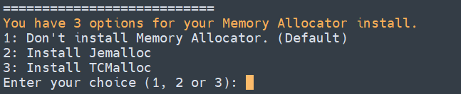 可以选择不安装、Jemalloc或TCmalloc,输入对应序号回车,直接回车为默认为不安装。