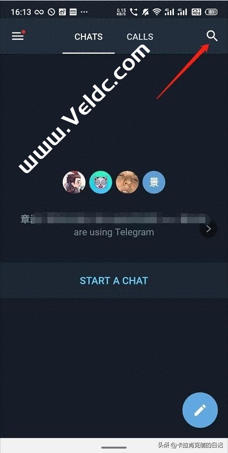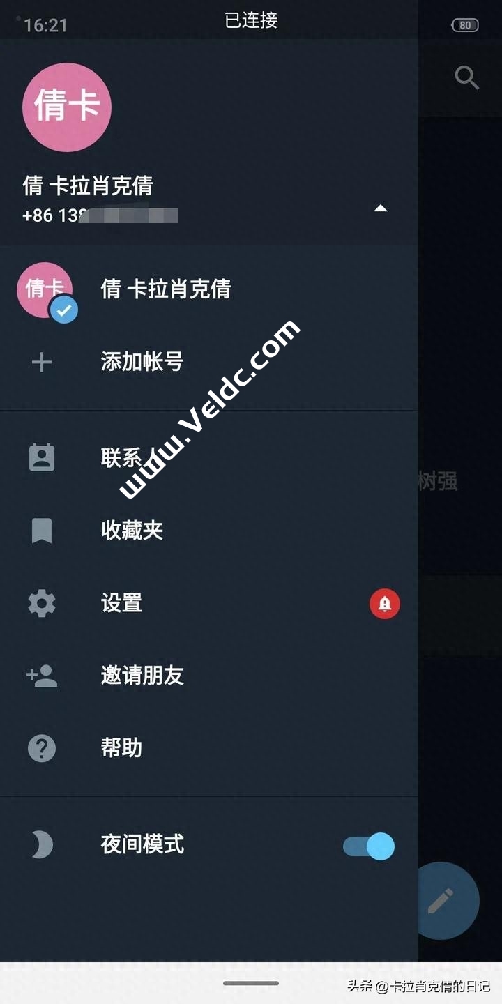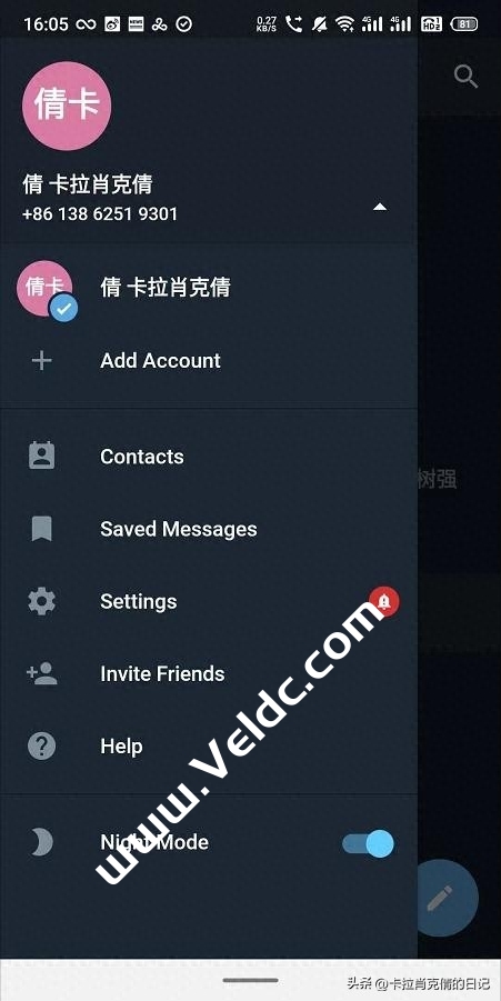 上图是Telegram X的注册完成后的英文界面,可以看到,除了在注册的时候用户名是中文的,其他的软件部分全是英文的,这个时候就开始英文变中文的操作了,其实很简单,看下图。