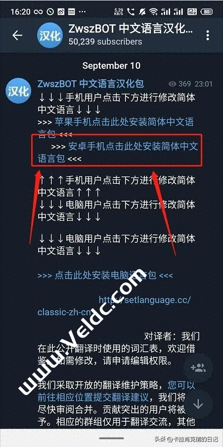 选择红框标注的频道进入,后面会发现下图的场景,点击“安卓手机中文语言包”,如果没有找到这一栏,往上翻,可能消息太多给占屏了,找到红框标注的内容后,点击进入。