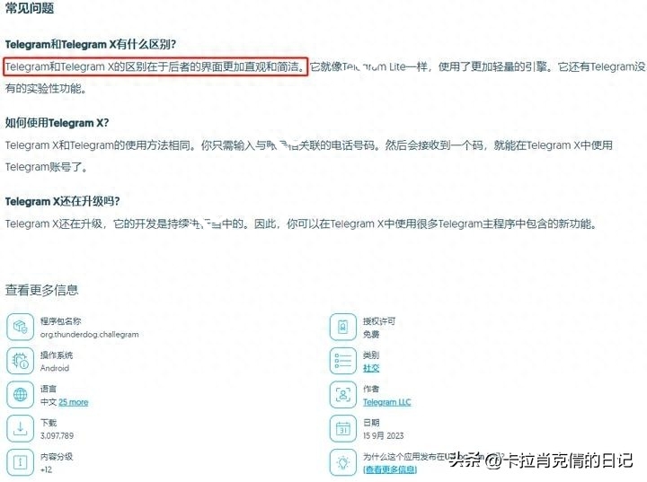 上图是官方对这两款软件的介绍,简单说就是国内大家使用的的“微信”和国际上大家使用的“WeChat”,两者都是一样的,只是语言不同而已,两个app之间都可以发信息的,但从官方的介绍看,Telegram X要比Telegram更高级一点。