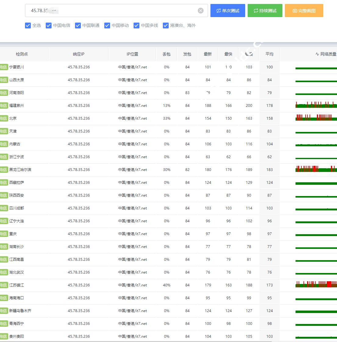 TDOG Ping工具只有在选择“持续测试”的模式下才会测试网络质量(丢包率测试),默认发送100个包,同样提供了延迟测试和丢包测试,并且包含了大量的国内检测点: