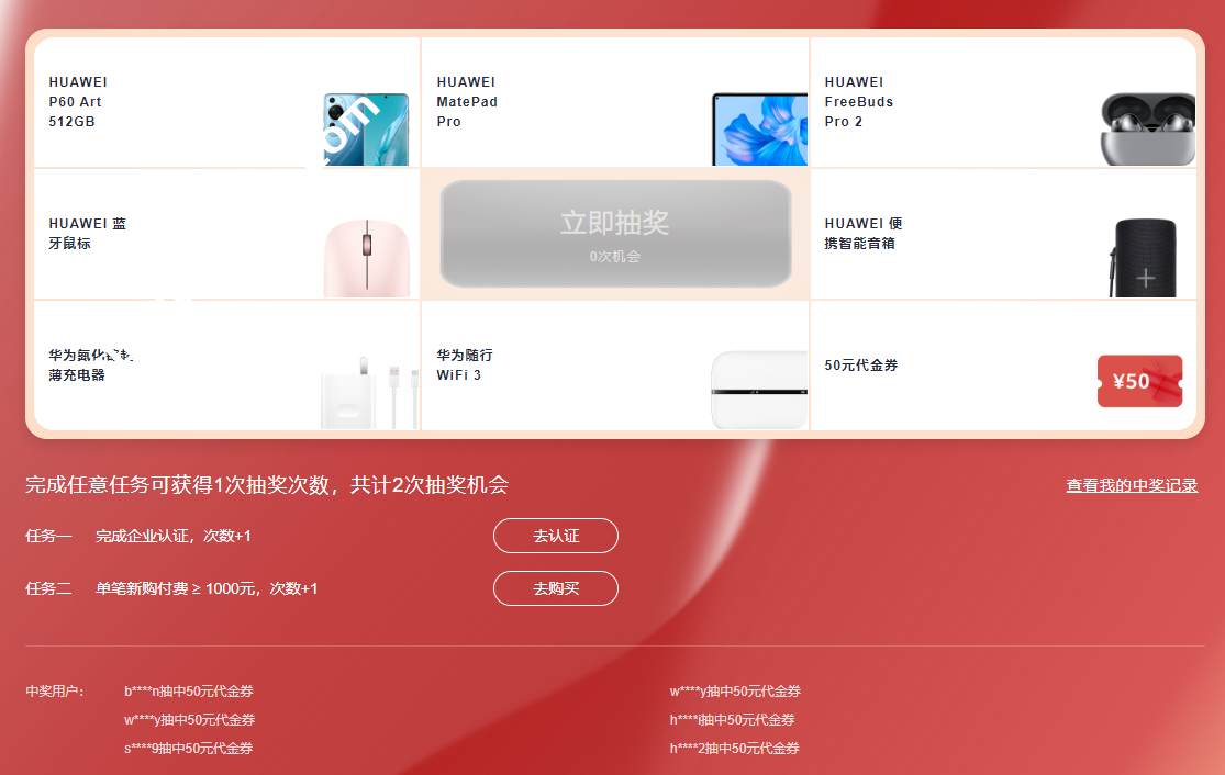 活动期间,用户完成企业认证,或单笔新购付费≥1000元,即可各获得1次抽奖机会,100%中奖!点击直达华为云11.11活动页面