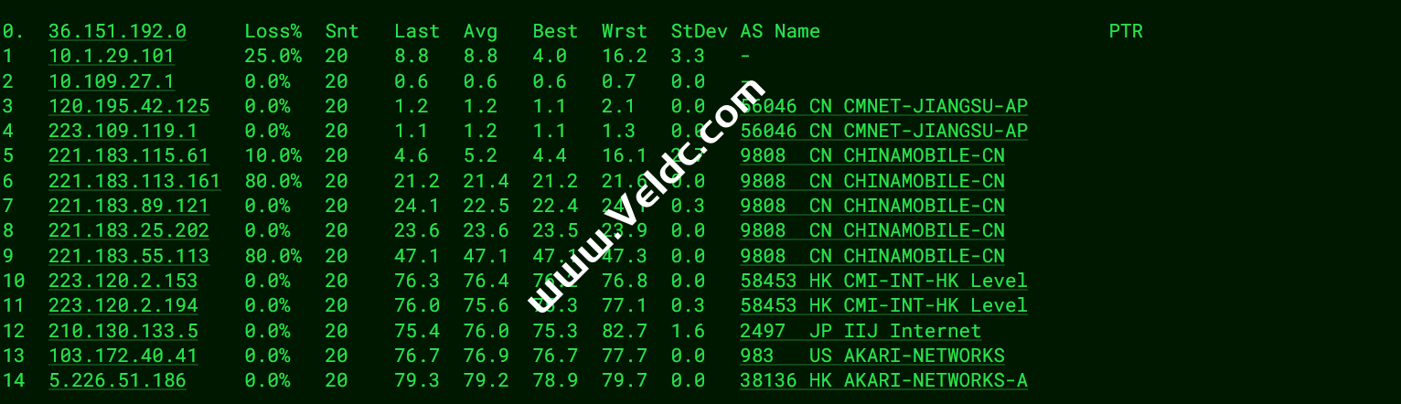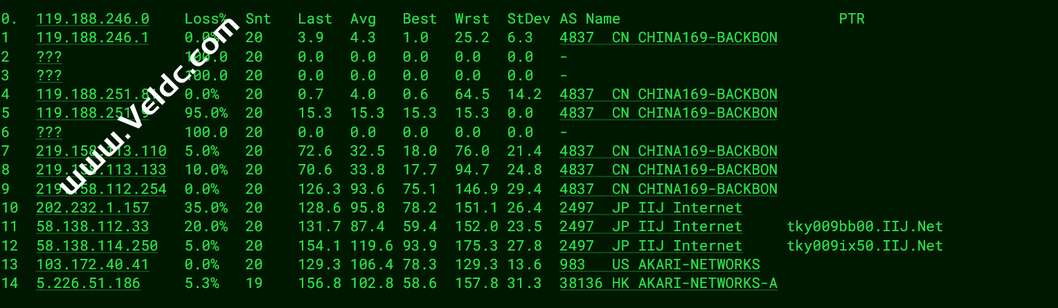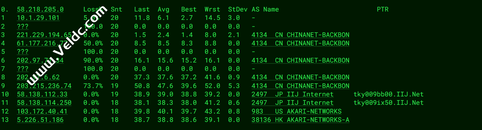 ============================================================ traceroute to 113.108.209.1 (113.108.209.1), 30 hops max, 32 byte packets 1 5.226.51.254 0.39 ms AS38136 Japan, Tokyo, parsun.com 2 210.173.169.129 1.20 ms * Japan, Tokyo, mfeed.ad.jp 3 58.138.114.229 1.45 ms AS2497 Japan, Tokyo, iij.ad.jp 4 58.138.98.237 1.61 ms AS2497 Japan, Tokyo, iij.ad.jp 5 58.138.100.54 1.27 ms AS2497 Japan, Tokyo, iij.ad.jp 6 203.215.237.9 2.33 ms * Japan, Tokyo, ChinaTelecom 7 202.97.43.5 53.10 ms AS4134 China, Guangdong, Guangzhou, ChinaTelecom 8 202.97.91.138 51.98 ms AS4134 China, Guangdong, Guangzhou, ChinaTelecom 9 * 10 * 11 113.96.5.209 62.30 ms AS58466 China, Guangdong, Guangzhou, ChinaTelecom 12 * 13 113.108.209.1 54.12 ms AS58466 China, Guangdong, Guangzhou, ChinaTelecom Traceroute to China, Shanghai CT (TCP Mode, Max 30 Hop) ============================================================ traceroute to 180.153.28.5 (180.153.28.5), 30 hops max, 32 byte packets 1 5.226.51.254 0.77 ms AS38136 Japan, Tokyo, parsun.com 2 210.173.169.129 1.16 ms * Japan, Tokyo, mfeed.ad.jp 3 58.138.114.217 1.61 ms AS2497 Japan, Tokyo, iij.ad.jp 4 58.138.98.241 1.52 ms AS2497 Japan, Tokyo, iij.ad.jp 5 58.138.100.54 1.34 ms AS2497 Japan, Tokyo, iij.ad.jp 6 203.215.237.9 2.39 ms * Japan, Tokyo, ChinaTelecom 7 * 8 * 9 * 10 * 11 * 12 222.73.35.182 32.77 ms AS4812 China, Shanghai, ChinaTelecom 13 * 14 * 15 * 16 * 17 * 18 * 19 * 20 * 21 * 22 * 23 * 24 * 25 * 26 * 27 * 28 * 29 * 30 * Traceroute to China, Beijing CT (TCP Mode, Max 30 Hop) ============================================================ traceroute to 180.149.128.9 (180.149.128.9), 30 hops max, 32 byte packets 1 5.226.51.254 3.12 ms AS38136 Japan, Tokyo, parsun.com 2 210.173.169.129 0.99 ms * Japan, Tokyo, mfeed.ad.jp 3 58.138.114.217 1.20 ms AS2497 Japan, Tokyo, iij.ad.jp 4 58.138.98.237 1.29 ms AS2497 Japan, Tokyo, iij.ad.jp 5 58.138.100.66 1.56 ms AS2497 Japan, Tokyo, iij.ad.jp 6 203.215.237.9 2.37 ms * Japan, Tokyo, ChinaTelecom 7 202.97.43.133 30.34 ms AS4134 China, Shanghai, ChinaTelecom 8 * 9 * 10 * 11 * 12 * 13 * 14 * 15 * 16 * 17 * 18 * 19 * 20 * 21 * 22 * 23 * 24 * 25 * 26 * 27 * 28 * 29 * 30 * Traceroute to China, Guangzhou CU (TCP Mode, Max 30 Hop) ============================================================ traceroute to 210.21.4.130 (210.21.4.130), 30 hops max, 32 byte packets 1 5.226.51.254 0.55 ms AS38136 Japan, Tokyo, parsun.com 2 * 3 101.203.107.85 77.82 ms * Japan, bbix.net 4 * 5 * 6 * 7 221.111.202.70 76.13 ms AS17676 China, Beijing, bbtec.net 8 219.158.115.158 69.82 ms AS4837 China, Guangdong, Guangzhou, ChinaUnicom 9 219.158.96.210 79.85 ms AS4837 China, Guangdong, Guangzhou, ChinaUnicom 10 219.158.103.217 75.78 ms AS4837 China, Guangdong, Guangzhou, ChinaUnicom 11 219.158.103.217 80.34 ms AS4837 China, Guangdong, Guangzhou, ChinaUnicom 12 120.80.91.66 79.31 ms AS17816 China, Guangdong, Guangzhou, ChinaUnicom 13 120.80.91.66 78.72 ms AS17816 China, Guangdong, Guangzhou, ChinaUnicom 14 * 15 * 16 * 17 * 18 * 19 * 20 * 21 * 22 * 23 * 24 * 25 * 26 * 27 * 28 * 29 * 30 * Traceroute to China, Shanghai CU (TCP Mode, Max 30 Hop) ============================================================ traceroute to 58.247.8.158 (58.247.8.158), 30 hops max, 32 byte packets 1 5.226.51.254 0.32 ms AS38136 Japan, Tokyo, parsun.com 2 * 3 101.203.107.81 77.24 ms * Japan, bbix.net 4 * 5 * 6 * 7 * 8 219.158.22.142 79.59 ms AS4837 China, Shanghai, ChinaUnicom 9 219.158.22.142 78.74 ms AS4837 China, Shanghai, ChinaUnicom 10 * 11 * 12 112.64.250.202 57.45 ms AS17621 China, Shanghai, ChinaUnicom 13 * 14 58.247.8.153 60.21 ms AS17621 China, Shanghai, ChinaUnicom 15 * 16 * 17 * 18 * 19 * 20 * 21 * 22 * 23 * 24 * 25 * 26 * 27 * 28 * 29 * 30 * Traceroute to China, Beijing CU (TCP Mode, Max 30 Hop) ============================================================ traceroute to 123.125.99.1 (123.125.99.1), 30 hops max, 32 byte packets 1 5.226.51.254 0.44 ms AS38136 Japan, Tokyo, parsun.com 2 * 3 101.203.107.81 77.42 ms * Japan, bbix.net 4 * 5 * 6 * 7 221.111.202.70 89.12 ms AS17676 China, Beijing, bbtec.net 8 219.158.3.137 68.70 ms AS4837 China, Beijing, ChinaUnicom 9 219.158.3.137 71.94 ms AS4837 China, Beijing, ChinaUnicom 10 * 11 61.51.169.142 63.24 ms AS4808 China, Beijing, ChinaUnicom 12 219.232.11.130 57.10 ms AS4808 China, Beijing, ChinaUnicom 13 * 14 * 15 * 16 * 17 * 18 * 19 * 20 * 21 * 22 * 23 * 24 * 25 * 26 * 27 * 28 * 29 * 30 * Traceroute to China, Guangzhou CM (TCP Mode, Max 30 Hop) ============================================================ traceroute to 120.196.212.25 (120.196.212.25), 30 hops max, 32 byte packets 1 5.226.51.254 0.64 ms AS38136 Japan, Tokyo, parsun.com 2 210.173.169.129 29.07 ms * Japan, Tokyo, mfeed.ad.jp 3 58.138.114.217 1.45 ms AS2497 Japan, Tokyo, iij.ad.jp 4 58.138.88.58 11.72 ms AS2497 Japan, Osaka, iij.ad.jp 5 58.138.81.138 60.76 ms AS2497 China, Hong Kong, iij.ad.jp 6 58.138.98.106 72.42 ms AS2497 China, Hong Kong, iij.ad.jp 7 210.130.133.10 61.82 ms AS2497 China, Hong Kong, iij.ad.jp 8 223.120.3.85 61.70 ms AS58453 China, Hong Kong, ChinaMobile 9 223.120.2.82 67.55 ms AS58453 China, Guangdong, Guangzhou, ChinaMobile 10 221.183.55.82 62.44 ms AS9808 China, Guangdong, Guangzhou, ChinaMobile 11 221.183.92.21 94.56 ms AS9808 China, Guangdong, Guangzhou, ChinaMobile 12 * 13 * 14 218.204.170.33 98.21 ms AS56040 China, Guangdong, Guangzhou, ChinaMobile 15 211.136.196.210 101.75 ms AS56040 China, Guangdong, Guangzhou, ChinaMobile 16 211.136.196.226 99.07 ms AS56040 China, Guangdong, Guangzhou, ChinaMobile 17 211.139.180.110 98.70 ms AS56040 China, Guangdong, Guangzhou, ChinaMobile 18 120.196.212.25 99.89 ms AS56040 China, Guangdong, Guangzhou, ChinaMobile Traceroute to China, Shanghai CM (TCP Mode, Max 30 Hop) ============================================================ traceroute to 221.183.55.22 (221.183.55.22), 30 hops max, 32 byte packets 1 5.226.51.254 0.56 ms AS38136 Japan, Tokyo, parsun.com 2 210.173.169.129 1.27 ms * Japan, Tokyo, mfeed.ad.jp 3 210.1