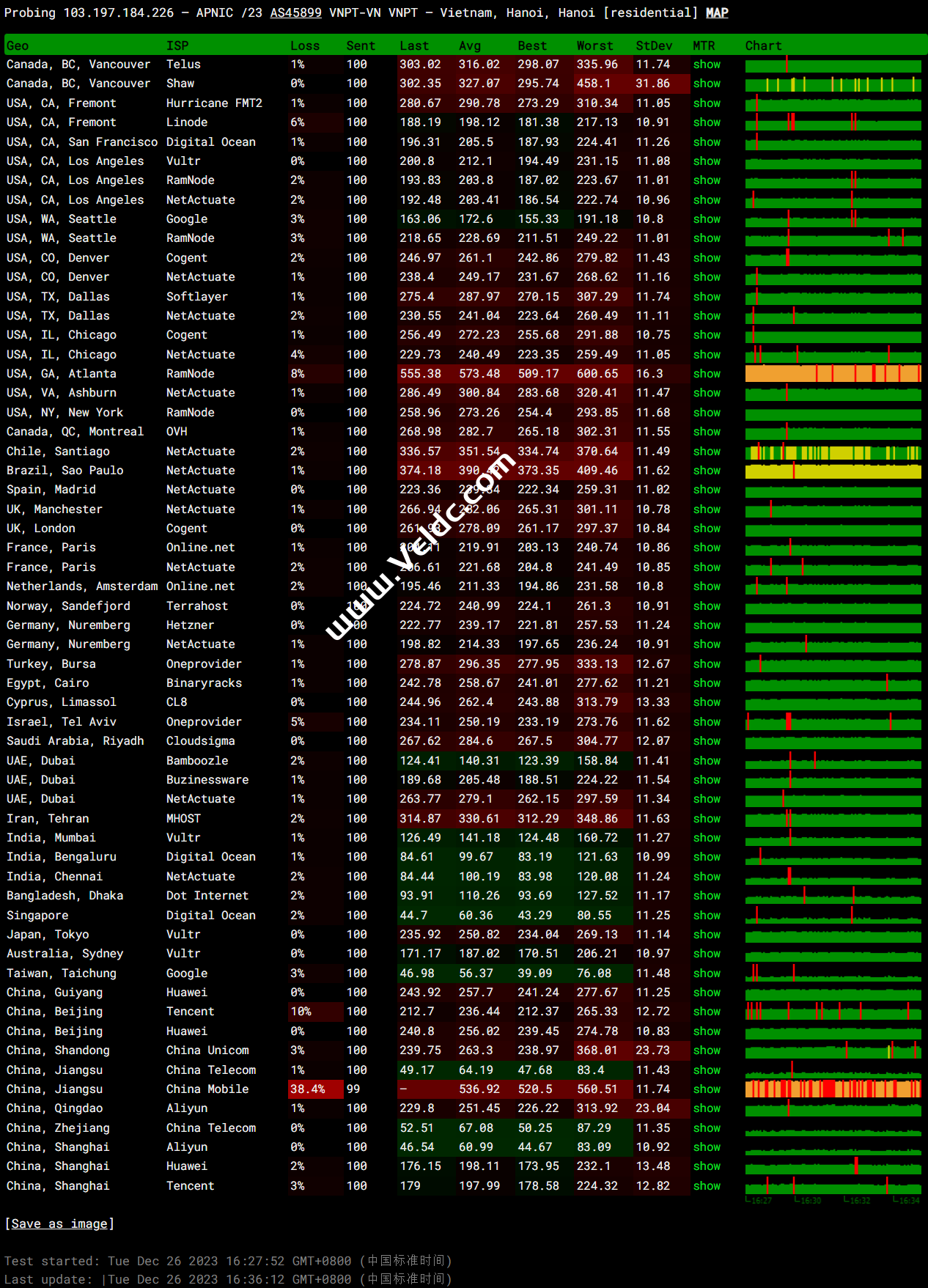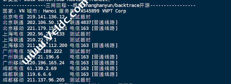 广州电信 58.60.188.222 0.52 ms AS45899 越南, 河内市, tothost.vn 38.77 ms AS45899 越南, 河内市, vnpt.vn 18.27 ms AS45899 越南, 河内市, vnpt.vn 38.22 ms AS45899 越南, 河内市, vnpt.vn 8.19 ms AS45899 越南, 河内市, vnpt.vn 51.02 ms AS4134 中国, 广东, 广州, chinatelecom.com.cn, 电信 47.45 ms AS4134 中国, 广东, 广州, chinatelecom.com.cn, 电信 55.17 ms AS4134 中国, 广东, 深圳, chinatelecom.com.cn, 电信 广州联通 210.21.196.6 0.46 ms AS45899 越南, 河内市, tothost.vn 41.67 ms AS45899 越南, 河内市, vnpt.vn 36.35 ms AS45899 越南, 河内市, vnpt.vn 69.89 ms AS45899 越南, 河内市, vnpt.vn 37.68 ms AS45899 越南, vnpt.vn 58.35 ms AS45899 中国, 香港, vnpt.vn 63.54 ms AS4134 中国, 广东, 广州, chinatelecom.com.cn, 电信 52.66 ms AS17816 中国, 广东, 深圳, chinaunicom.com, 联通 75.99 ms AS17623 中国, 广东, 深圳, chinaunicom.com, 联通 72.91 ms AS17623 中国, 广东, 深圳, chinaunicom.com, 联通 广州移动 120.196.165.24 0.97 ms AS45899 越南, 河内市, tothost.vn 34.60 ms AS45899 越南, 河内市, vnpt.vn 31.71 ms AS45899 越南, 河内市, vnpt.vn 36.92 ms AS45899 越南, vnpt.vn 44.50 ms AS45899 中国, 香港, vnpt.vn 56.45 ms AS4134 中国, 香港, chinatelecom.com.cn, 电信 54.87 ms AS4134 中国, 广东, 广州, chinatelecom.com.cn, 电信 326.25 ms AS9808 中国, 广东, 广州, chinamobile.com, 移动 55.68 ms AS9808 中国, 广东, 广州, chinamobile.com, 移动 55.18 ms AS9808 中国, 广东, 广州, chinamobile.com, 移动 55.94 ms AS56040 中国, 广东, 深圳, chinamobile.com, 移动