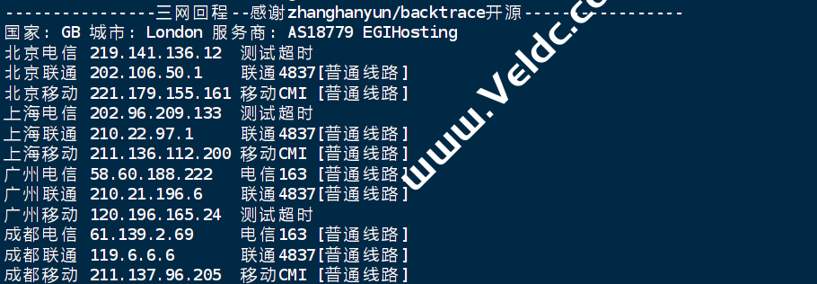 Traceroute to China, Guangzhou CT (TCP Mode, Max 30 Hop) ============================================================ traceroute to 113.108.209.1 (113.108.209.1), 30 hops max, 32 byte packets 1 5.226.136.233 1.80 ms AS25369 United Kingdom, London, zare.com 2 89.35.29.160 3.61 ms AS25369 United Kingdom, London, zare.com 3 5.226.136.11 0.96 ms AS25369 United Kingdom, London, zare.com 4 62.115.146.214 0.91 ms AS1299 United Kingdom, London, telia.com 5 62.115.14.114 2.57 ms AS1299 United Kingdom, London, telia.com 6 * 7 202.97.12.2 208.47 ms AS4134 China, Guangdong, Guangzhou, ChinaTelecom 8 * 9 113.96.5.110 219.40 ms AS58466 China, Guangdong, Guangzhou, ChinaTelecom 10 113.108.209.1 191.60 ms AS58466 China, Guangdong, Guangzhou, ChinaTelecom Traceroute to China, Shanghai CT (TCP Mode, Max 30 Hop) ============================================================ traceroute to 180.153.28.5 (180.153.28.5), 30 hops max, 32 byte packets 1 5.226.136.233 0.46 ms AS25369 United Kingdom, London, zare.com 2 89.35.29.160 17.47 ms AS25369 United Kingdom, London, zare.com 3 5.226.136.11 0.65 ms AS25369 United Kingdom, London, zare.com 4 62.115.146.214 0.84 ms AS1299 United Kingdom, London, telia.com 5 62.115.14.114 2.62 ms AS1299 United Kingdom, London, telia.com 6 * 7 202.97.33.125 177.38 ms AS4134 China, Shanghai, ChinaTelecom 8 * 9 * 10 * 11 222.73.35.186 191.96 ms AS4812 China, Shanghai, ChinaTelecom 12 * 13 * 14 * 15 * 16 * 17 * 18 * 19 * 20 * 21 * 22 * 23 * 24 * 25 * 26 * 27 * 28 * 29 * 30 * Traceroute to China, Beijing CT (TCP Mode, Max 30 Hop) ============================================================ traceroute to 180.149.128.9 (180.149.128.9), 30 hops max, 32 byte packets 1 5.226.136.233 11.14 ms AS25369 United Kingdom, London, zare.com 2 89.35.29.160 0.42 ms AS25369 United Kingdom, London, zare.com 3 5.226.136.11 0.56 ms AS25369 United Kingdom, London, zare.com 4 62.115.146.214 1.56 ms AS1299 United Kingdom, London, telia.com 5 62.115.14.114 1.63 ms AS1299 United Kingdom, London, telia.com 6 202.97.76.33 154.30 ms AS4134 China, Beijing, ChinaTelecom 7 202.97.12.101 173.57 ms AS4134 China, Beijing, ChinaTelecom 8 * 9 36.110.246.122 173.31 ms AS23724 China, Beijing, ChinaTelecom 10 * 11 * 12 * 13 * 14 * 15 * 16 * 17 * 18 * 19 * 20 * 21 * 22 * 23 * 24 * 25 * 26 * 27 * 28 * 29 * 30 * Traceroute to China, Guangzhou CU (TCP Mode, Max 30 Hop) ============================================================ traceroute to 210.21.4.130 (210.21.4.130), 30 hops max, 32 byte packets 1 5.226.136.233 13.50 ms AS25369 United Kingdom, London, zare.com 2 89.35.29.160 0.63 ms AS25369 United Kingdom, London, zare.com 3 5.226.136.11 8.35 ms AS25369 United Kingdom, London, zare.com 4 62.115.146.214 1.00 ms AS1299 United Kingdom, London, telia.com 5 62.115.122.188 12.92 ms AS1299 United Kingdom, London, telia.com 6 80.91.249.11 27.41 ms AS1299 TELIA.COM 骨干网, telia.com 7 62.115.122.139 15.85 ms AS1299 Germany, Hesse, Frankfurt, telia.com 8 62.115.132.211 18.94 ms AS1299 Germany, Hesse, Frankfurt, telia.com 9 219.158.34.241 27.95 ms AS4837 Germany, Hesse, Frankfurt, ChinaUnicom 10 219.158.14.149 188.27 ms AS4837 China, Guangdong, Guangzhou, ChinaUnicom 11 219.158.41.97 27.36 ms AS4837 Germany, Hesse, Frankfurt, ChinaUnicom 12 219.158.6.77 191.03 ms AS4837 China, Beijing, ChinaUnicom 13 * 14 120.80.175.78 182.35 ms AS17622 China, Guangdong, Guangzhou, ChinaUnicom 15 * 16 * 17 * 18 * 19 * 20 * 21 * 22 * 23 * 24 * 25 * 26 * 27 * 28 * 29 * 30 * Traceroute to China, Shanghai CU (TCP Mode, Max 30 Hop) ============================================================ traceroute to 58.247.8.158 (58.247.8.158), 30 hops max, 32 byte packets 1 5.226.136.233 22.43 ms AS25369 United Kingdom, London, zare.com 2 89.35.29.160 0.37 ms AS25369 United Kingdom, London, zare.com 3 5.226.136.11 0.78 ms AS25369 United Kingdom, London, zare.com 4 62.115.146.214 3.64 ms AS1299 United Kingdom, London, telia.com 5 62.115.122.188 1.72 ms AS1299 United Kingdom, London, telia.com 6 62.115.135.25 15.58 ms AS1299 France, Ile-de-France, Paris, telia.com 7 62.115.123.12 16.00 ms AS1299 Germany, Hesse, Frankfurt, telia.com 8 62.115.132.209 16.67 ms AS1299 Germany, Hesse, Frankfurt, telia.com 9 219.158.34.237 16.47 ms AS4837 Germany, Hesse, Frankfurt, ChinaUnicom 10 219.158.14.81 211.23 ms AS4837 China, Guangdong, Guangzhou, ChinaUnicom 11 219.158.9.238 171.98 ms AS4837 China, Beijing, ChinaUnicom 12 * 13 * 14 * 15 * 16 58.247.8.153 202.57 ms AS17621 China, Shanghai, ChinaUnicom 17 * 18 * 19 * 20 * 21 * 22 * 23 * 24 * 25 * 26 * 27 * 28 * 29 * 30 * Traceroute to China, Beijing CU (TCP Mode, Max 30 Hop) ============================================================ traceroute to 123.125.99.1 (123.125.99.1), 30 hops max, 32 byte packets 1 5.226.136.233 0.86 ms AS25369 United Kingdom, London, zare.com 2 89.35.29.160 0.52 ms AS25369 United Kingdom, London, zare.com 3 5.226.136.11 0.58 ms AS25369 United Kingdom, London, zare.com 4 62.115.146.214 0.73 ms AS1299 United Kingdom, London, telia.com 5 62.115.122.188 1.70 ms AS1299 United Kingdom, London, telia.com 6 62.115.135.25 8.18 ms AS1299 France, Ile-de-France, Paris, telia.com 7 62.115.122.139 15.68 ms AS1299 Germany, Hesse, Frankfurt, telia.com 8 62.115.124.117 15.77 ms AS1299 Germany, Hesse, Frankfurt, telia.com 9 * 10 62.115.124.117 26.89 ms AS1299 Germany, Hesse, Frankfurt, telia.com 11 219.158.34.93 27.02 ms AS4837 Germany, Hesse, Frankfurt, ChinaUnicom 12 * 13 * 14 219.158.3.9 221.81 ms AS4837 China, Guangdong, Guangzhou, ChinaUnicom 15 61.51.169.146 245.55 ms AS4808 China, Beijing, ChinaUnicom 16 61.148.158.90 201.04 ms AS4808 China, Beijing, ChinaUnicom 17 219.232.11.130 255.49 ms AS4808 China, Beijing, ChinaUnicom 18 123.125.99.1 222.77 ms AS4808 China, Beijing, ChinaUnicom Traceroute to China, Guangzhou CM (TCP Mode, Max 30 Hop) ============================================================ traceroute to 120.196.212.25 (120.196.212.25), 30 hops max, 32 byte packets 1 5.226.136.233 0.56 ms AS25369 United Kin