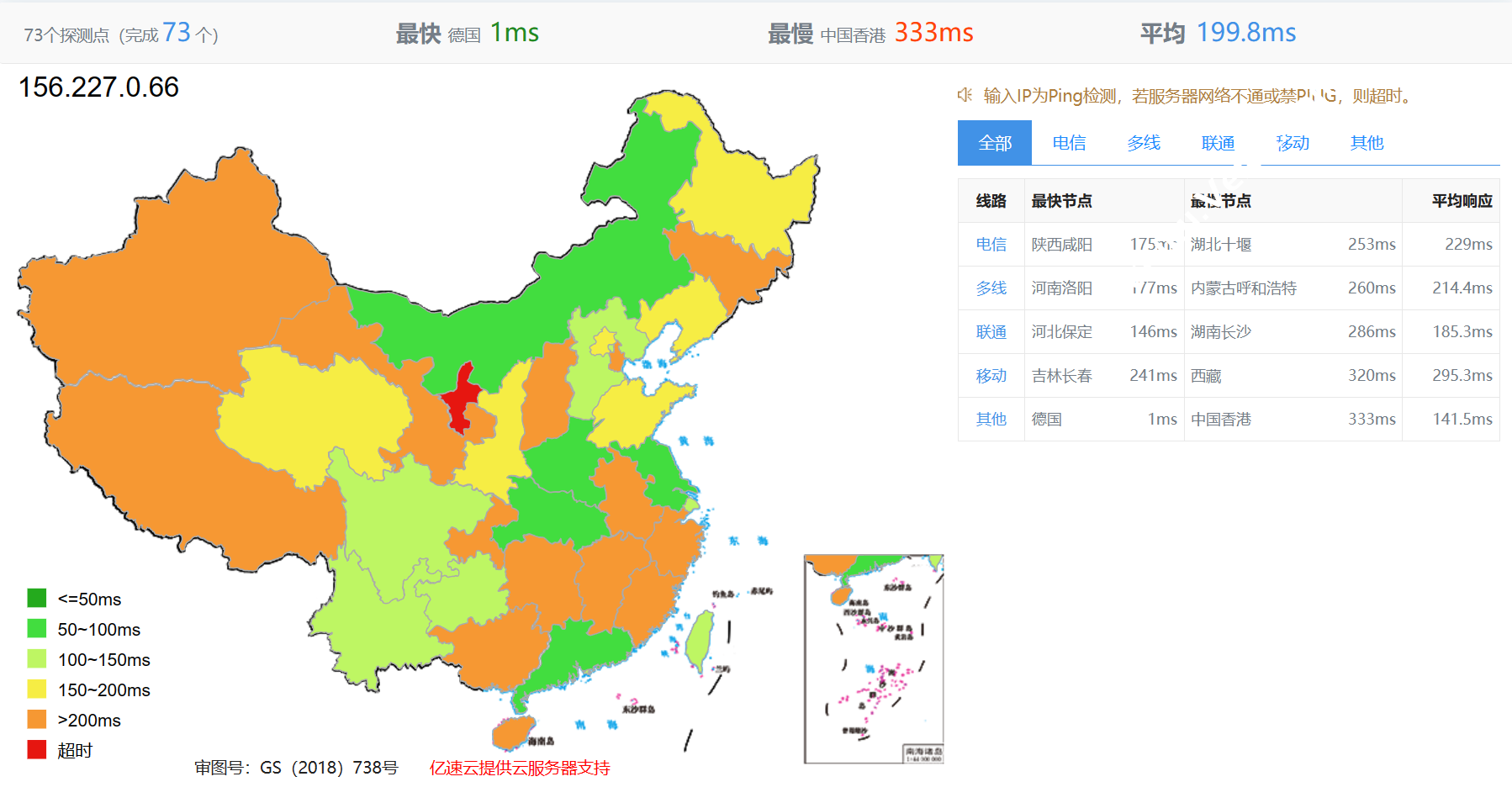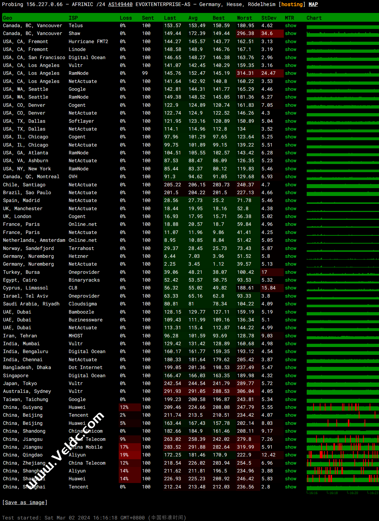 Traceroute to China, Guangzhou CT (TCP Mode, Max 30 Hop) ============================================================ traceroute to 113.108.209.1 (113.108.209.1), 30 hops max, 32 byte packets 1 156.227.0.1 2.15 ms AS149440 Germany, Hesse, Frankfurt, cloudinnovation.org 2 * 3 194.45.196.21 1.39 ms AS48314 Germany, Hesse, Frankfurt, ip-projects.de 4 45.91.100.52 15.03 ms AS48314 Germany, Hesse, Frankfurt, ip-projects.de 5 84.200.7.113 2.31 ms AS44066 Germany, Hesse, Frankfurt, first-colo.net 6 212.224.104.14 2.49 ms AS44066 Germany, Hesse, Frankfurt, first-colo.net 7 * 8 154.25.2.166 7.61 ms AS174 Germany, Hesse, Frankfurt, cogentco.com 9 149.14.210.26 2.13 ms AS174 Germany, Hesse, Frankfurt, cogentco.com 10 * 11 * 12 202.97.71.253 217.10 ms AS4134 China, Guangdong, Guangzhou, ChinaTelecom 13 113.108.209.1 230.23 ms AS58466 China, Guangdong, Guangzhou, ChinaTelecom Traceroute to China, Shanghai CT (TCP Mode, Max 30 Hop) ============================================================ traceroute to 180.153.28.5 (180.153.28.5), 30 hops max, 32 byte packets 1 156.227.0.1 0.31 ms AS149440 Germany, Hesse, Frankfurt, cloudinnovation.org 2 * 3 194.45.196.21 1.59 ms AS48314 Germany, Hesse, Frankfurt, ip-projects.de 4 45.91.100.52 12.54 ms AS48314 Germany, Hesse, Frankfurt, ip-projects.de 5 84.200.7.113 1.40 ms AS44066 Germany, Hesse, Frankfurt, first-colo.net 6 212.224.104.14 1.43 ms AS44066 Germany, Hesse, Frankfurt, first-colo.net 7 * 8 154.25.2.166 2.22 ms AS174 Germany, Hesse, Frankfurt, cogentco.com 9 149.14.210.26 22.78 ms AS174 Germany, Hesse, Frankfurt, cogentco.com 10 * 11 * 12 * 13 * 14 * 15 222.73.35.186 240.99 ms AS4812 China, Shanghai, ChinaTelecom 16 * 17 * 18 * 19 * 20 * 21 * 22 * 23 * 24 * 25 * 26 * 27 * 28 * 29 * 30 * Traceroute to China, Beijing CT (TCP Mode, Max 30 Hop) ============================================================ traceroute to 180.149.128.9 (180.149.128.9), 30 hops max, 32 byte packets 1 156.227.0.1 6.43 ms AS149440 Germany, Hesse, Frankfurt, cloudinnovation.org 2 * 3 194.45.196.21 0.59 ms AS48314 Germany, Hesse, Frankfurt, ip-projects.de 4 45.91.100.52 1.32 ms AS48314 Germany, Hesse, Frankfurt, ip-projects.de 5 84.200.7.113 2.85 ms AS44066 Germany, Hesse, Frankfurt, first-colo.net 6 212.224.104.14 1.29 ms AS44066 Germany, Hesse, Frankfurt, first-colo.net 7 62.115.161.106 1.49 ms AS1299 Germany, Hesse, Frankfurt, telia.com 8 62.115.124.118 2.48 ms AS1299 Germany, Hesse, Frankfurt, telia.com 9 62.115.122.138 21.99 ms AS1299 France, Ile-de-France, Paris, telia.com 10 62.115.135.24 16.01 ms AS1299 United Kingdom, London, telia.com 11 62.115.122.189 18.18 ms AS1299 United Kingdom, London, telia.com 12 62.115.14.114 17.74 ms AS1299 United Kingdom, London, telia.com 13 * 14 * 15 * 16 36.110.245.178 234.71 ms AS23724 China, Beijing, ChinaTelecom 17 * 18 * 19 * 20 * 21 * 22 * 23 * 24 * 25 * 26 * 27 * 28 * 29 * 30 * Traceroute to China, Guangzhou CU (TCP Mode, Max 30 Hop) ============================================================ traceroute to 210.21.4.130 (210.21.4.130), 30 hops max, 32 byte packets 1 156.227.0.1 3.92 ms AS149440 Germany, Hesse, Frankfurt, cloudinnovation.org 2 * 3 194.45.196.21 17.20 ms AS48314 Germany, Hesse, Frankfurt, ip-projects.de 4 45.91.100.52 1.27 ms AS48314 Germany, Hesse, Frankfurt, ip-projects.de 5 84.200.7.113 11.11 ms AS44066 Germany, Hesse, Frankfurt, first-colo.net 6 212.224.104.14 1.49 ms AS44066 Germany, Hesse, Frankfurt, first-colo.net 7 62.115.161.106 1.54 ms AS1299 Germany, Hesse, Frankfurt, telia.com 8 * 9 219.158.3.253 164.15 ms AS4837 China, Guangdong, Guangzhou, ChinaUnicom 10 219.158.96.206 173.69 ms AS4837 China, Guangdong, Guangzhou, ChinaUnicom 11 219.158.8.117 155.21 ms AS4837 China, Guangdong, Guangzhou, ChinaUnicom 12 157.18.0.30 168.41 ms AS17816 China, Guangdong, Guangzhou, ChinaUnicom 13 120.80.175.70 170.44 ms AS17622 China, Guangdong, Guangzhou, ChinaUnicom 14 * 15 * 16 * 17 * 18 * 19 * 20 * 21 * 22 * 23 * 24 * 25 * 26 * 27 * 28 * 29 * 30 * Traceroute to China, Shanghai CU (TCP Mode, Max 30 Hop) ============================================================ traceroute to 58.247.8.158 (58.247.8.158), 30 hops max, 32 byte packets 1 156.227.0.1 0.35 ms AS149440 Germany, Hesse, Frankfurt, cloudinnovation.org 2 * 3 194.45.196.21 0.90 ms AS48314 Germany, Hesse, Frankfurt, ip-projects.de 4 45.91.100.52 6.98 ms AS48314 Germany, Hesse, Frankfurt, ip-projects.de 5 84.200.7.113 1.20 ms AS44066 Germany, Hesse, Frankfurt, first-colo.net 6 212.224.104.14 6.14 ms AS44066 Germany, Hesse, Frankfurt, first-colo.net 7 62.115.161.106 10.82 ms AS1299 Germany, Hesse, Frankfurt, telia.com 8 * 9 219.158.14.153 145.95 ms AS4837 China, Guangdong, Guangzhou, ChinaUnicom 10 219.158.3.213 165.20 ms AS4837 China, Guangdong, Guangzhou, ChinaUnicom 11 219.158.3.97 171.03 ms AS4837 China, Guangdong, Guangzhou, ChinaUnicom 12 * 13 * 14 * 15 58.247.8.153 212.34 ms AS17621 China, Shanghai, ChinaUnicom 16 * 17 * 18 * 19 * 20 * 21 * 22 * 23 * 24 * 25 * 26 * 27 * 28 * 29 * 30 * Traceroute to China, Beijing CU (TCP Mode, Max 30 Hop) ============================================================ traceroute to 123.125.99.1 (123.125.99.1), 30 hops max, 32 byte packets 1 156.227.0.1 0.30 ms AS149440 Germany, Hesse, Frankfurt, cloudinnovation.org 2 * 3 194.45.196.21 1.27 ms AS48314 Germany, Hesse, Frankfurt, ip-projects.de 4 45.91.100.52 0.93 ms AS48314 Germany, Hesse, Frankfurt, ip-projects.de 5 84.200.7.113 1.59 ms AS44066 Germany, Hesse, Frankfurt, first-colo.net 6 212.224.104.14 1.27 ms AS44066 Germany, Hesse, Frankfurt, first-colo.net 7 * 8 154.25.2.166 1.84 ms AS174 Germany, Hesse, Frankfurt, cogentco.com 9 149.11.84.194 2.81 ms AS174 Germany, Hesse, Frankfurt, cogentco.com 10 219.158.14.145 196.00 ms AS4837 China, Guangdong, Guangzhou, ChinaUnicom 11 219.158.4.101 177.71 ms AS4837 China, Guangdong, Guangzhou, ChinaUnicom 12 219.158.3.81 179.30 ms AS4837 China, Guangdong, Guangzhou, ChinaUnicom 13 * 14 * 15 61.51.169.178 177.18 ms AS4808 China, Beijing, ChinaUn