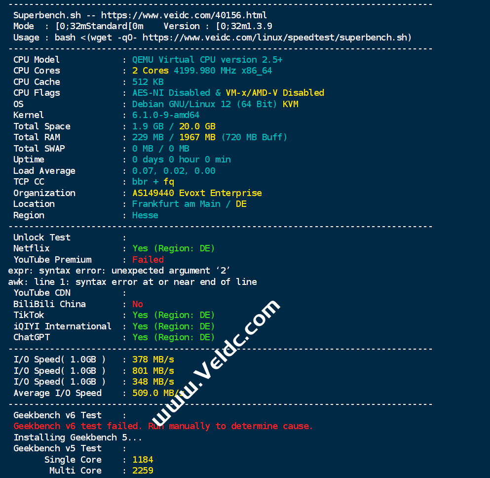 Evoxt的6个机房我们都测评了,但德国机房放在最后,因为小编觉得在国内使用德国机房网络是最为拉垮的,部分地区移动和联通用户使用体验会好一些,德国VPS可以解锁大部分流媒体服务,包括德区Netflix、Disney等,测试机器无法TikTok解锁,不排除个别IP的问题,下面是Evoxt商家的德国VPS详细测评。